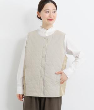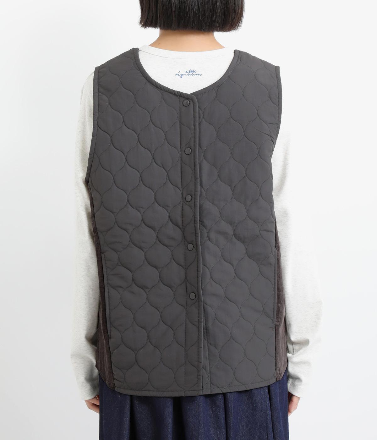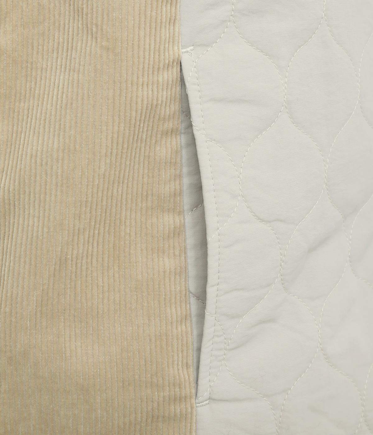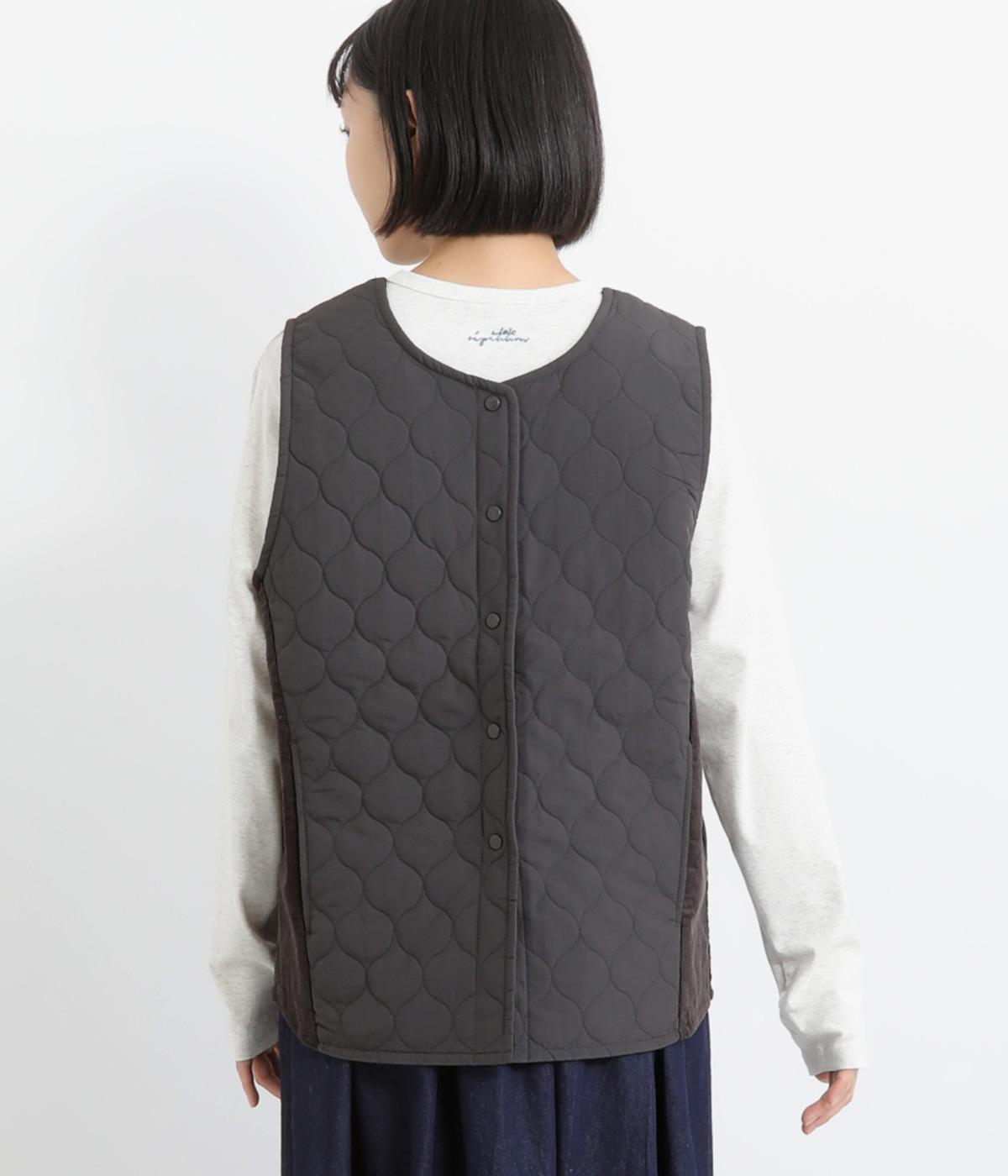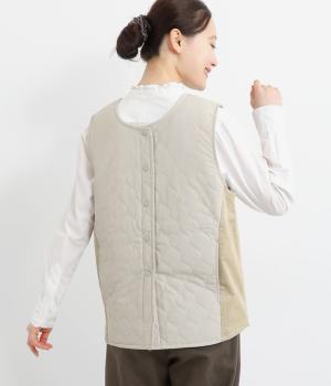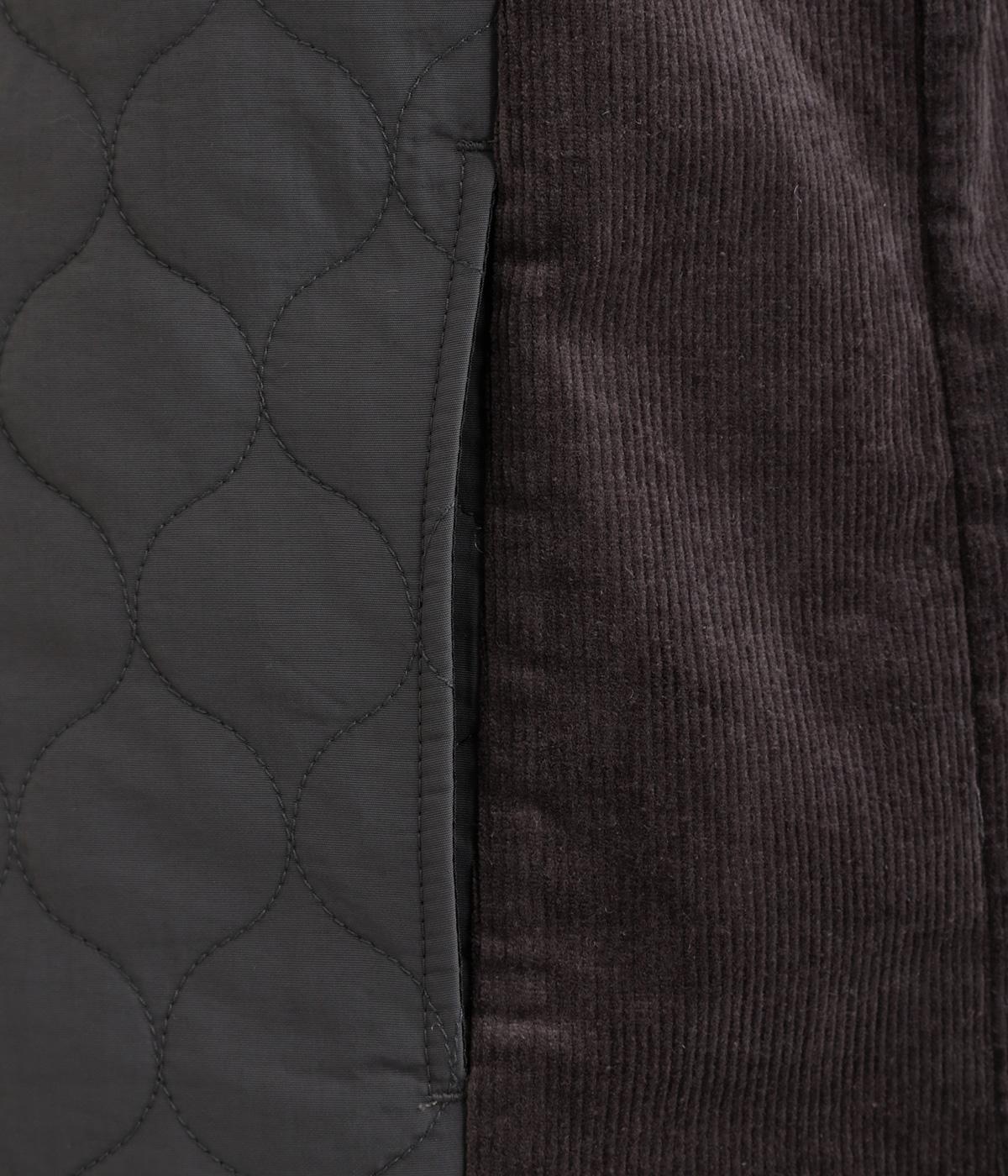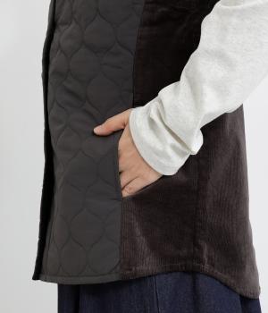 立体感のあるしっかりとした形状の2wayベスト。前身ごろと後身ごろで違う表情が楽しめる遊び心たっぷりの一着です。コーデュロイはクラシカルな印象に、ナイロンのキルティングはカジュアルな印象に。シーンによって使い分けが可能です。裾のなめらかな曲線が女性らしさを演出してくれます。