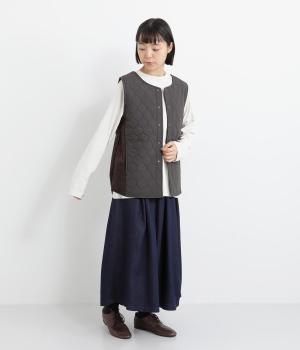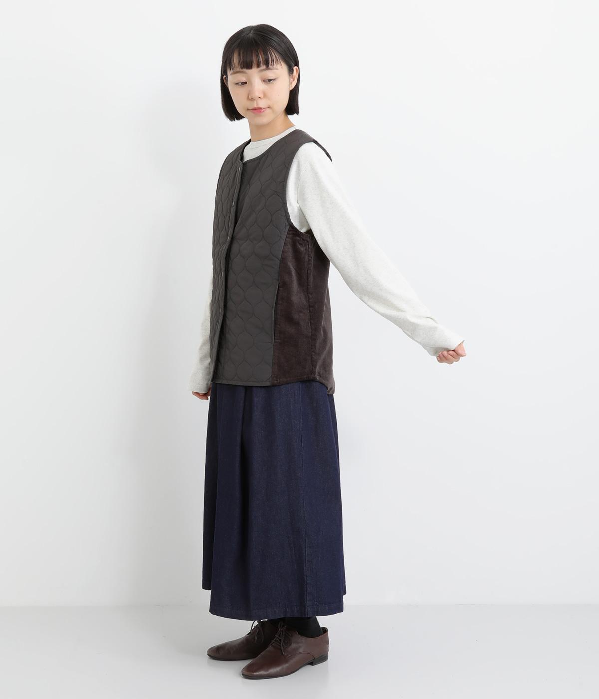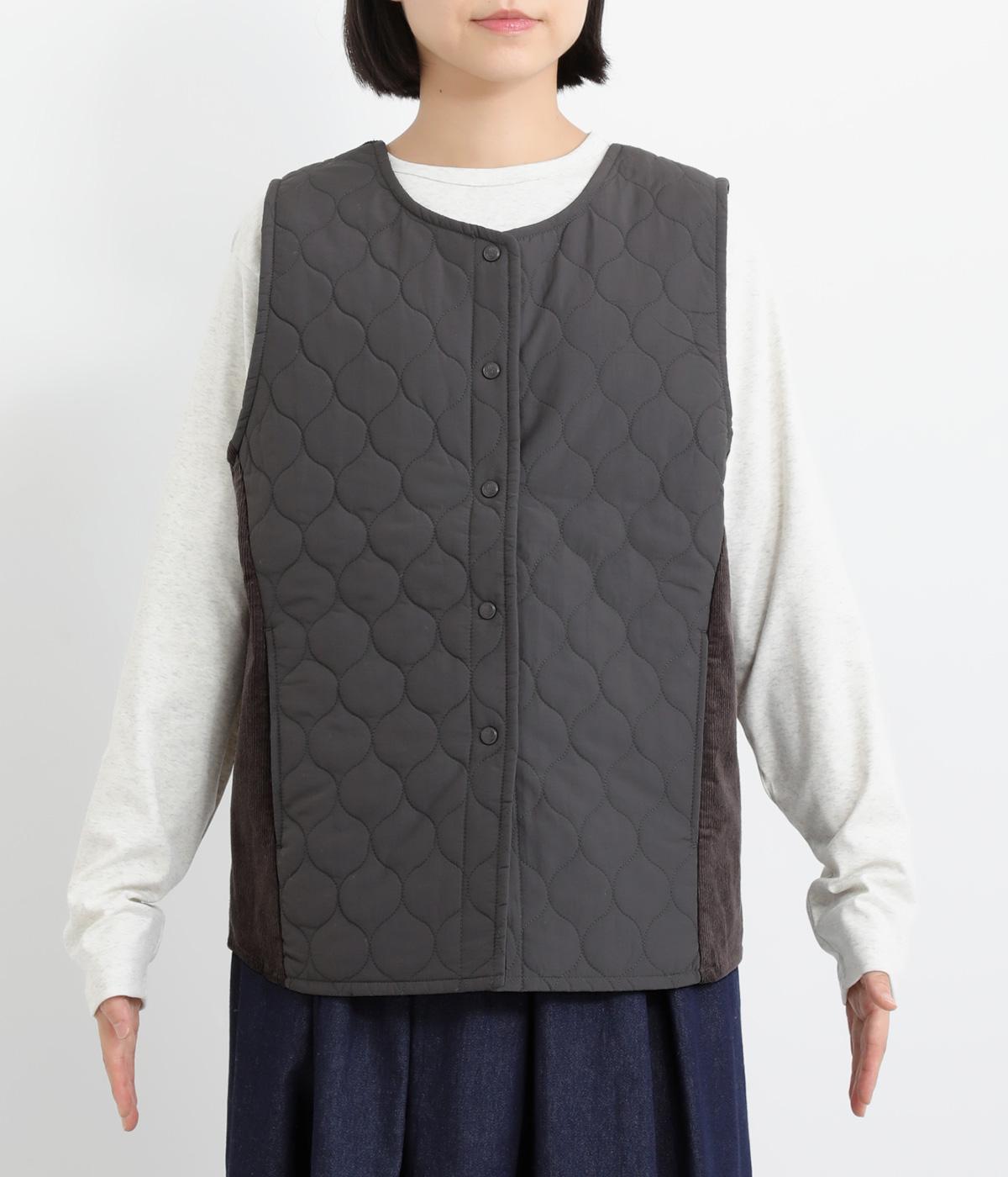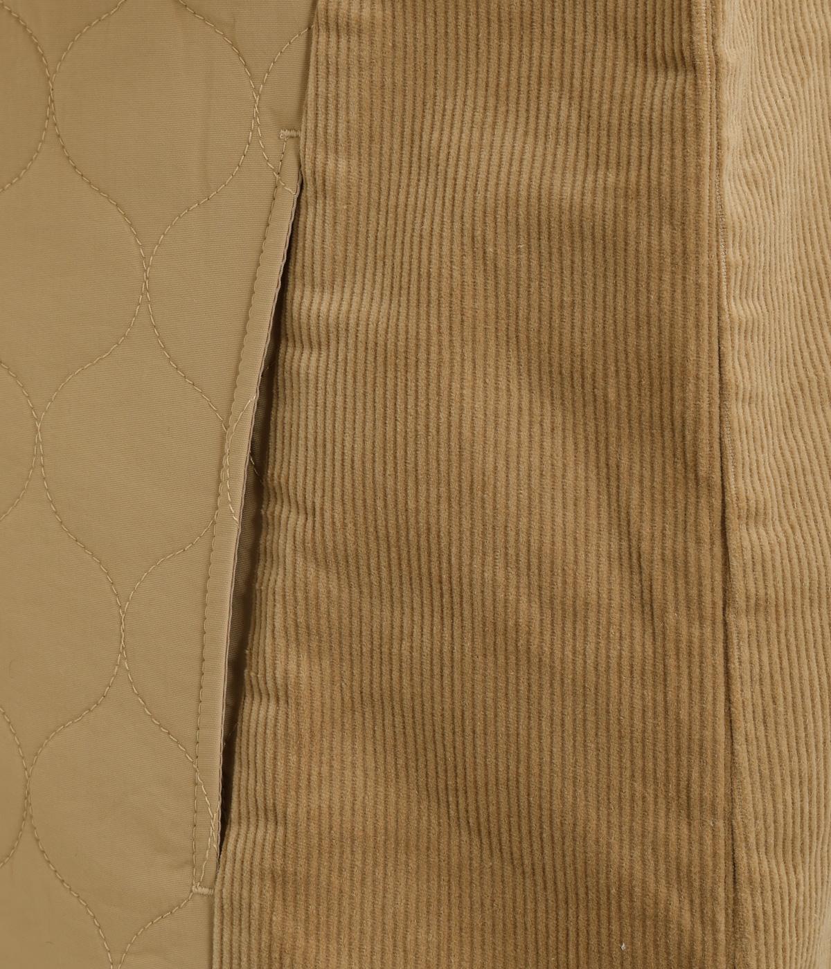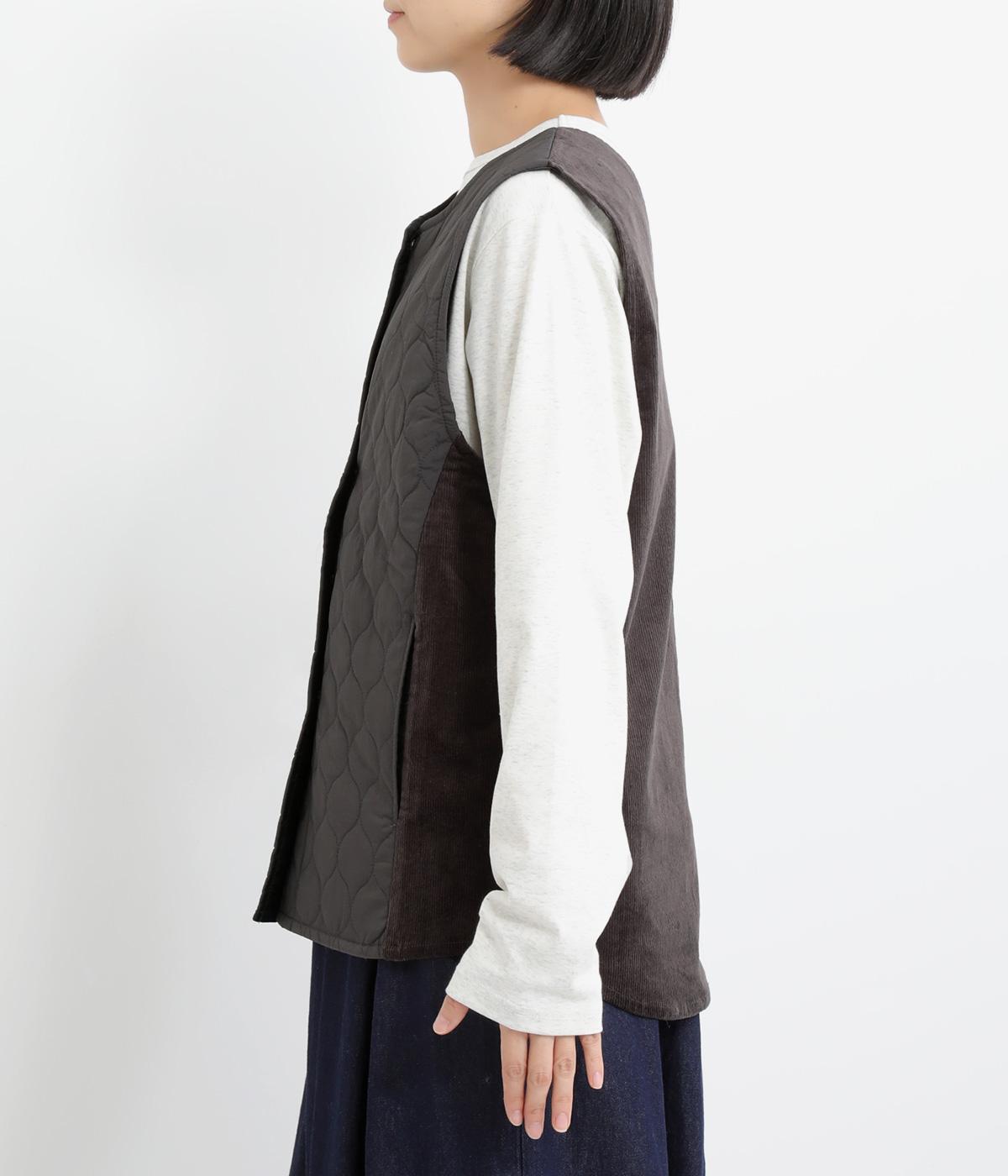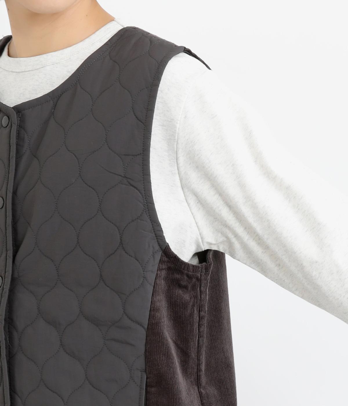 立体感のあるしっかりとした形状の2wayベスト。前身ごろと後身ごろで違う表情が楽しめる遊び心たっぷりの一着です。コーデュロイはクラシカルな印象に、ナイロンのキルティングはカジュアルな印象に。シーンによって使い分けが可能です。裾のなめらかな曲線が女性らしさを演出してくれます。