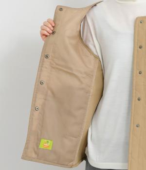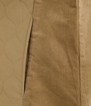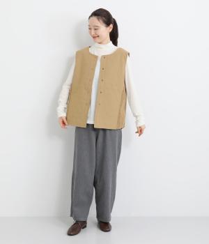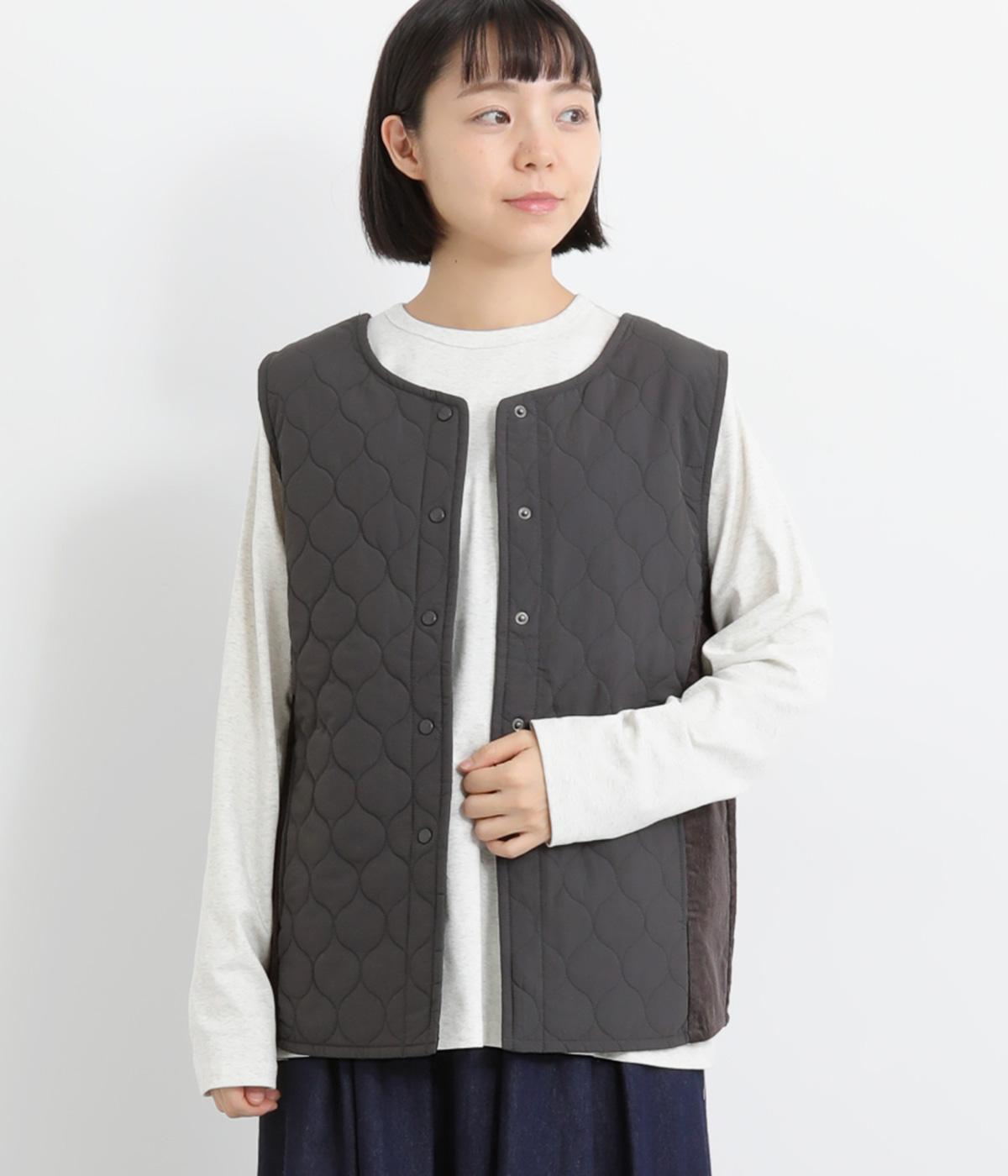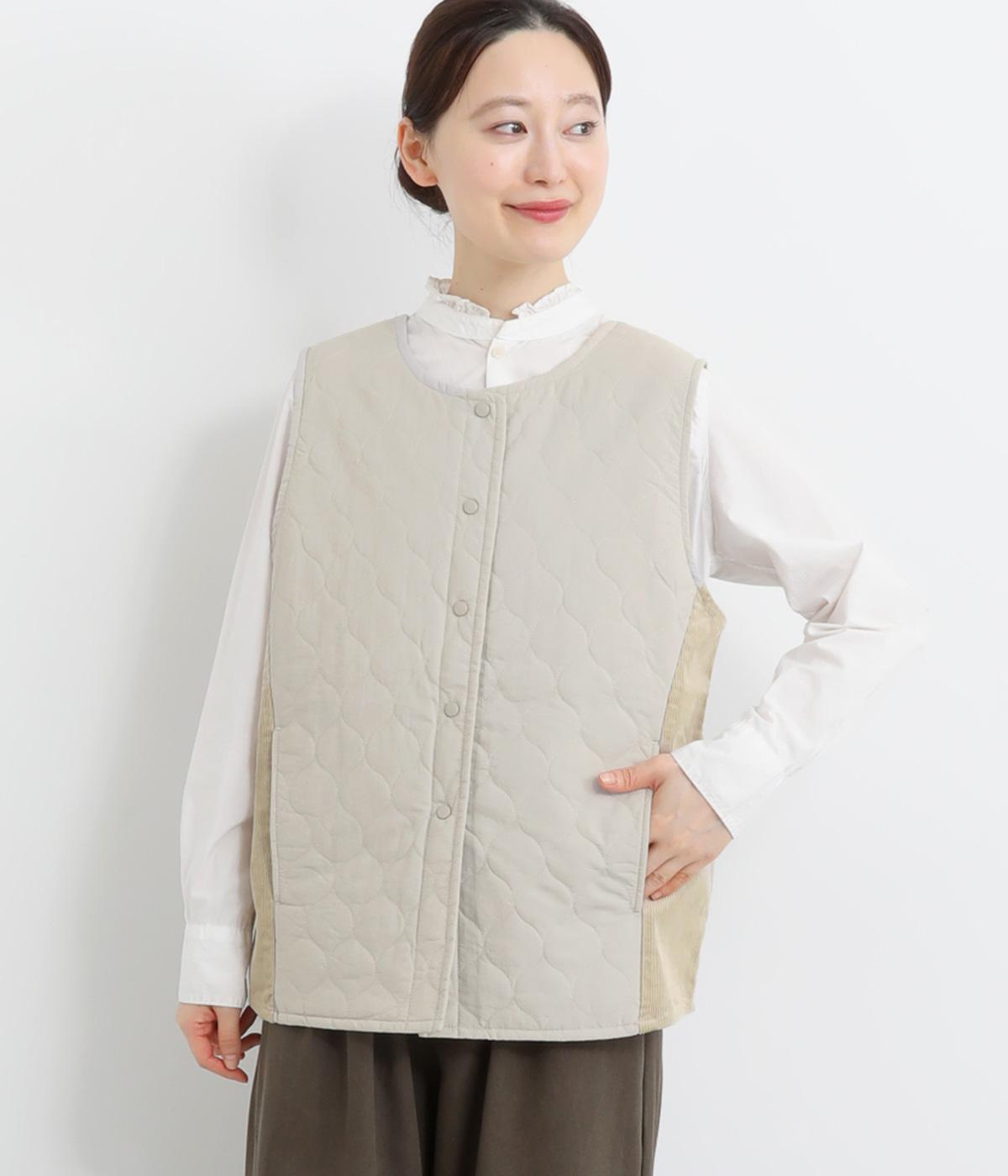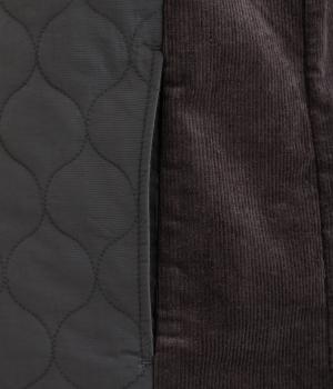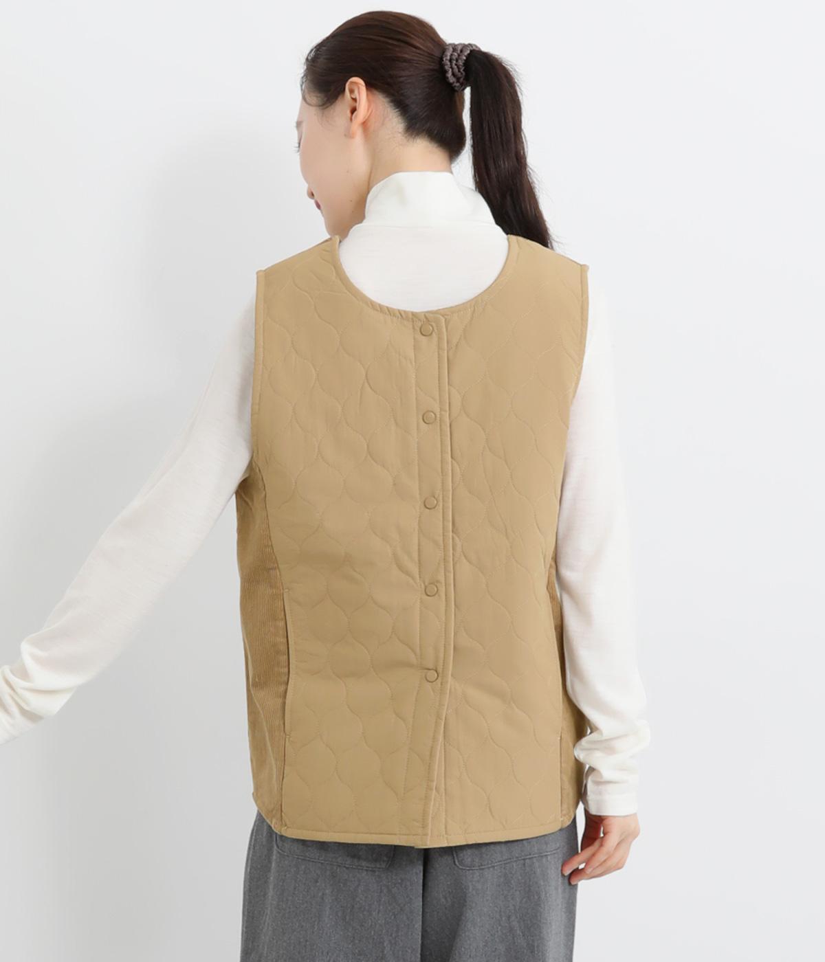 シャリ感のあるナイロン素材に、やわらかなコーデュロイとのコントラストが魅力的。裏地もしっかりと付いていて保温性も抜群。生地の違いを楽しめるベストです。