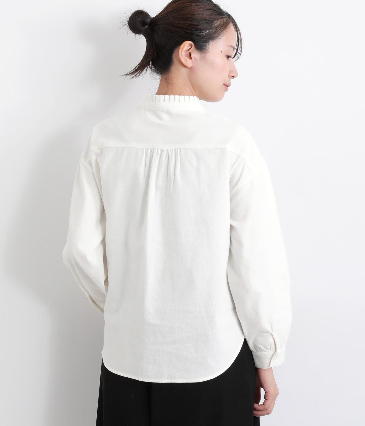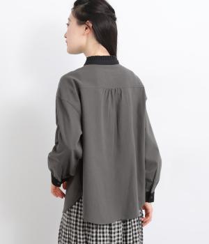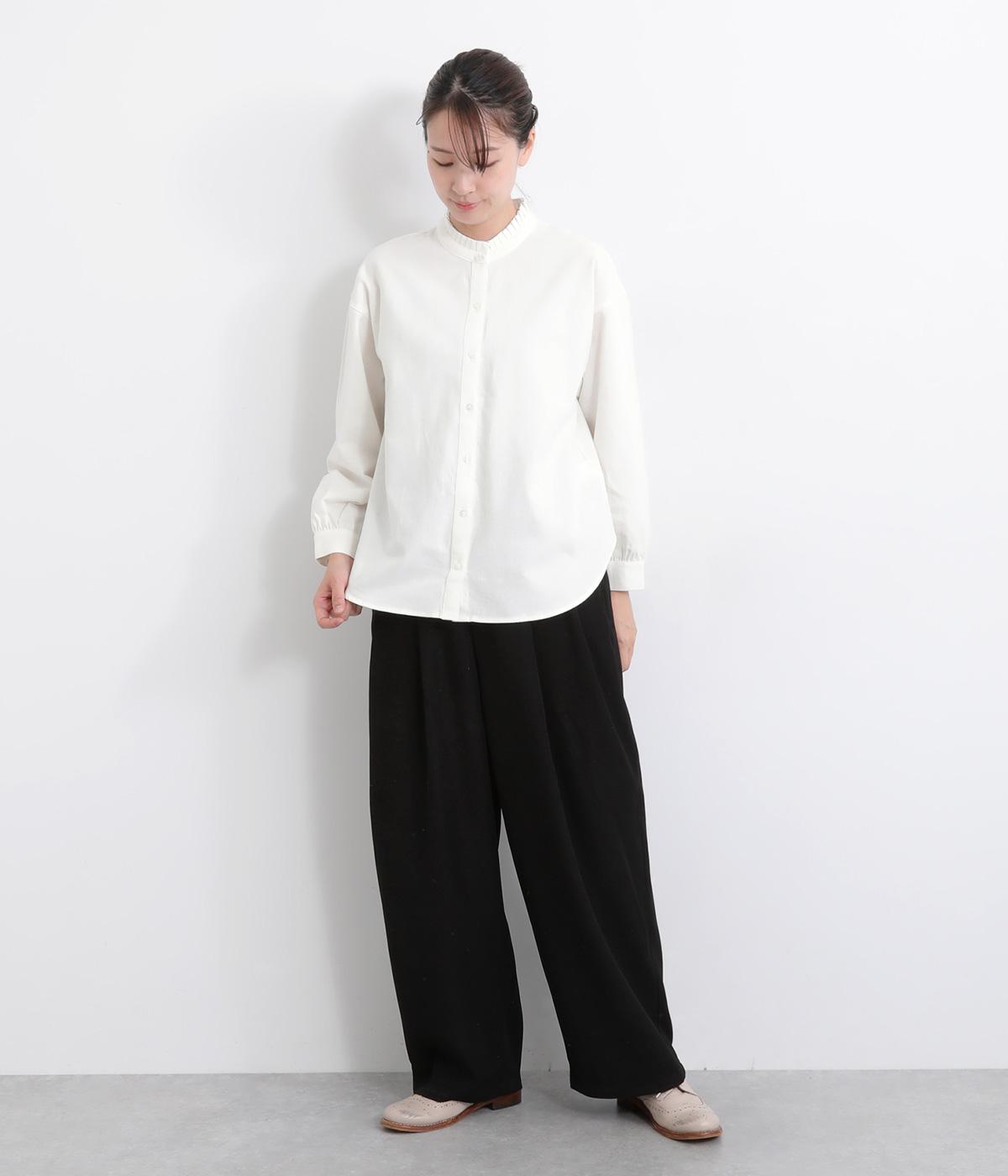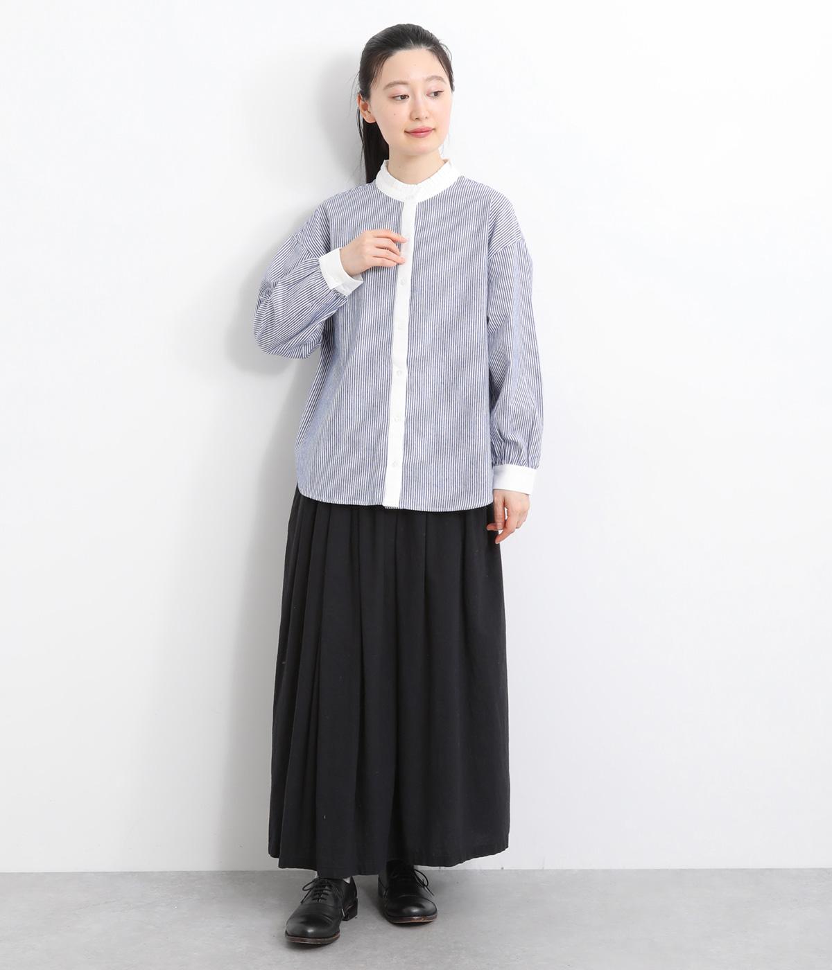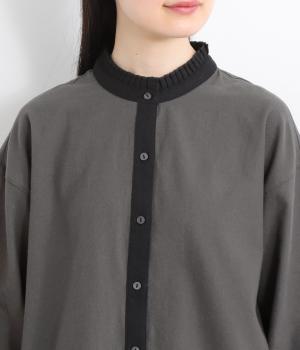 ゆるやかにふくらんだ袖や襟のタックフリルでさり気なくガーリー要素を取り入れた一枚。すっきりとした身幅にラウンドヘムでトップスアウトの着こなしもさまになります。後ろギャザーで窮屈感も軽減。