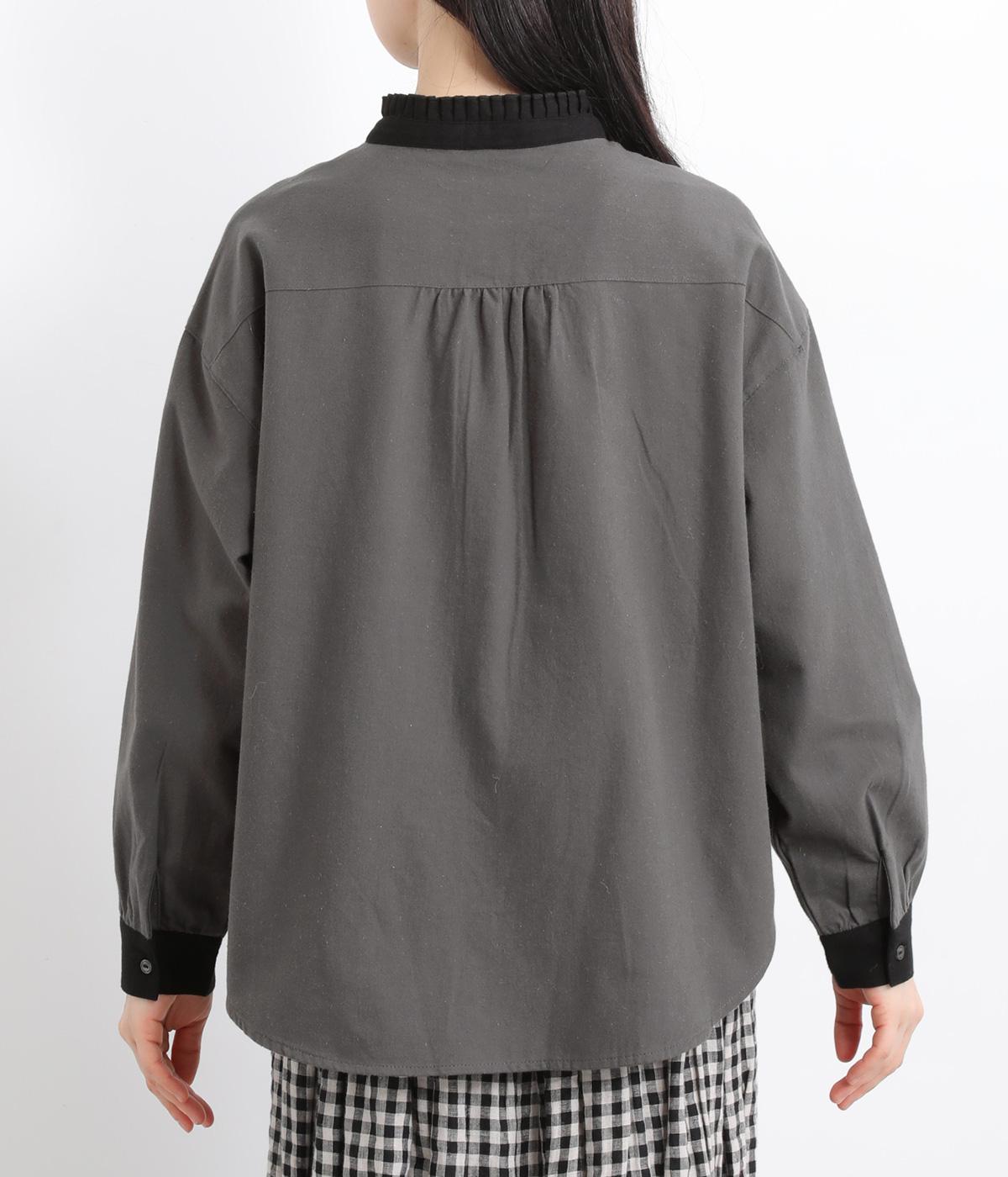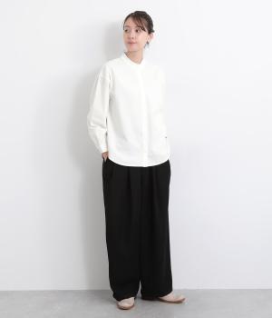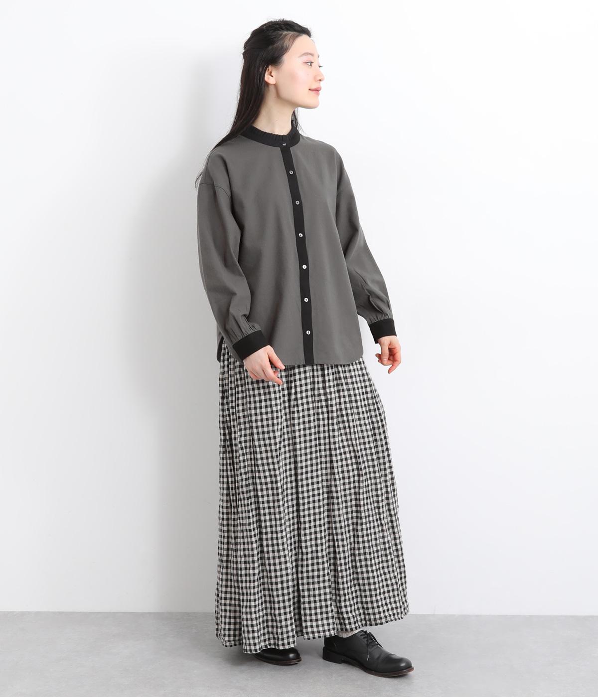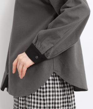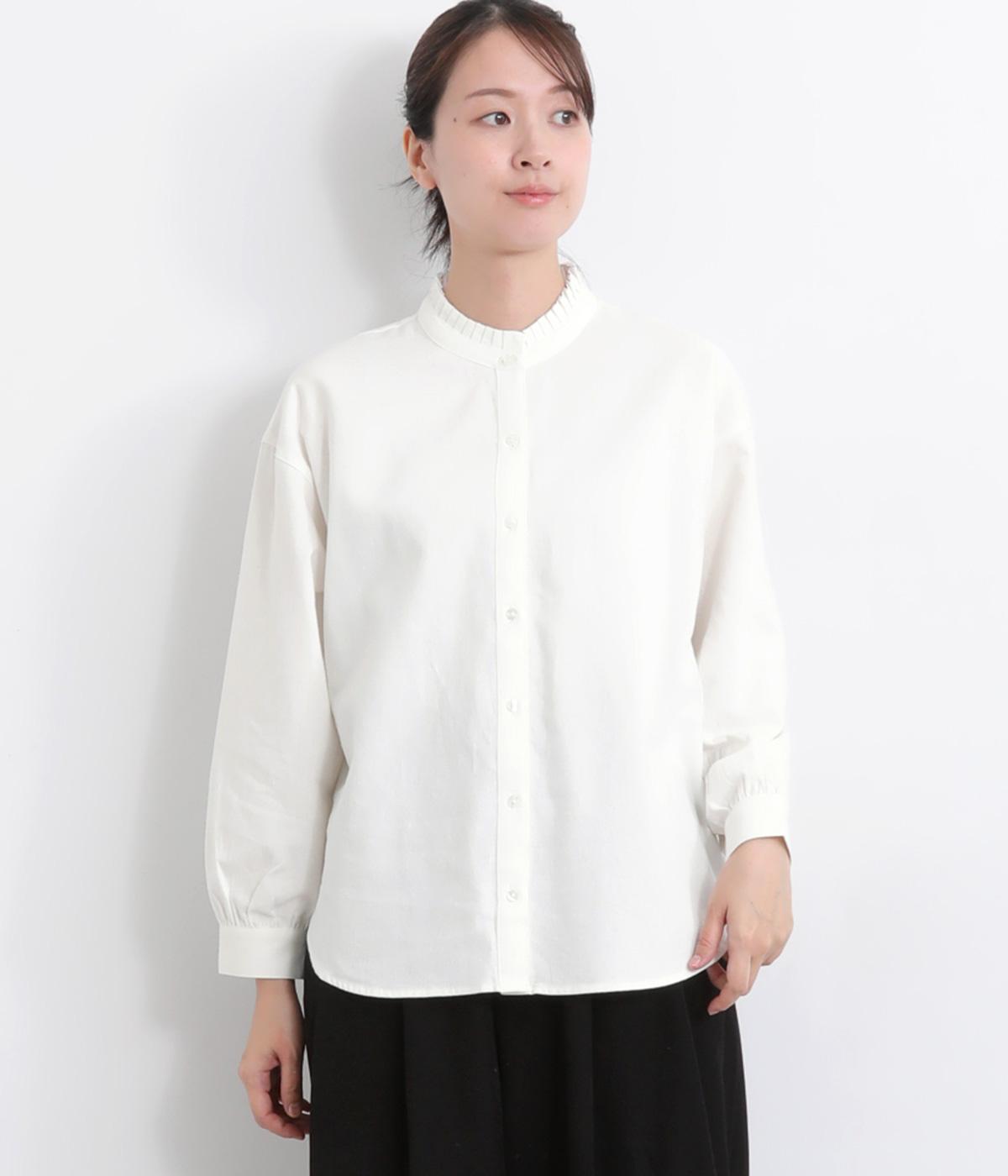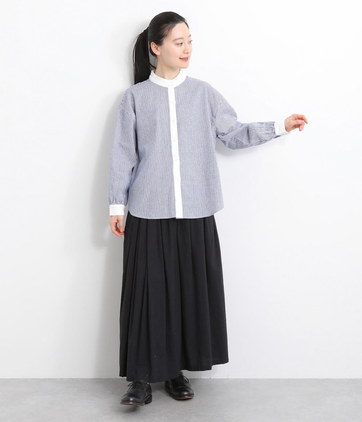 ゆるやかにふくらんだ袖や襟のタックフリルでさり気なくガーリー要素を取り入れた一枚。すっきりとした身幅にラウンドヘムでトップスアウトの着こなしもさまになります。後ろギャザーで窮屈感も軽減。