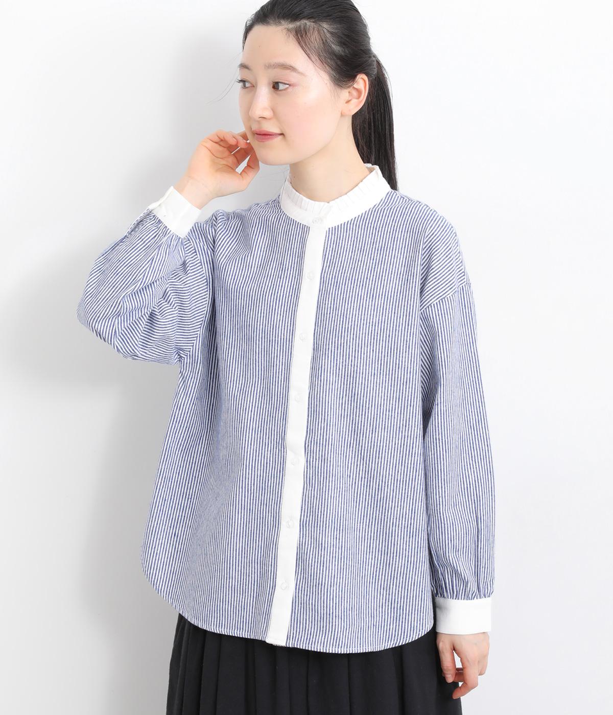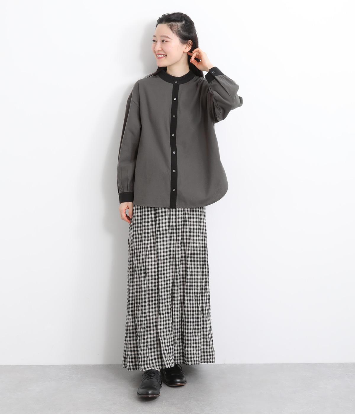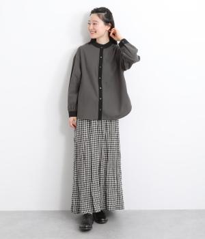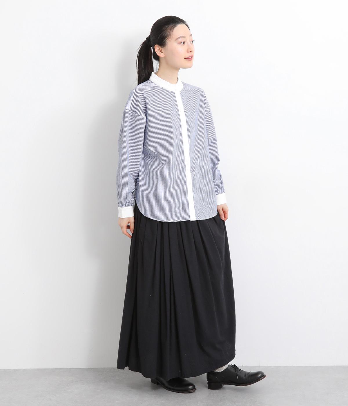 ゆるやかにふくらんだ袖や襟のタックフリルでさり気なくガーリー要素を取り入れた一枚。すっきりとした身幅にラウンドヘムでトップスアウトの着こなしもさまになります。後ろギャザーで窮屈感も軽減。