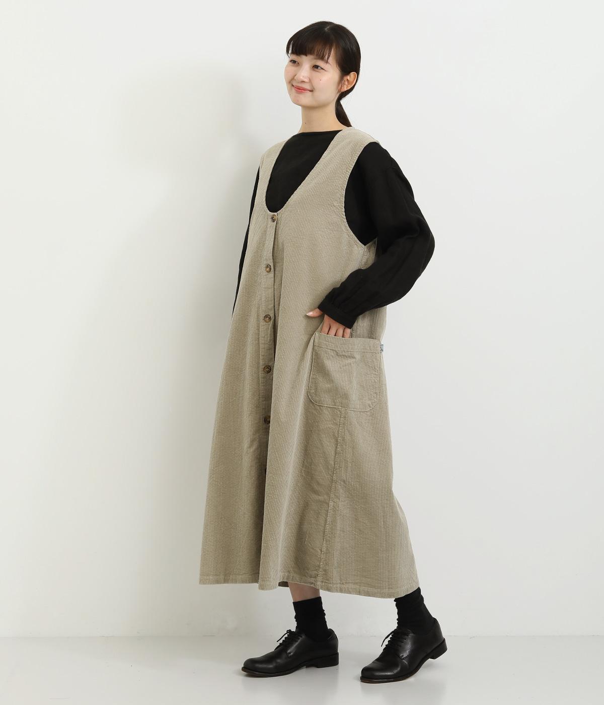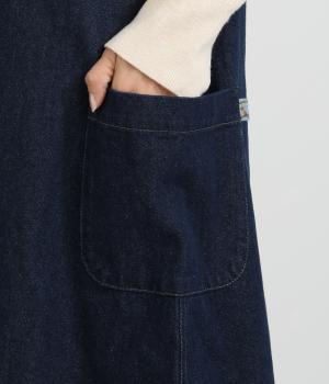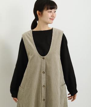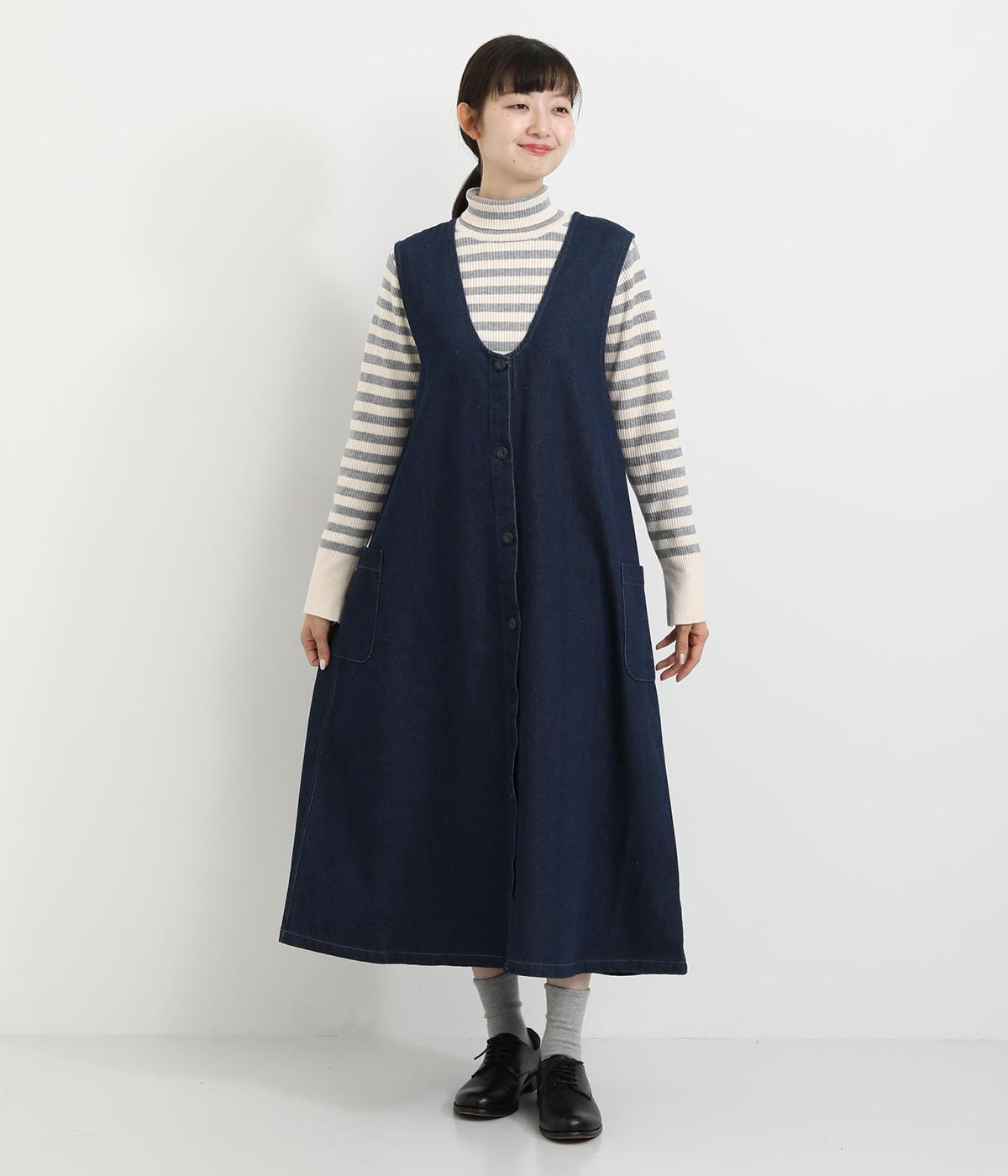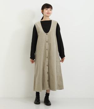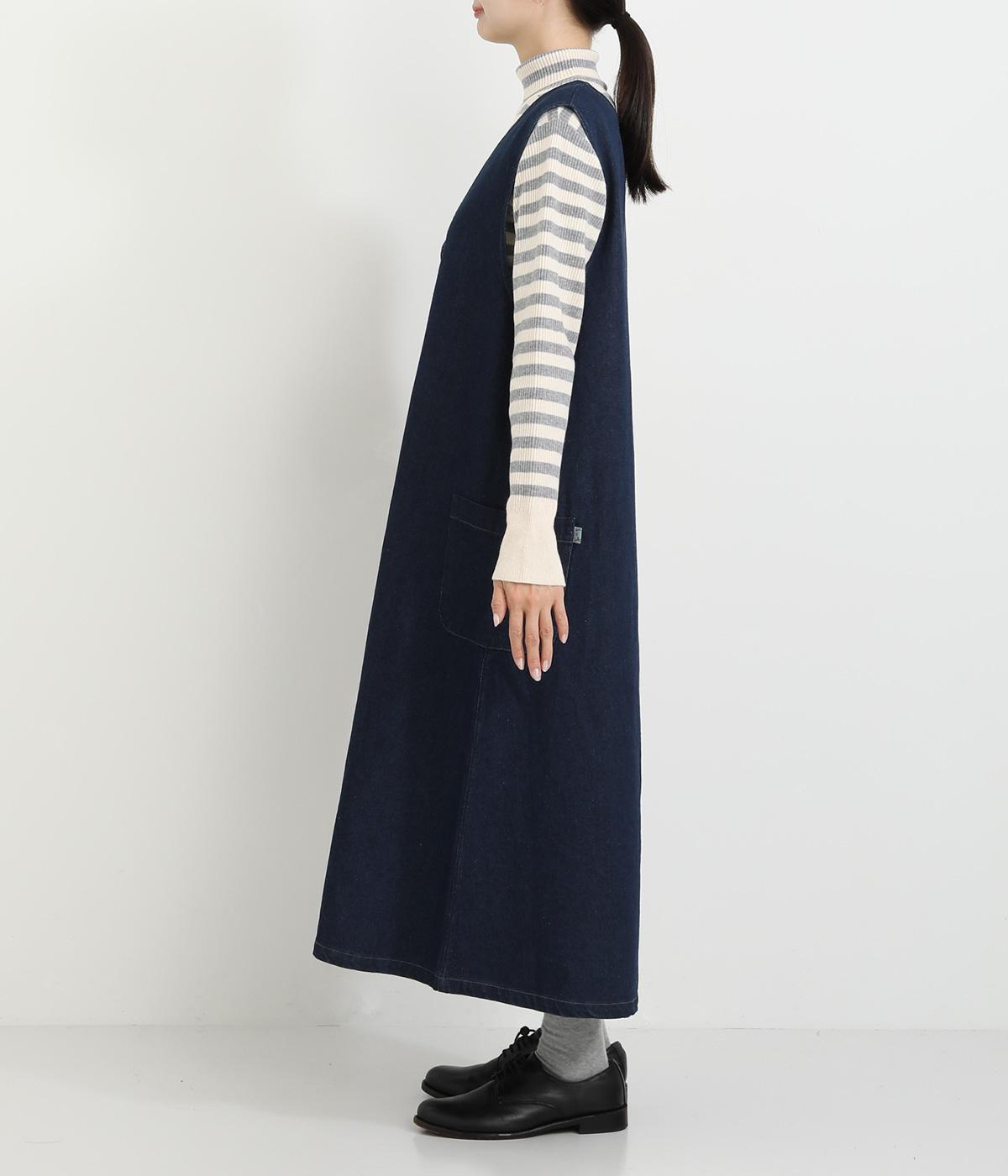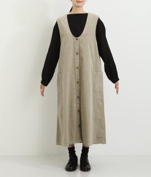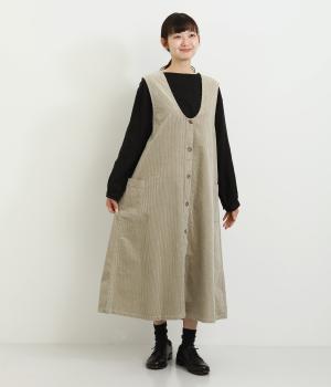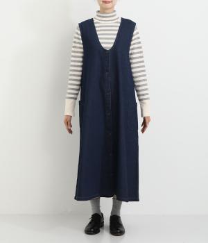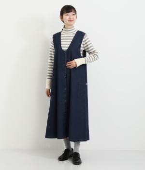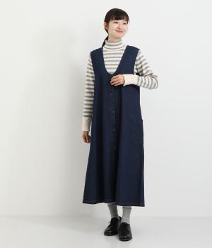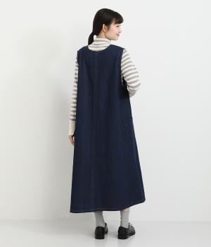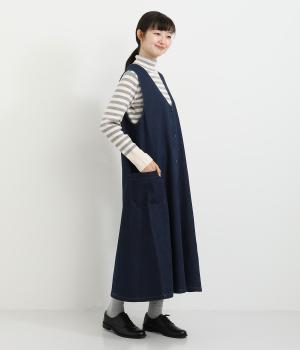 大きなポケットがカジュアルな印象のジャンパースカートです。餌をついばむ鳥をあしらったピスネームがさりげないアクセントになっています。深めのVネックが首周りをすっきりさせ、さまざまなインナーと合わせやすく仕上げました。