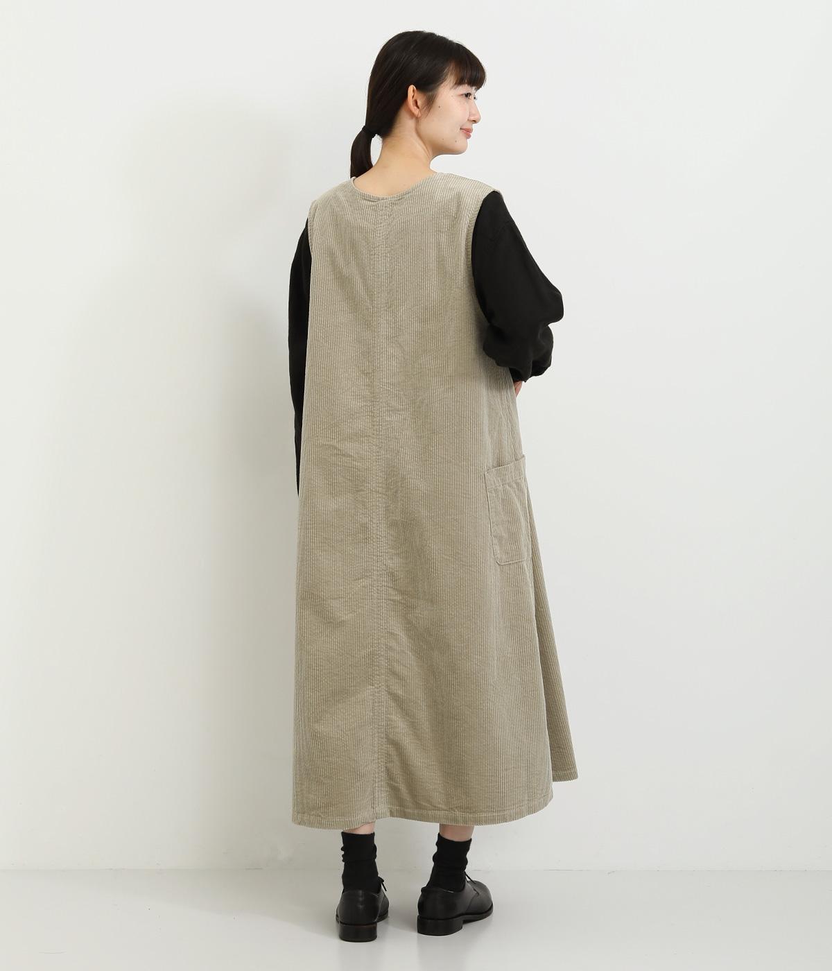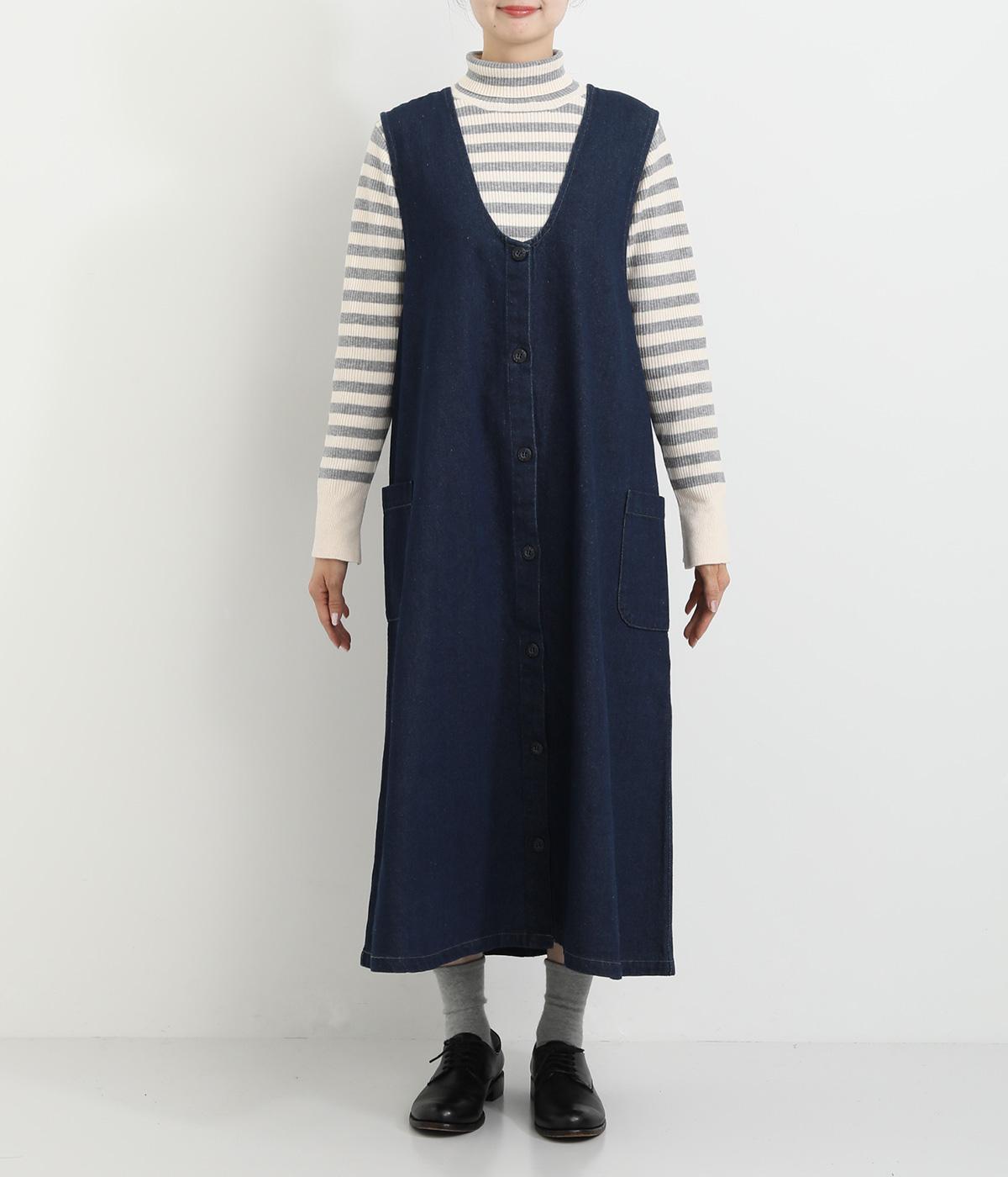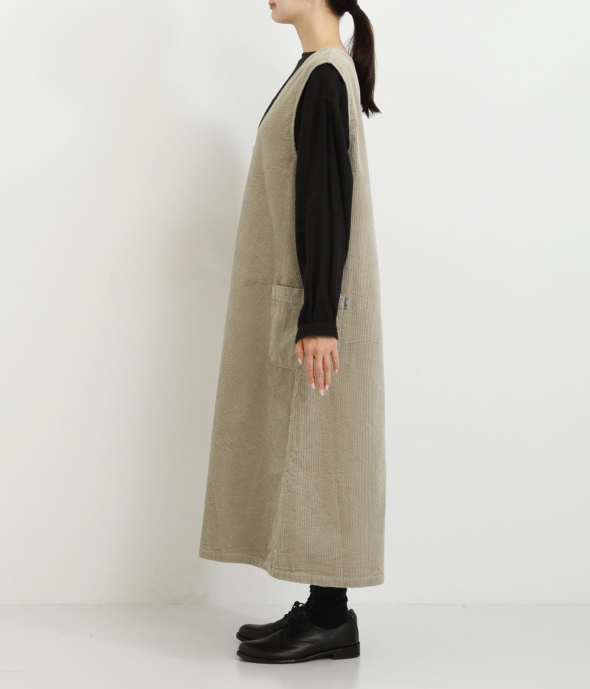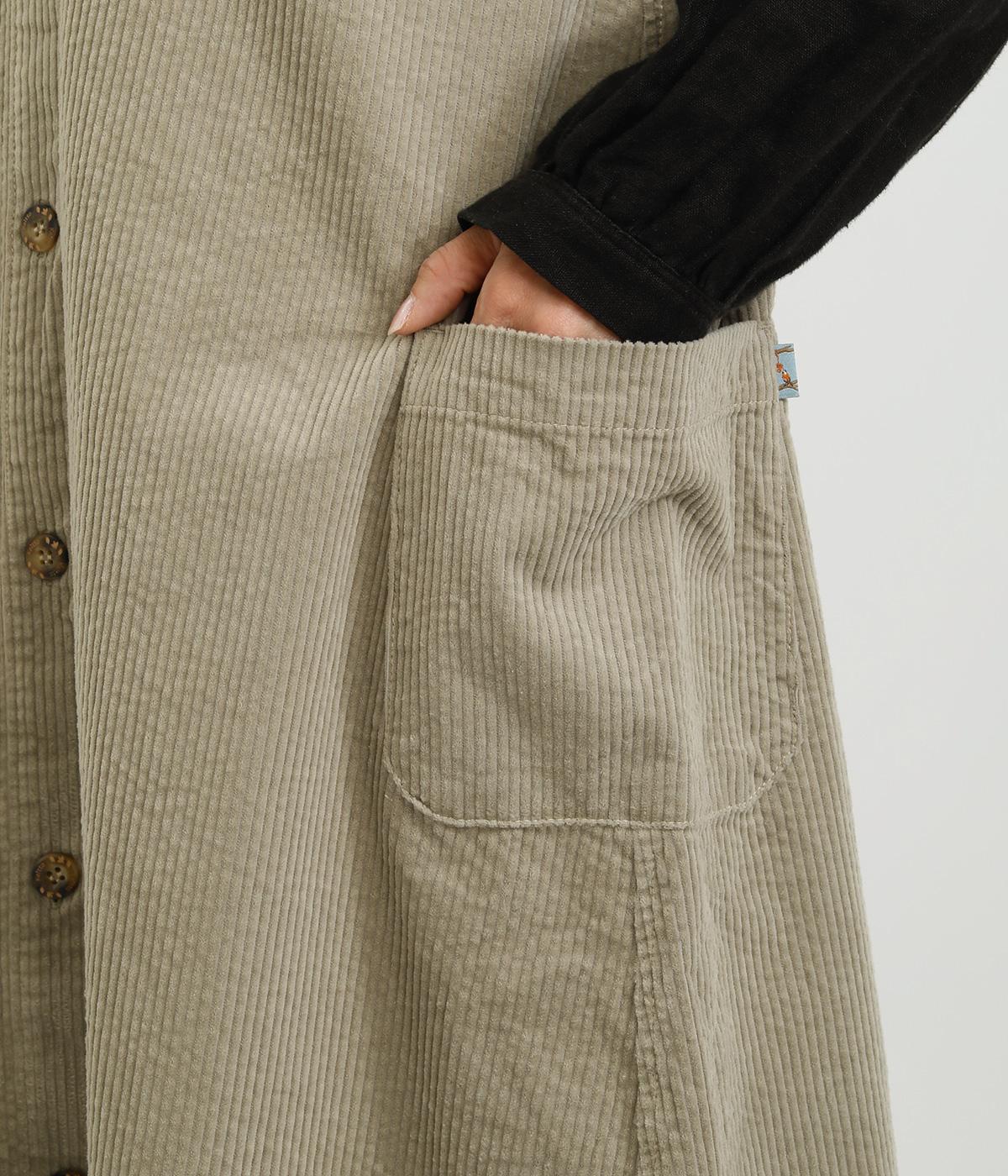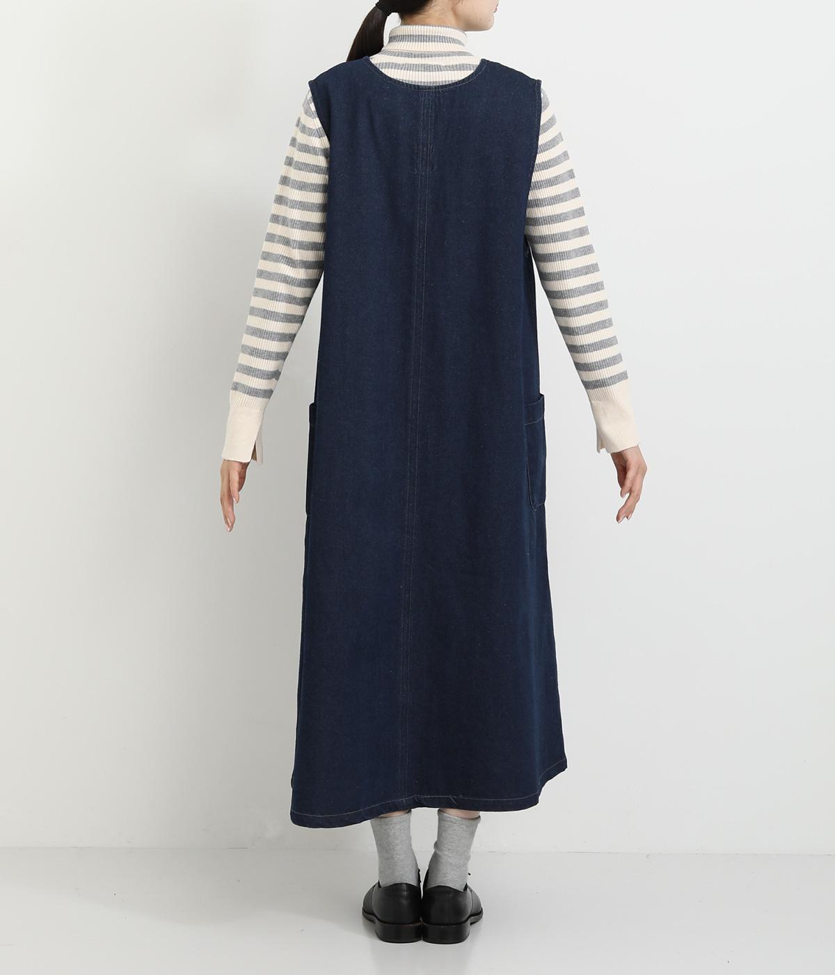 大きなポケットがカジュアルな印象のジャンパースカートです。餌をついばむ鳥をあしらったピスネームがさりげないアクセントになっています。深めのVネックが首周りをすっきりさせ、さまざまなインナーと合わせやすく仕上げました。