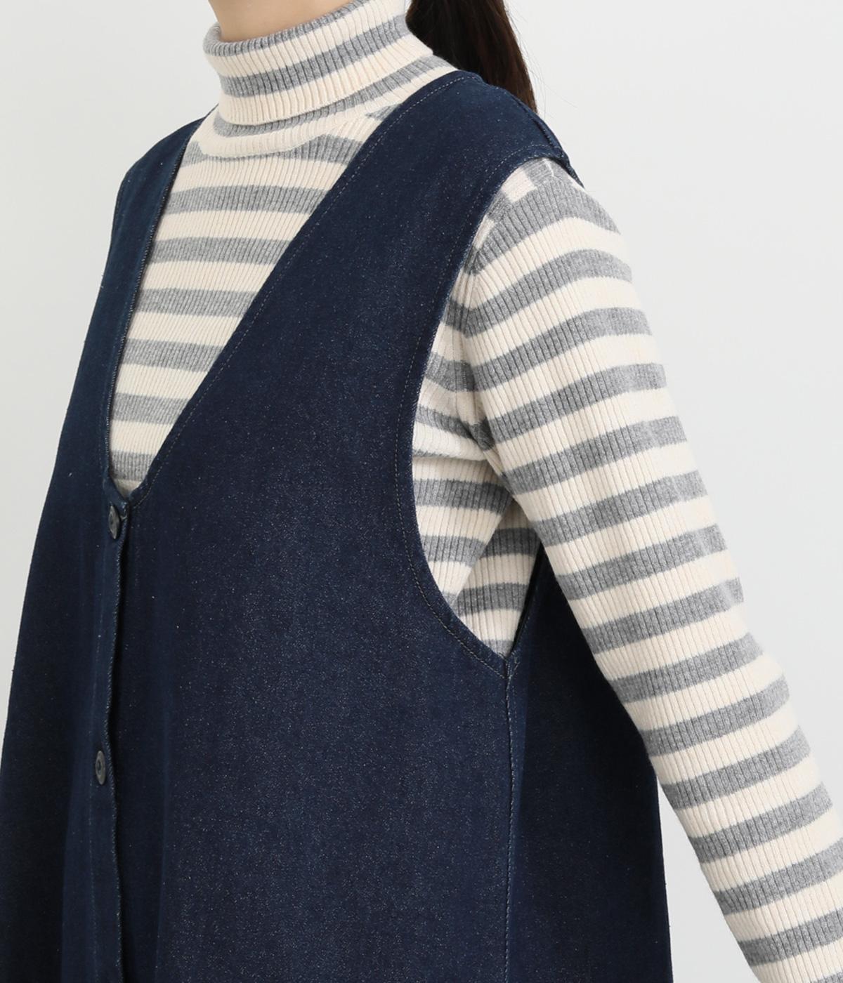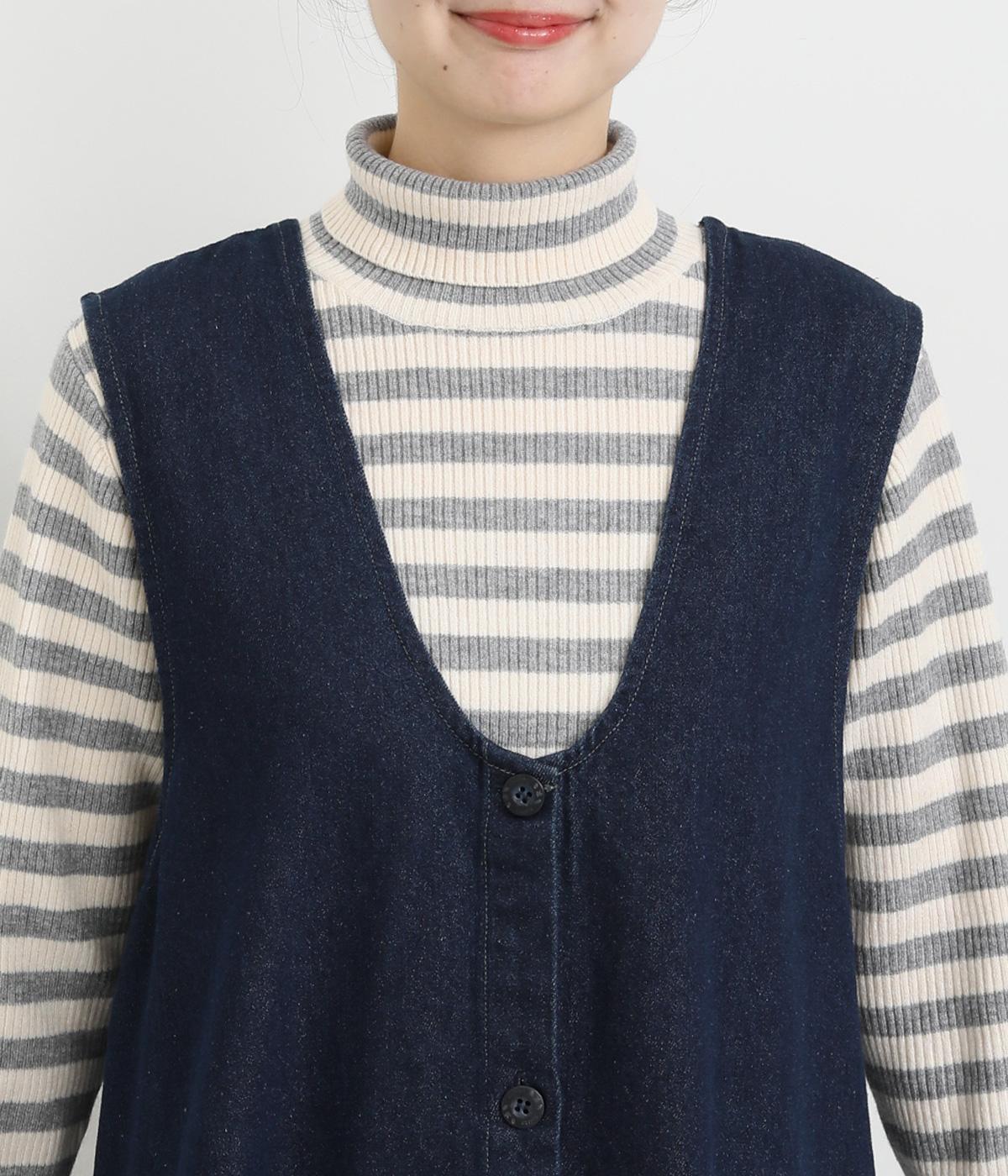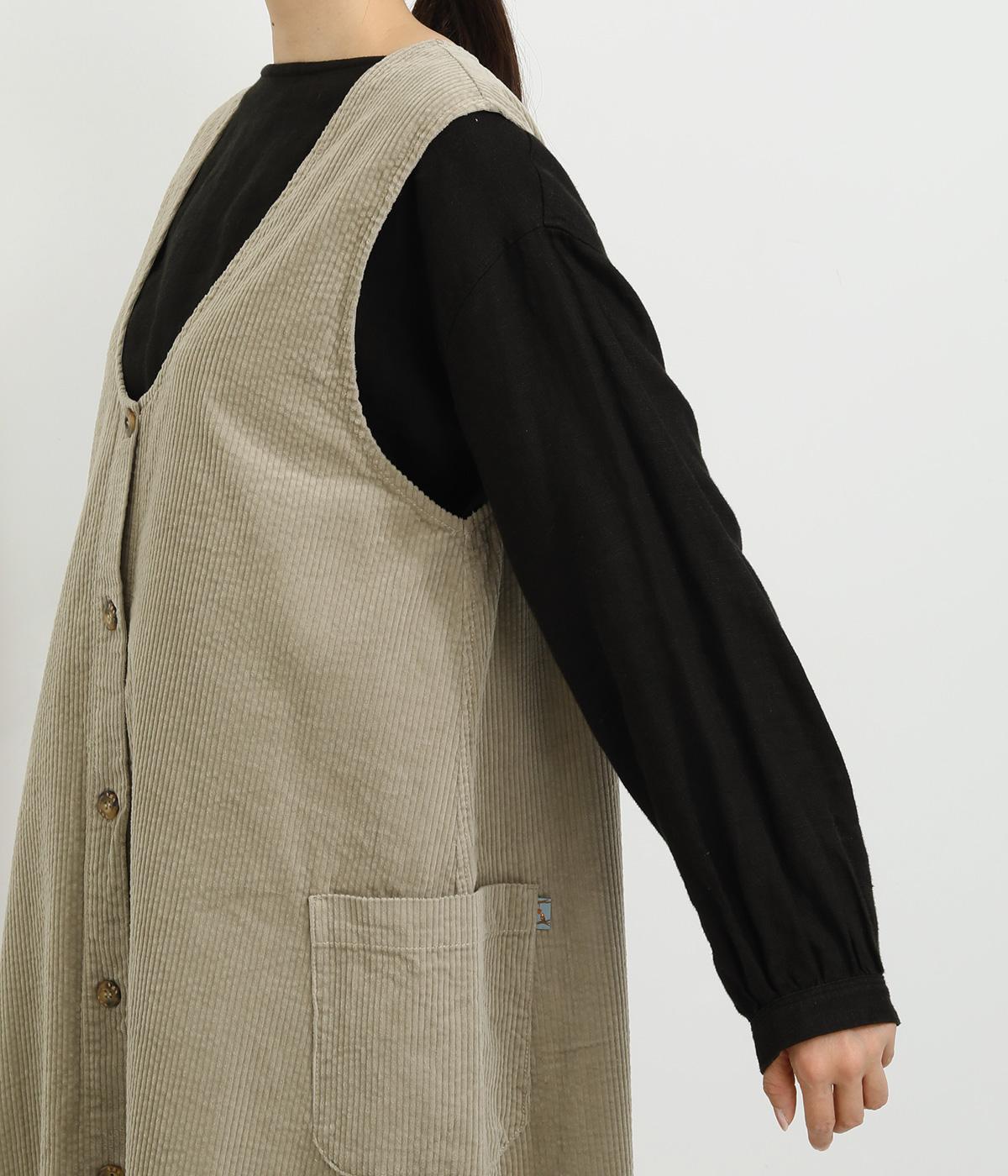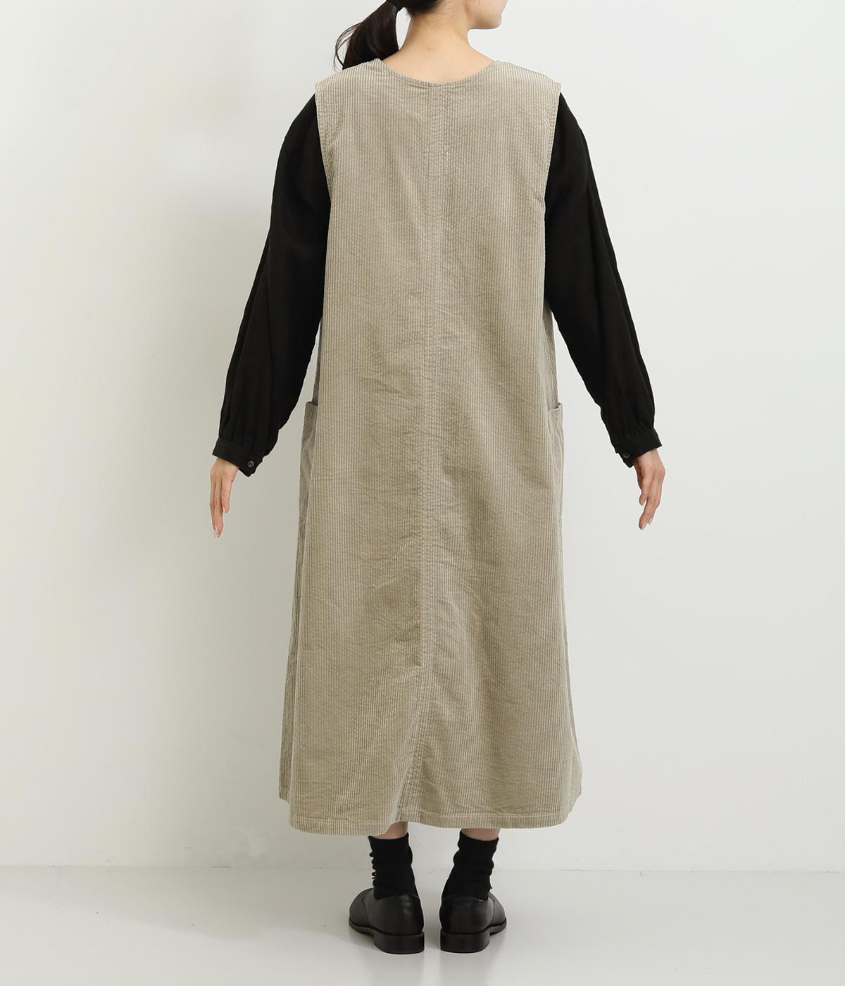 大きなポケットがカジュアルな印象のジャンパースカートです。餌をついばむ鳥をあしらったピスネームがさりげないアクセントになっています。深めのVネックが首周りをすっきりさせ、さまざまなインナーと合わせやすく仕上げました。