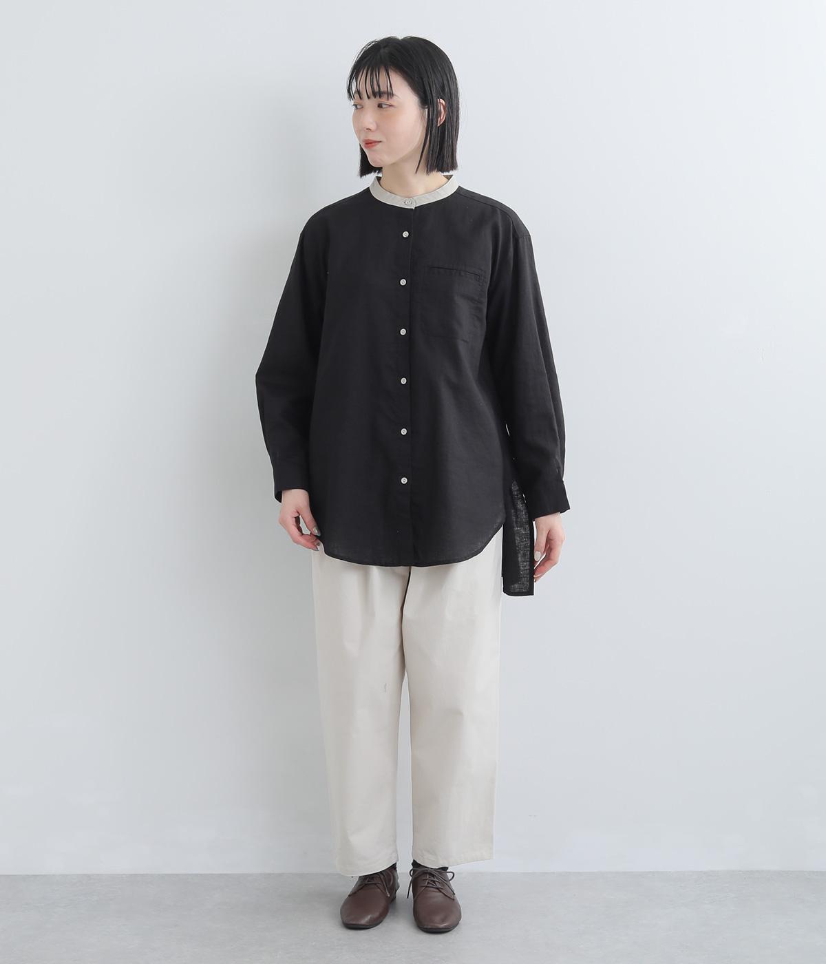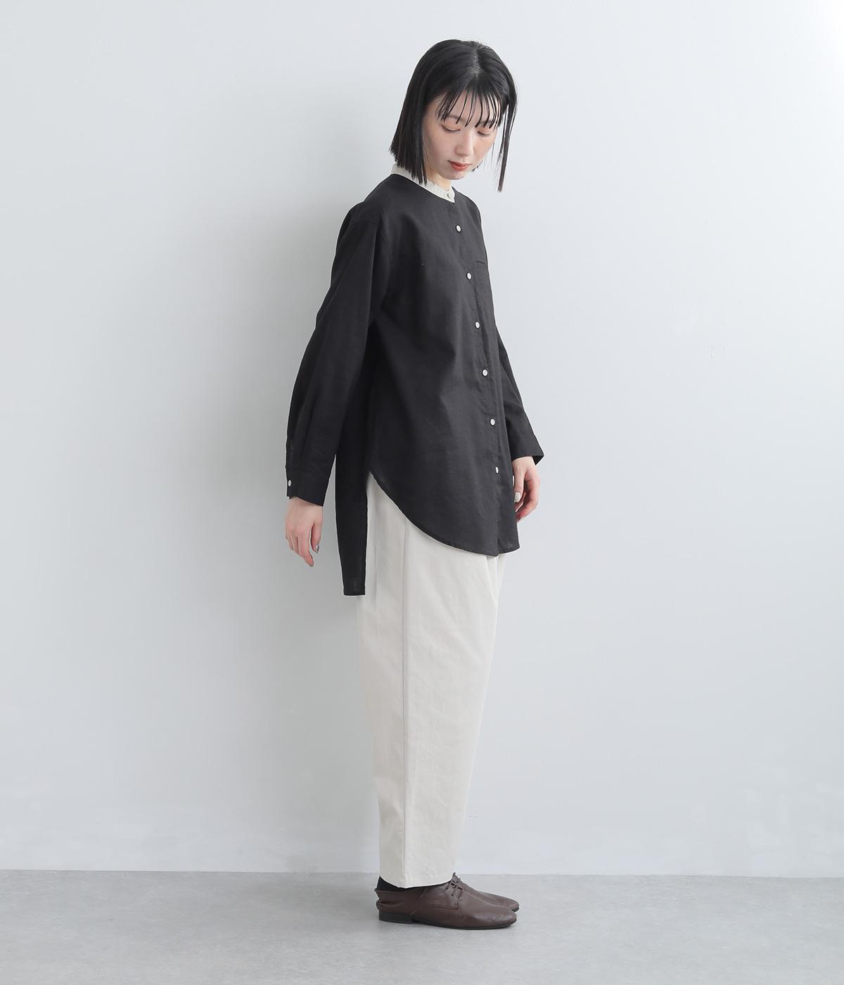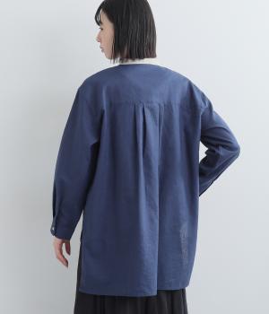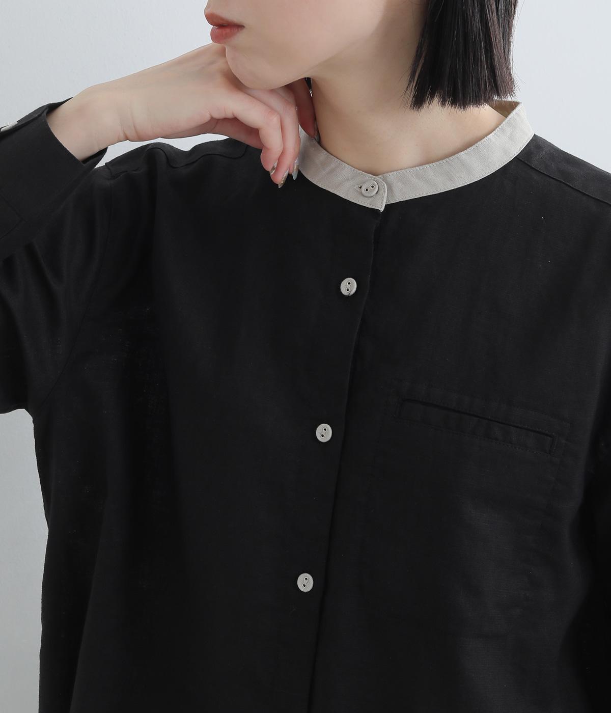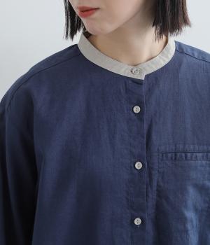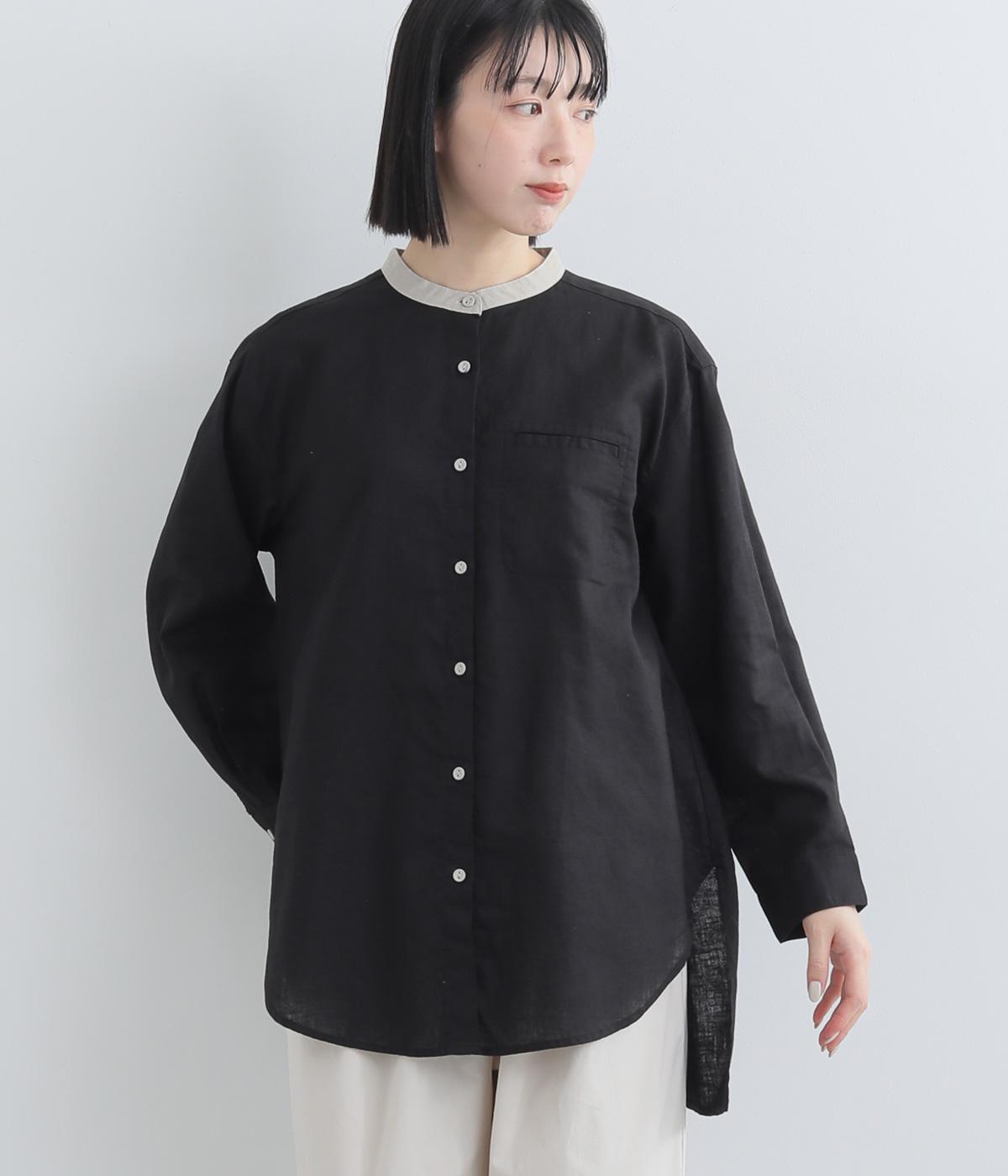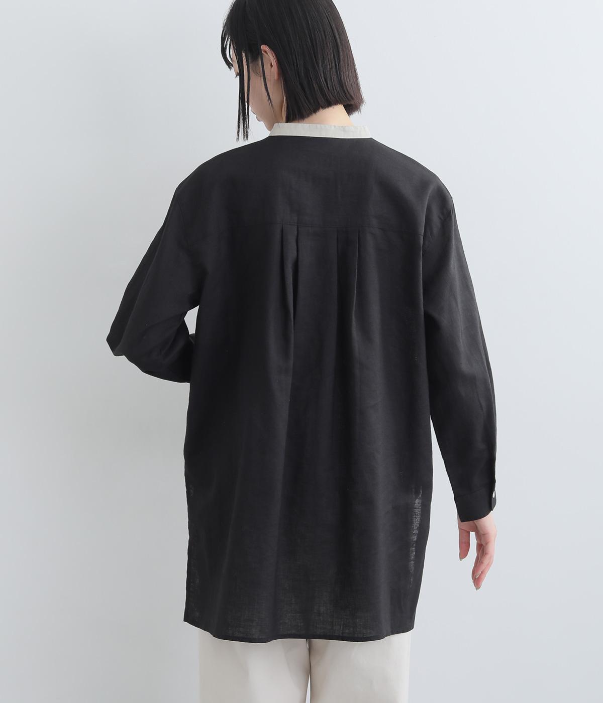 ノーカラーの首元に配色を効かせたデザインがポイントのシャツ。前後差のある裾で、特に後ろ丈を長めにすることでシルエットに自然な動きを添えてくれます。リネンコットンの風合いとベーシックカラーで着まわしやすい一着です。