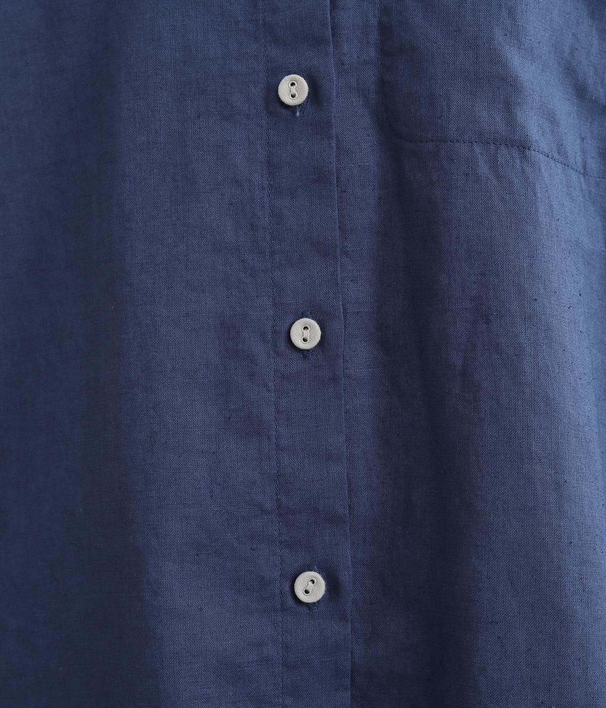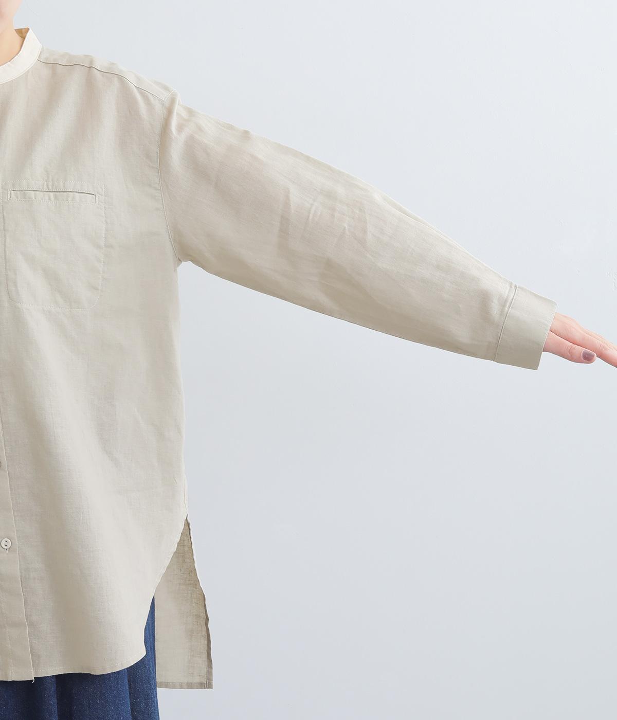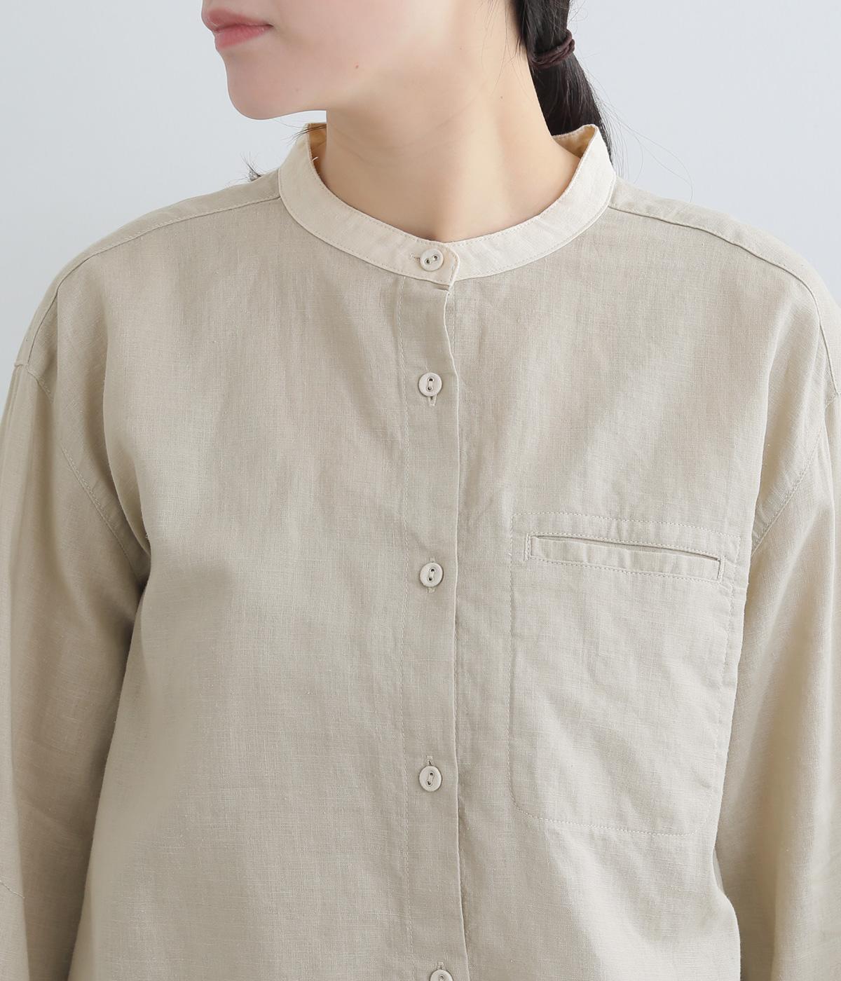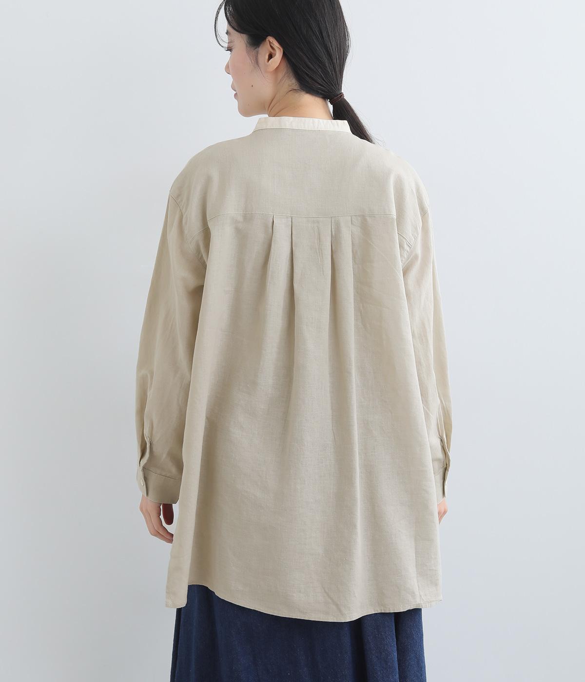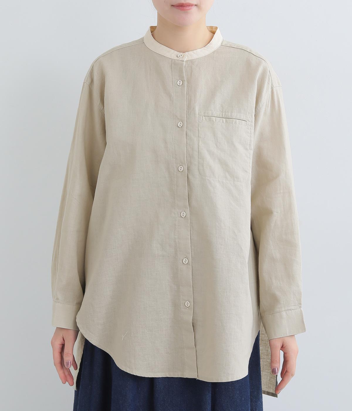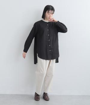 ノーカラーの首元に配色を効かせたデザインがポイントのシャツ。前後差のある裾で、特に後ろ丈を長めにすることでシルエットに自然な動きを添えてくれます。リネンコットンの風合いとベーシックカラーで着まわしやすい一着です。
