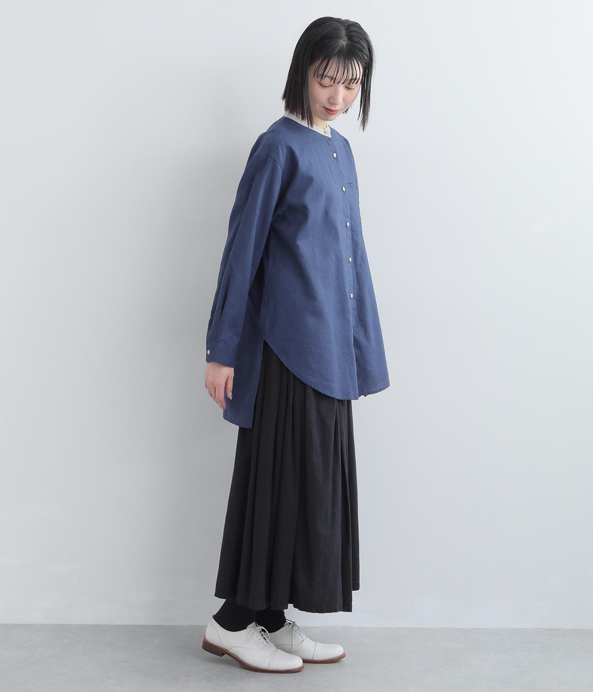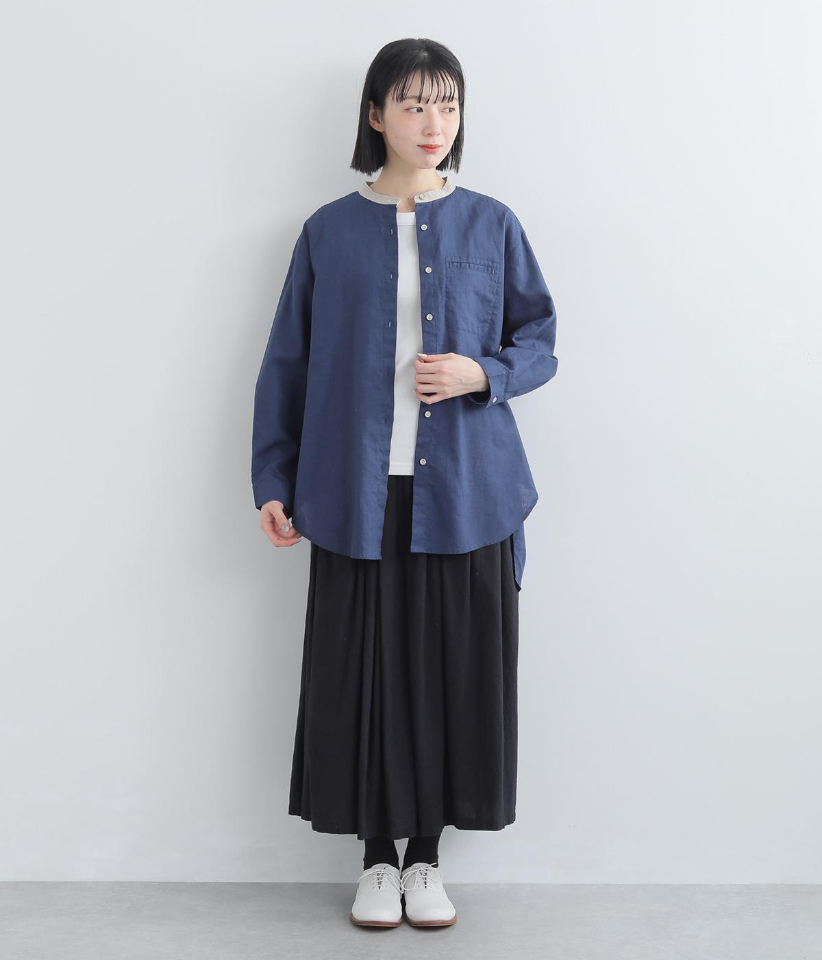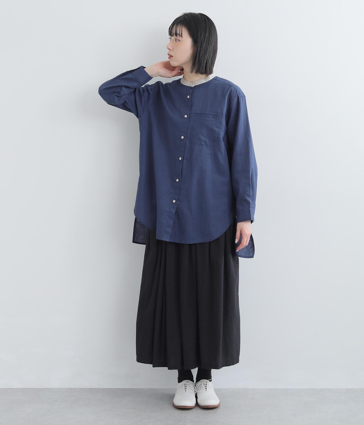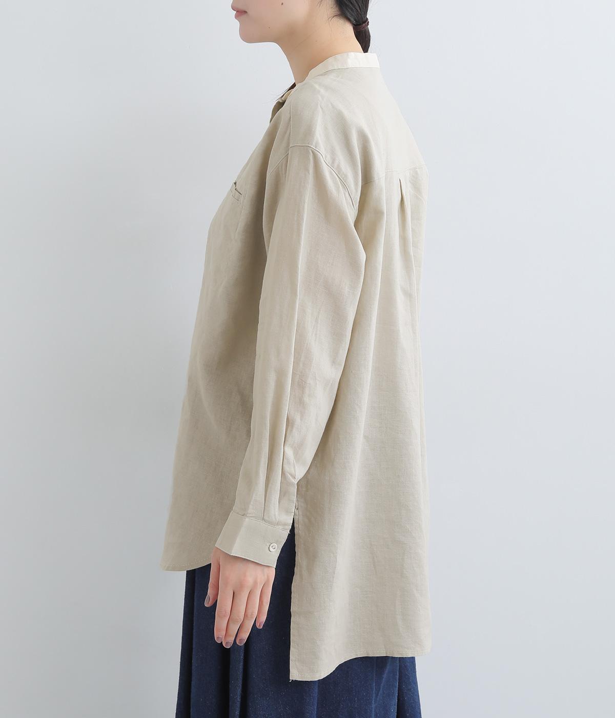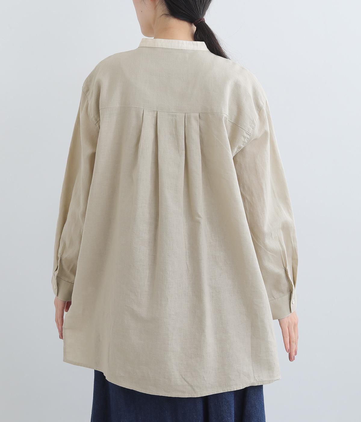 ノーカラーの首元に配色を効かせたデザインがポイントのシャツ。前後差のある裾で、特に後ろ丈を長めにすることでシルエットに自然な動きを添えてくれます。リネンコットンの風合いとベーシックカラーで着まわしやすい一着です。