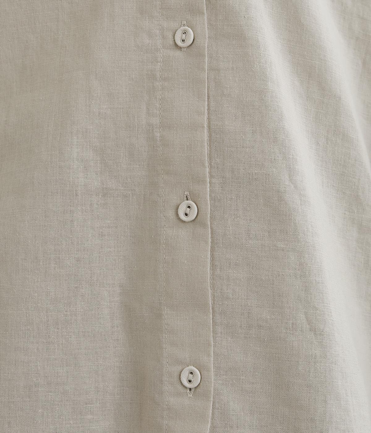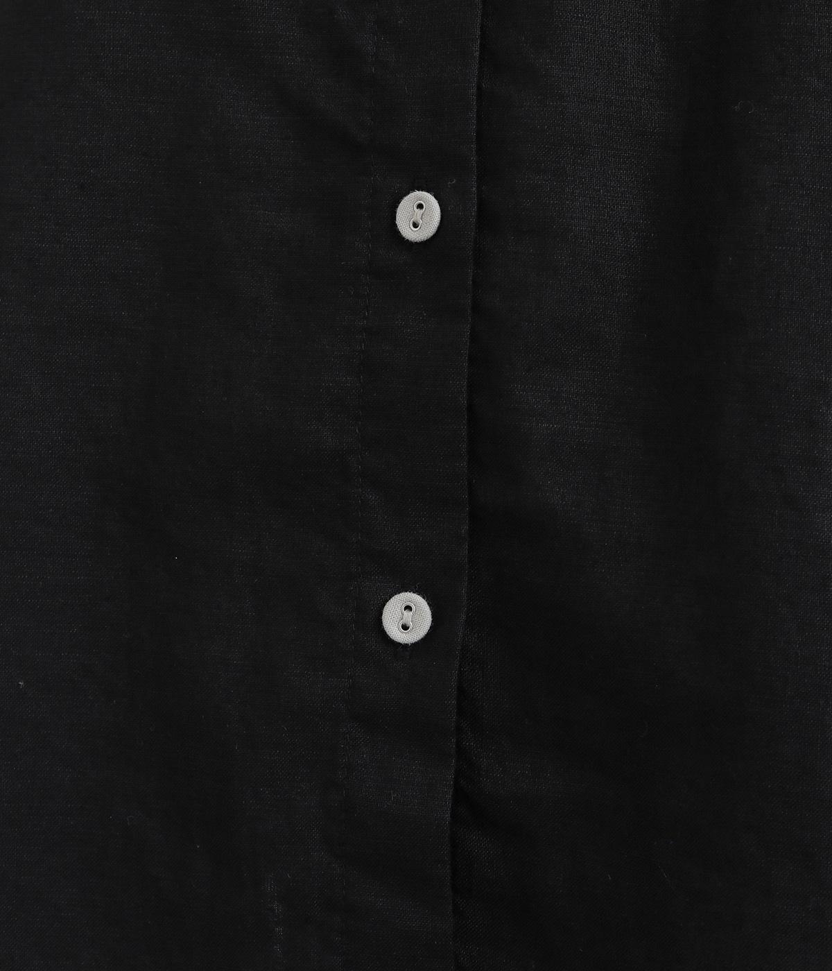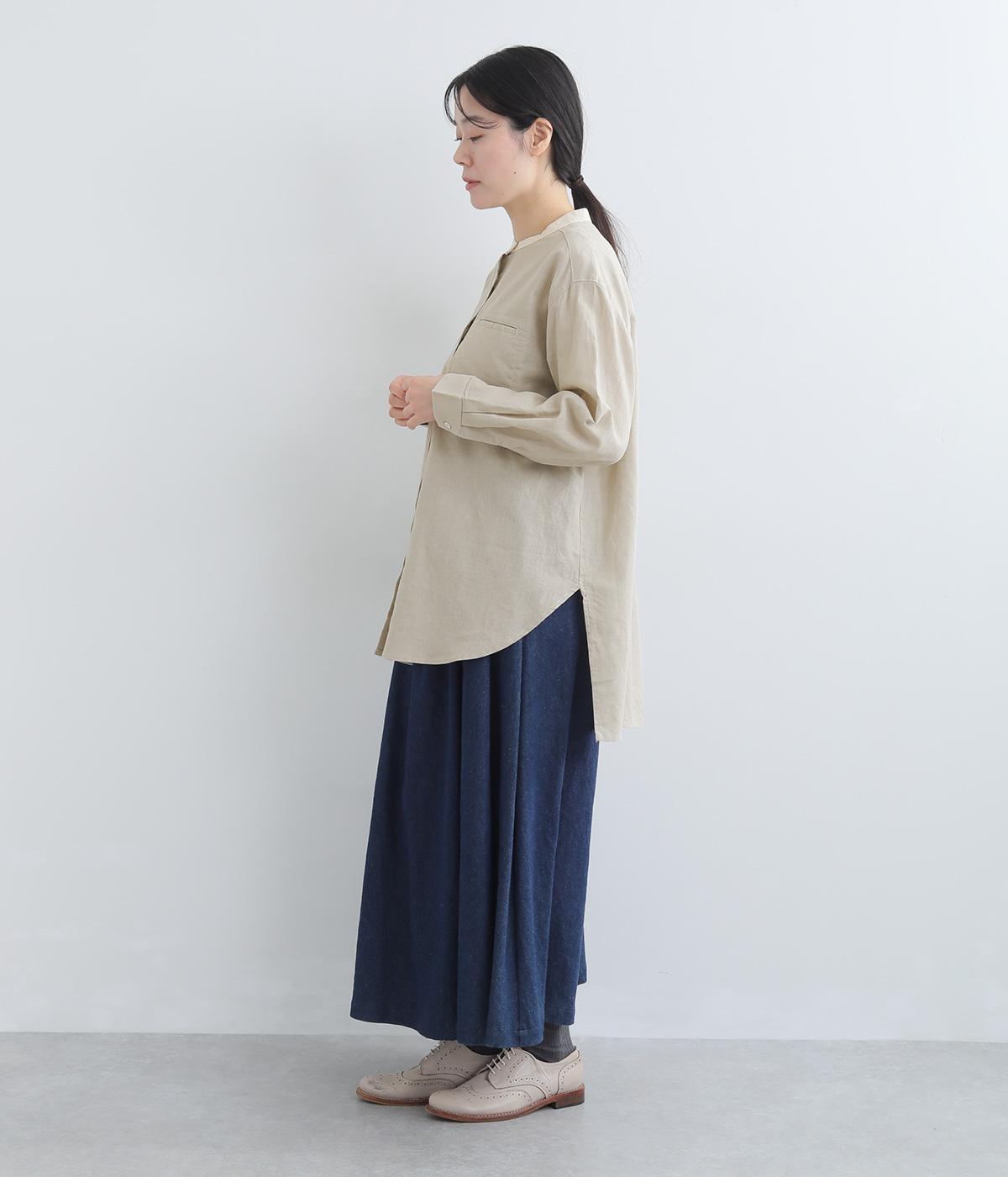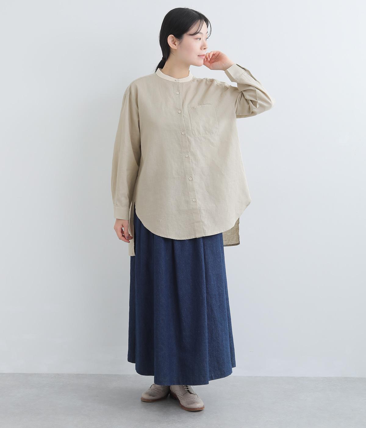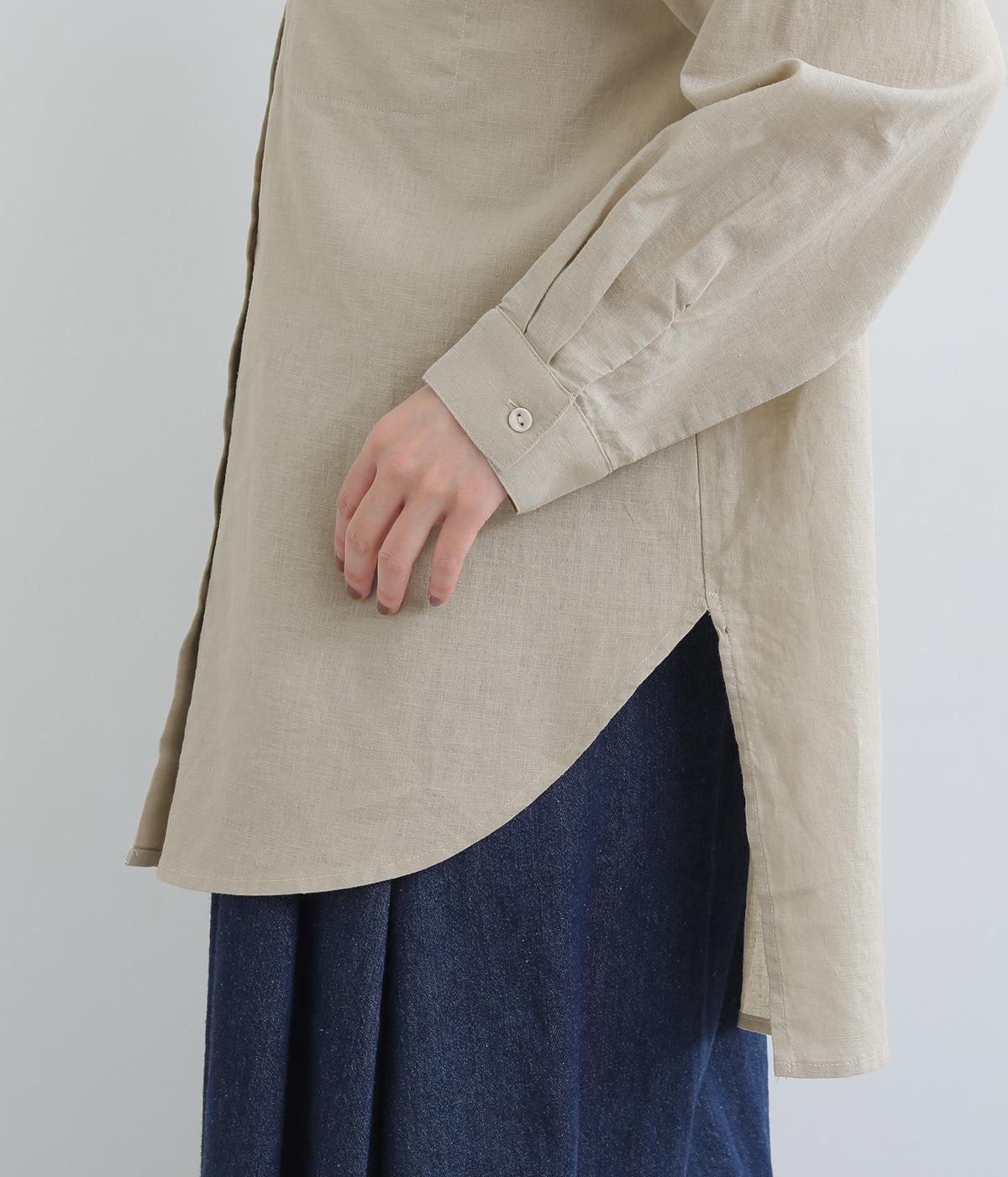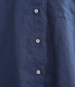 ノーカラーの首元に配色を効かせたデザインがポイントのシャツ。前後差のある裾で、特に後ろ丈を長めにすることでシルエットに自然な動きを添えてくれます。リネンコットンの風合いとベーシックカラーで着まわしやすい一着です。