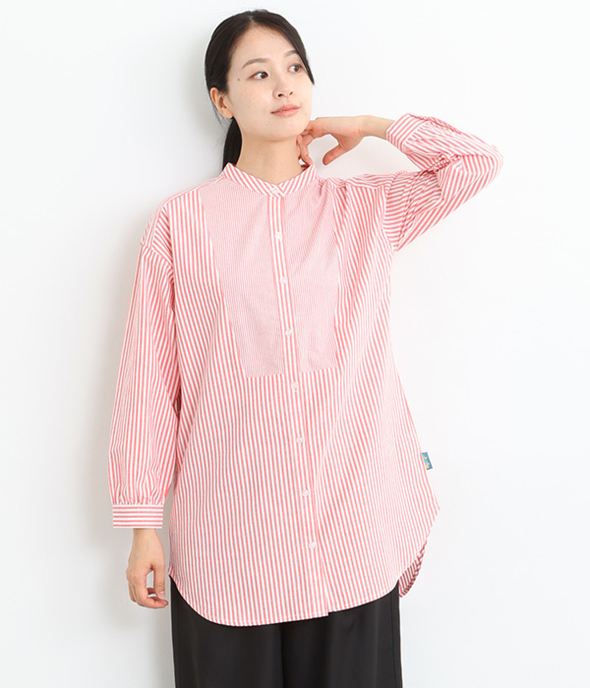 ゆったりと着用できるクレリックロングシャツです。前身頃の切り替え部分を細ピッチの柄にして、その他のパーツはピッチ違いのストライプ柄を使用しました。お家の彫りボタンや左脇のピスネームはかわいさをプラス。