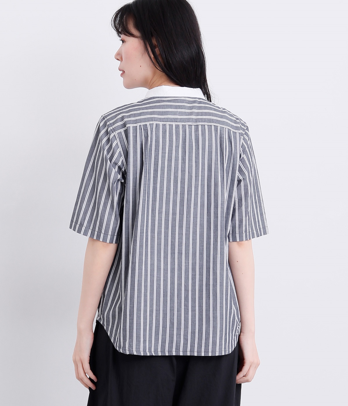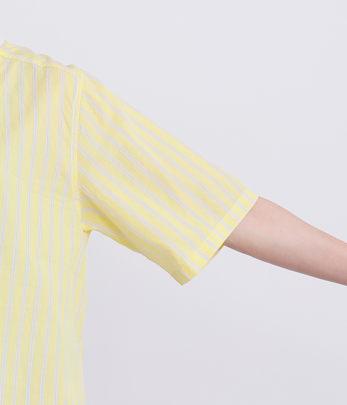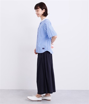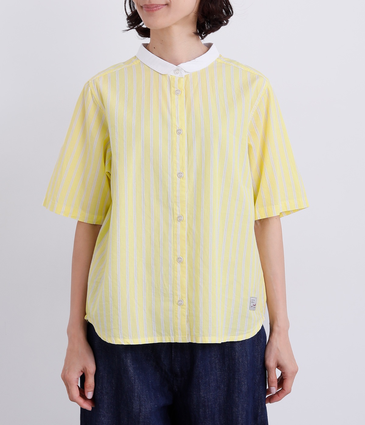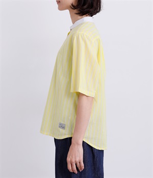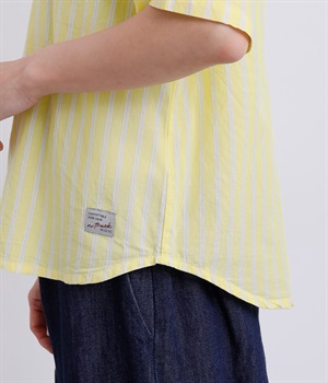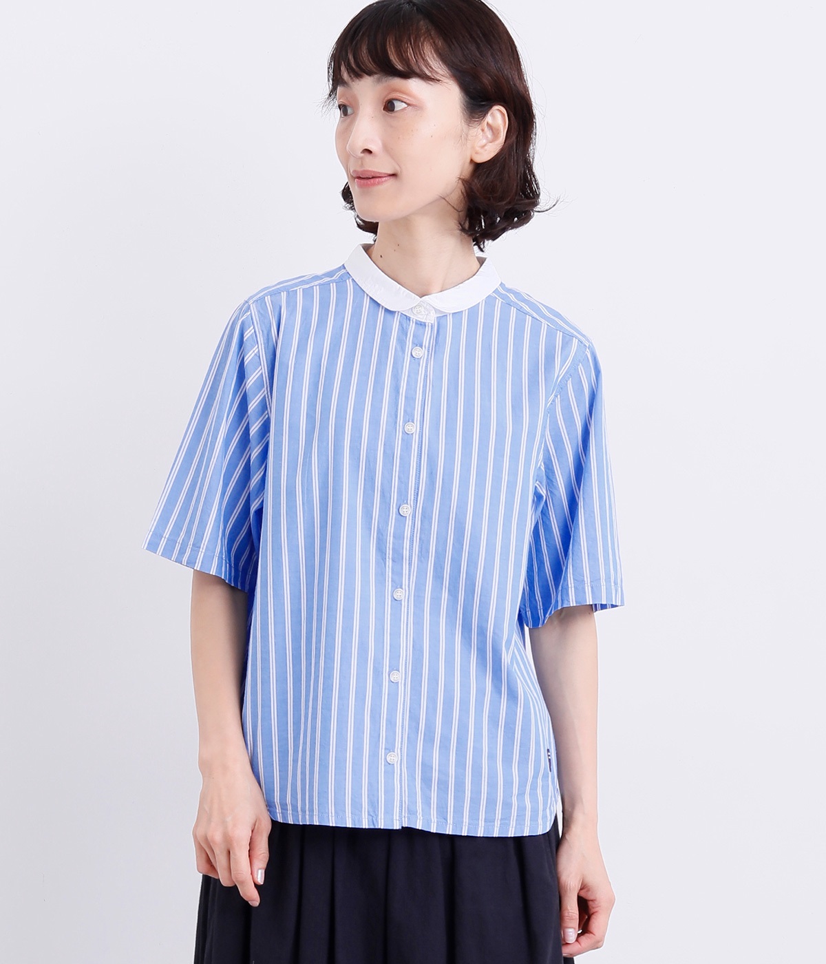 ストライプ柄でよりさわやかに仕上げたクレリックシャツです。着こなしのポイントになりつつも顔まわりはすっきりまとめました。ロゴ入りの刻印ボタンや裾のワッペンなど随所にこだわりをプラス。