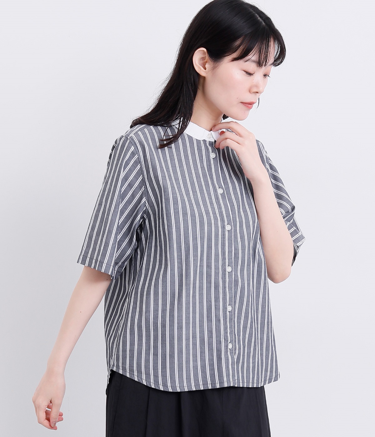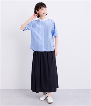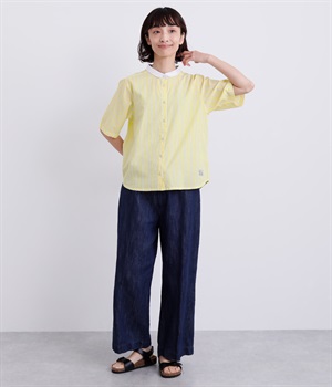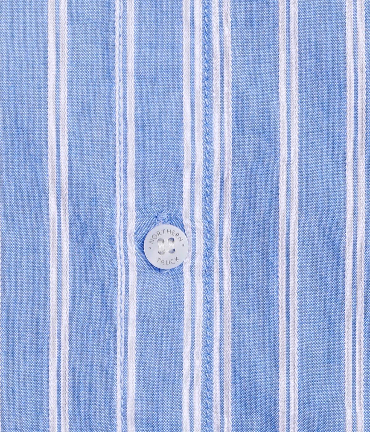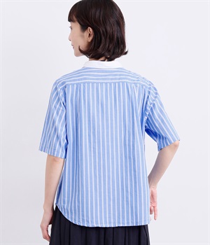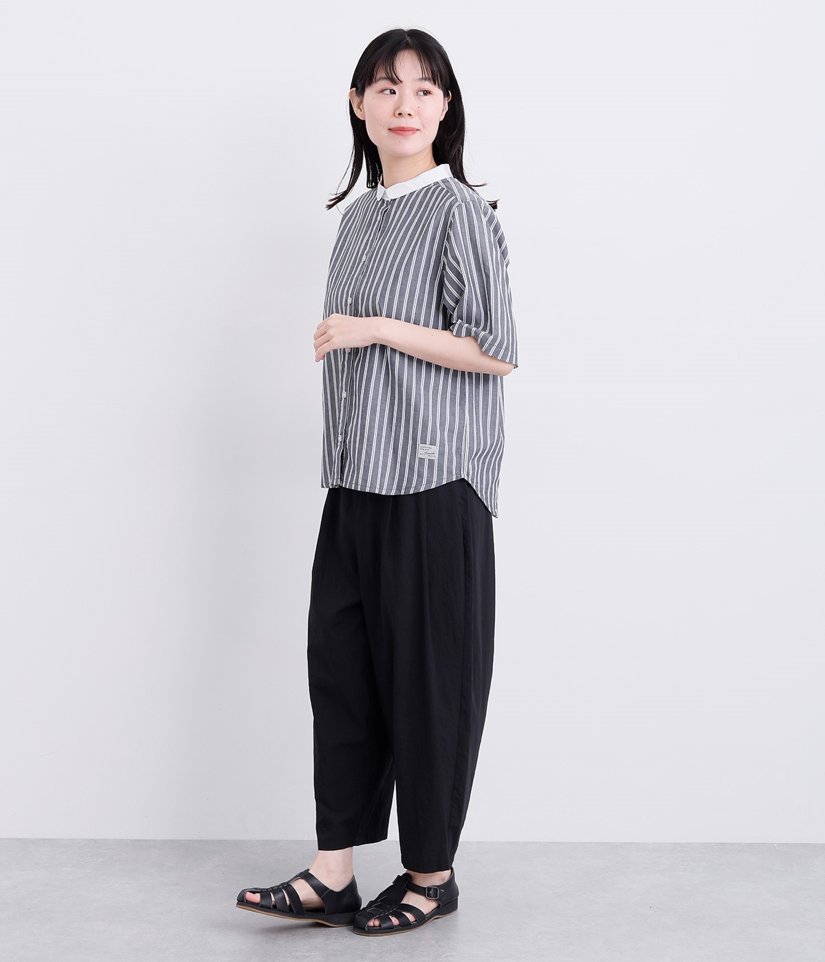 ストライプ柄でよりさわやかに仕上げたクレリックシャツです。着こなしのポイントになりつつも顔まわりはすっきりまとめました。ロゴ入りの刻印ボタンや裾のワッペンなど随所にこだわりをプラス。