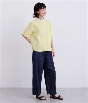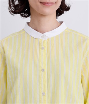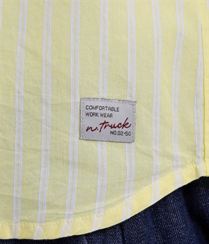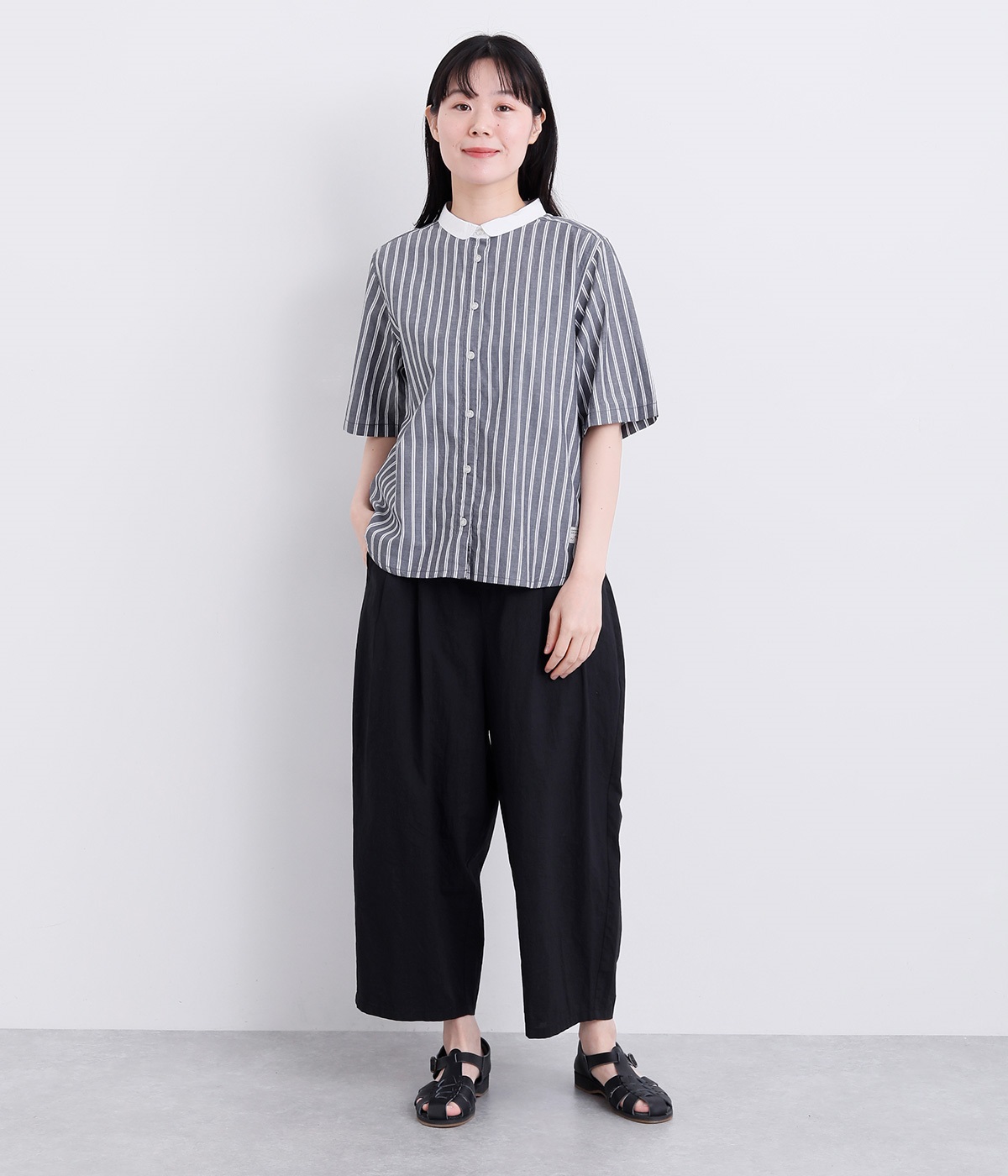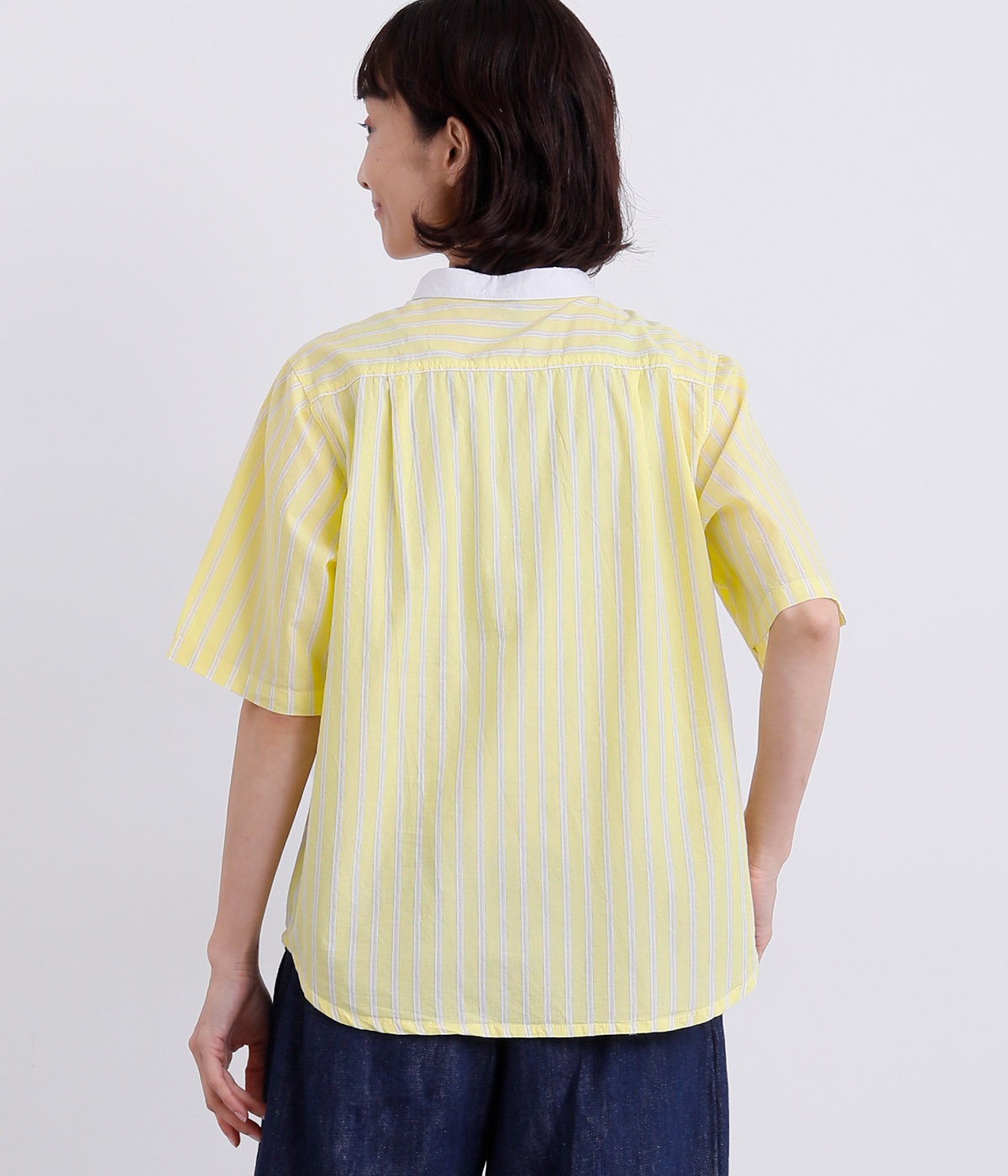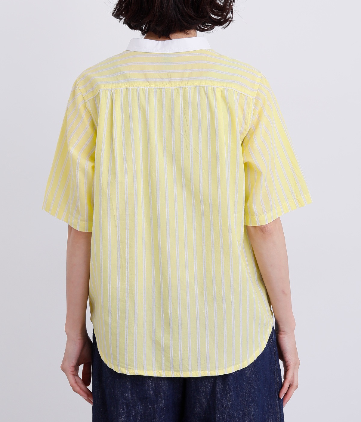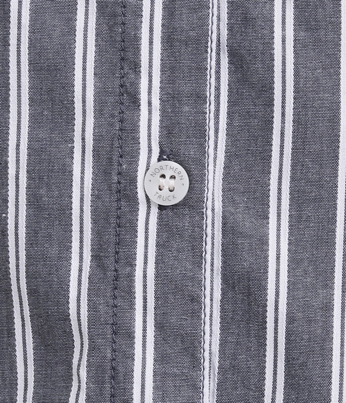 ストライプ柄でよりさわやかに仕上げたクレリックシャツです。着こなしのポイントになりつつも顔まわりはすっきりまとめました。ロゴ入りの刻印ボタンや裾のワッペンなど随所にこだわりをプラス。