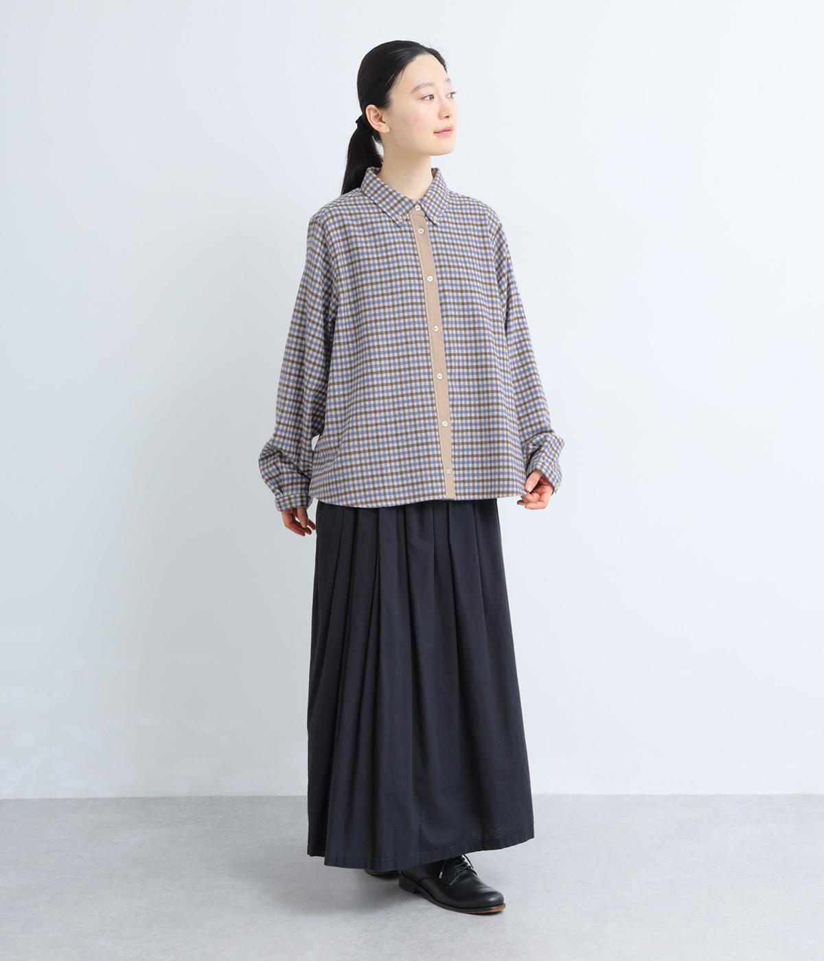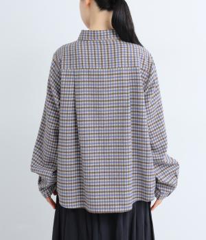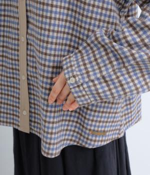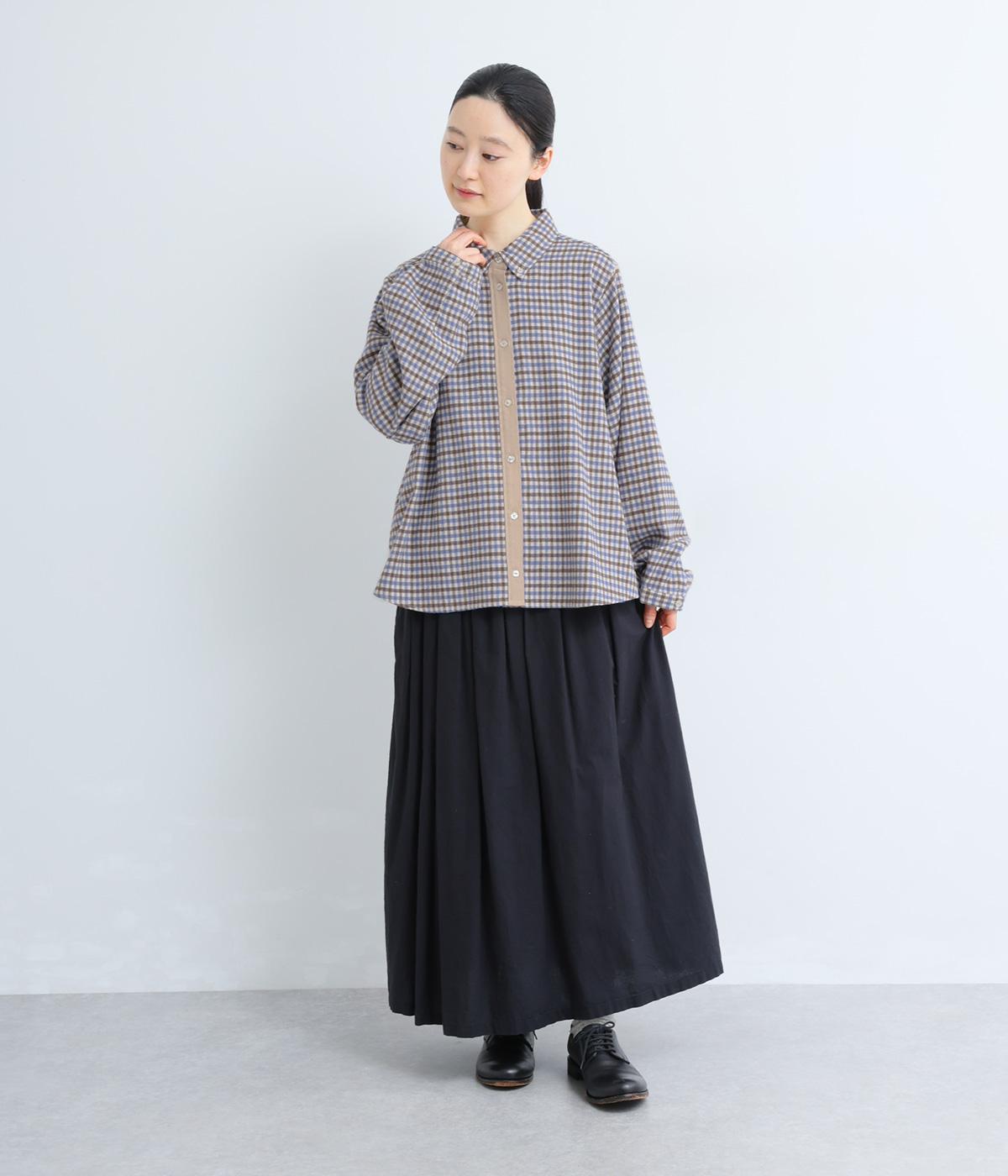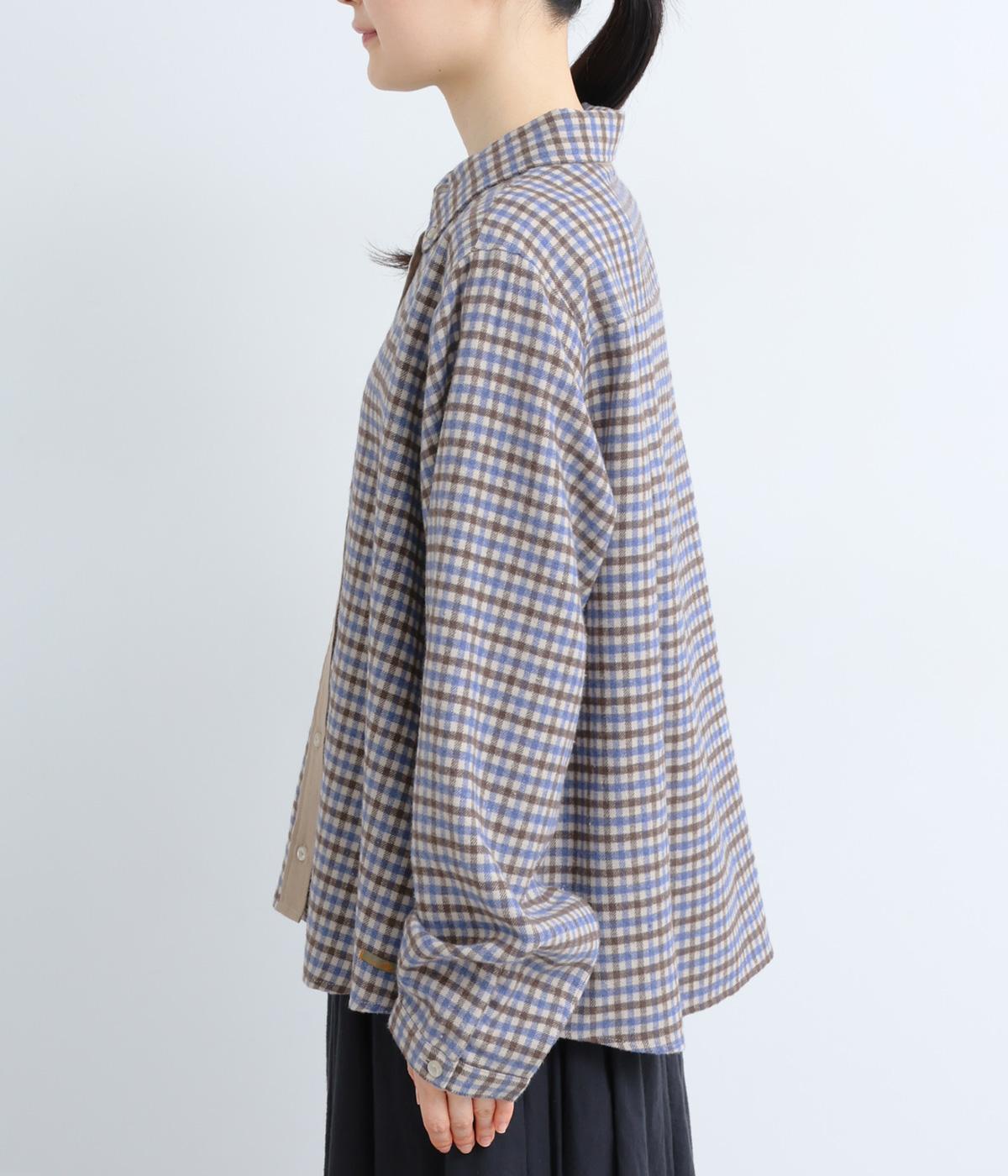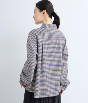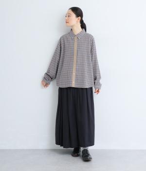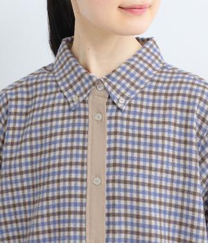 前立ての異素材づかいが印象的なチェック柄シャツ。縦ラインを強調して全体をすっきりと見せてくれます。背中にタックを入れて、後ろ姿にふんわりとした動きをプラス。少し長めの袖丈が、こなれ感のある着こなしに導きます。