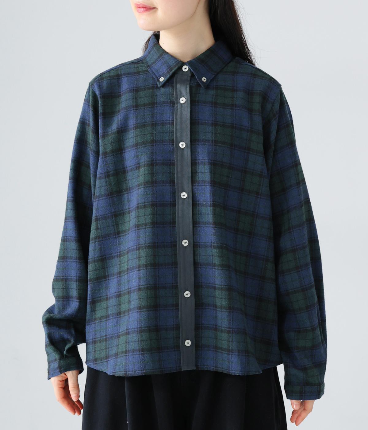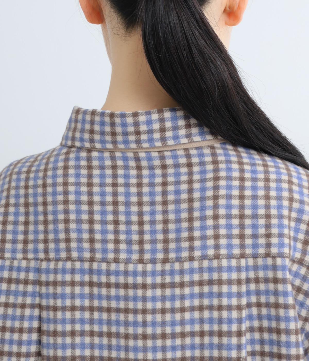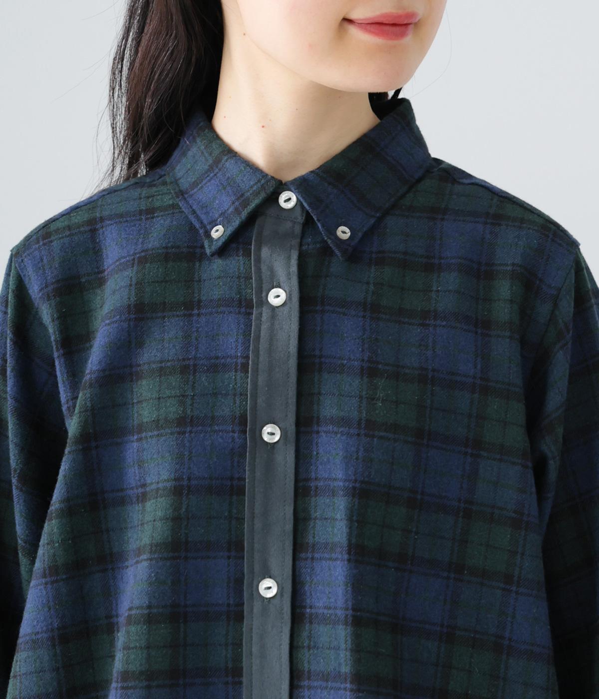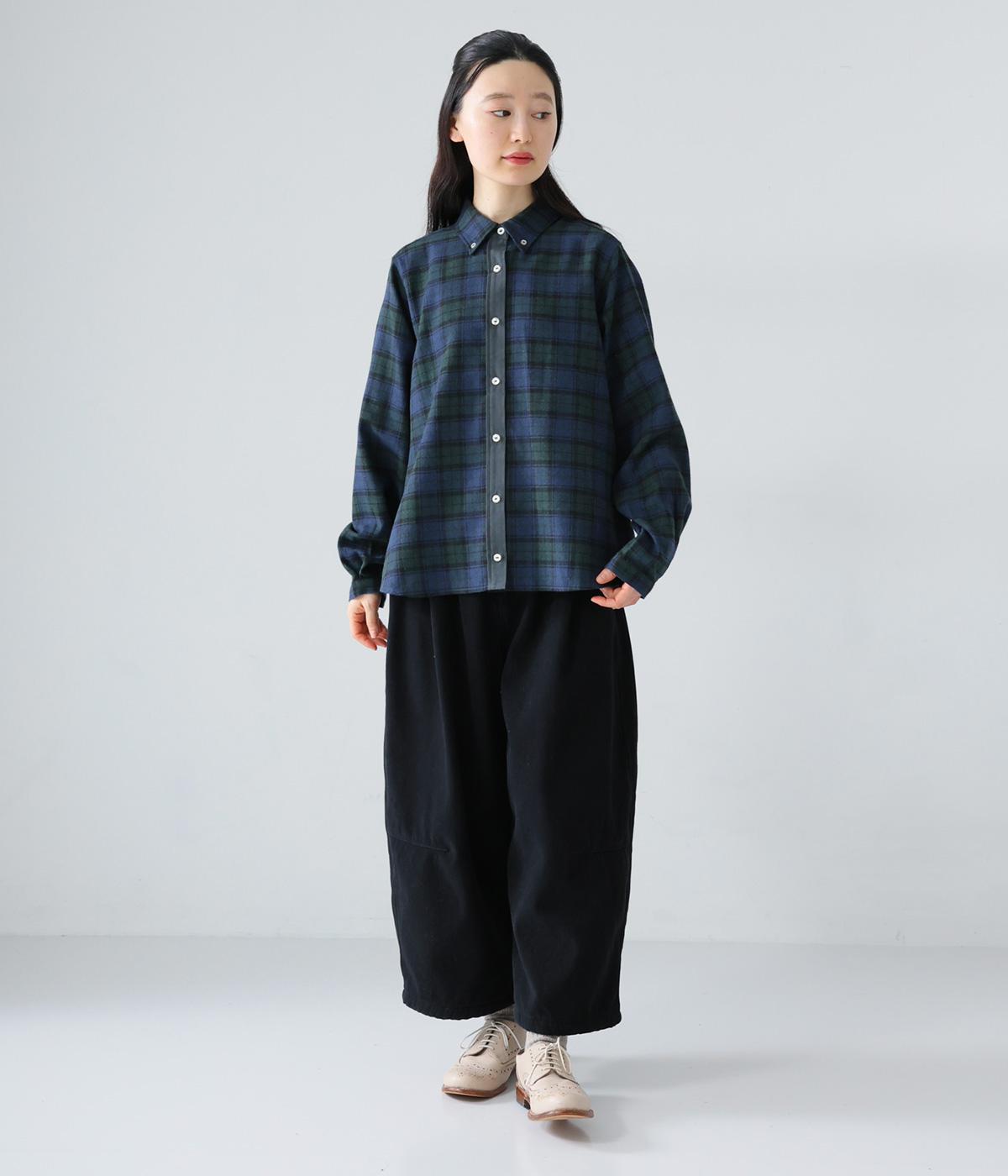 前立ての異素材づかいが印象的なチェック柄シャツ。縦ラインを強調して全体をすっきりと見せてくれます。背中にタックを入れて、後ろ姿にふんわりとした動きをプラス。少し長めの袖丈が、こなれ感のある着こなしに導きます。