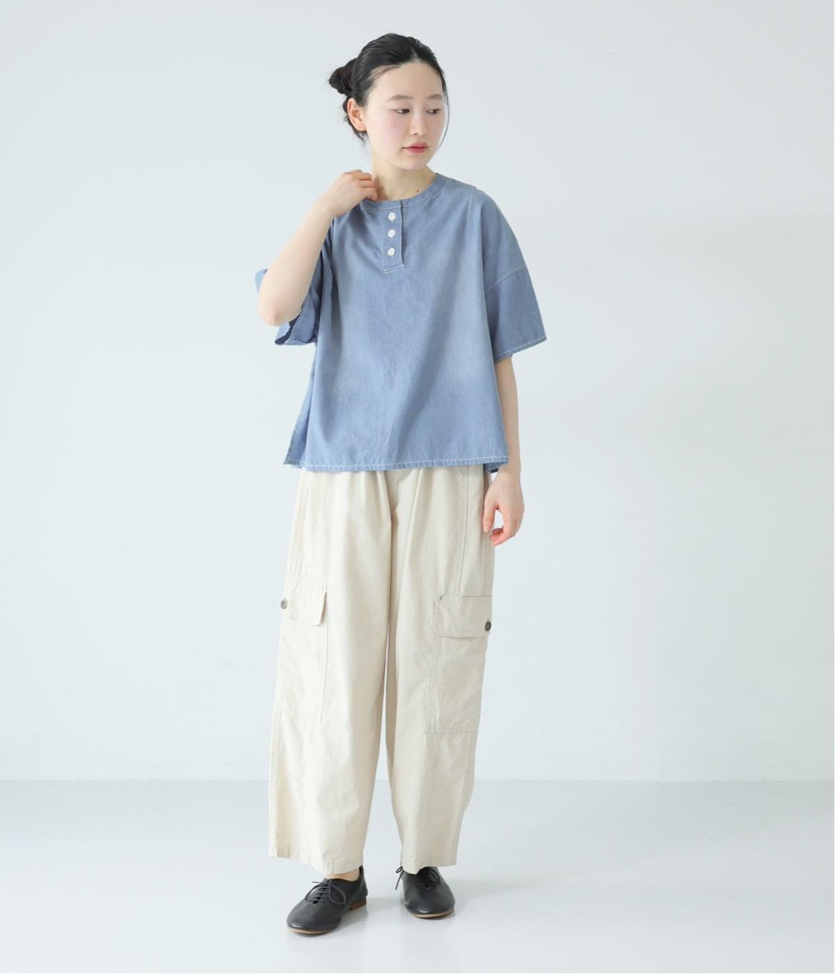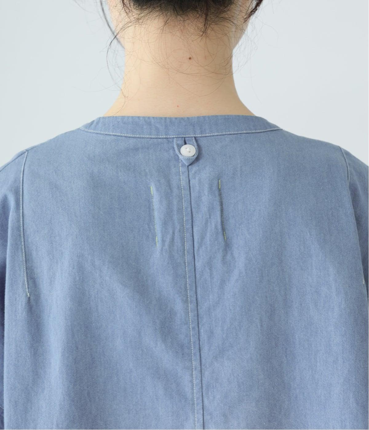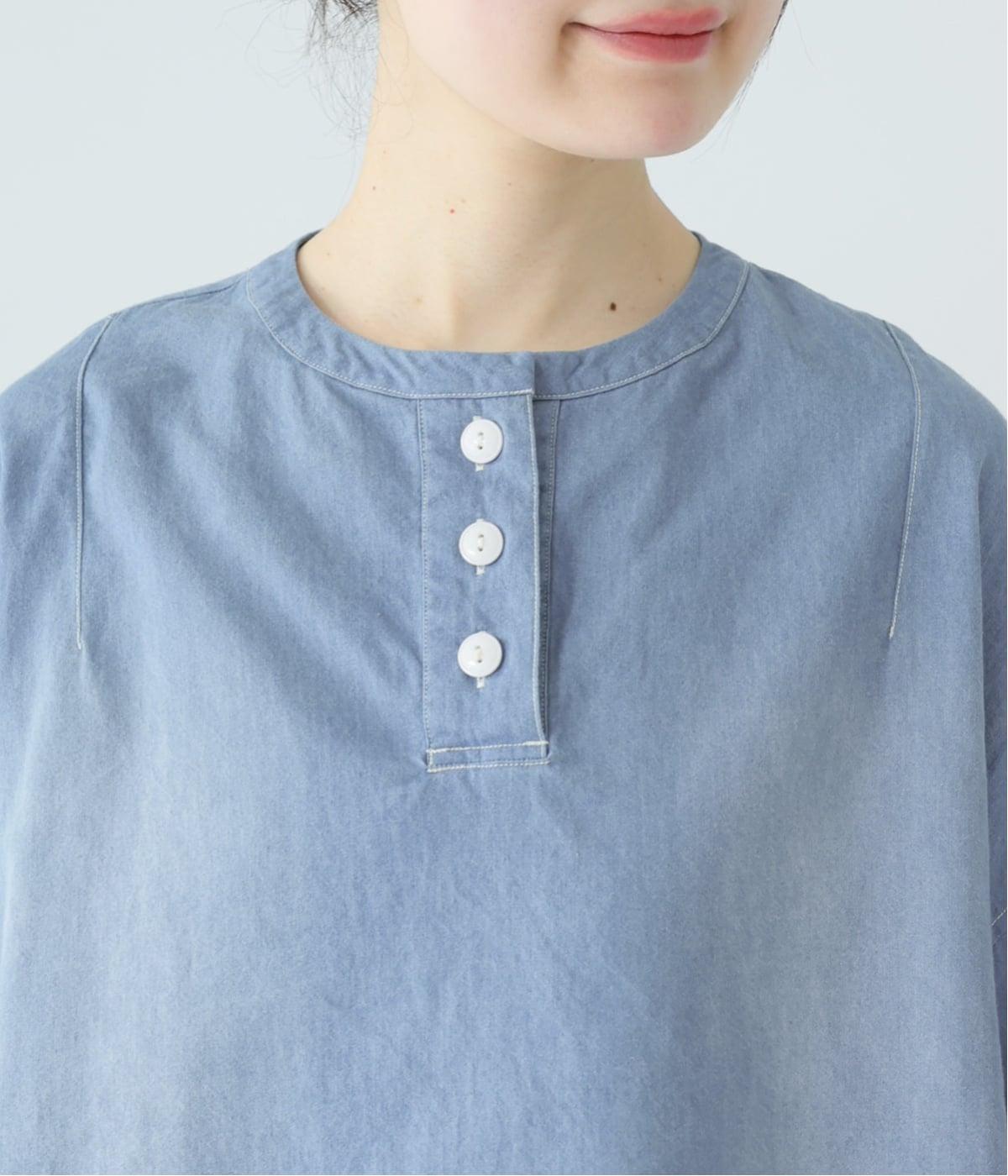 体のラインを拾いにくいボックスシルエットに、抜け感のあるヘンリーネックを添えたプルオーバーです。肩のダーツが立体感を生み、自然な丸みのあるフォルムを演出します。うしろ襟下のループは、フックにかけられる実用的な仕様。ワークウェアからヒントを得た、こだわりのポイントです。