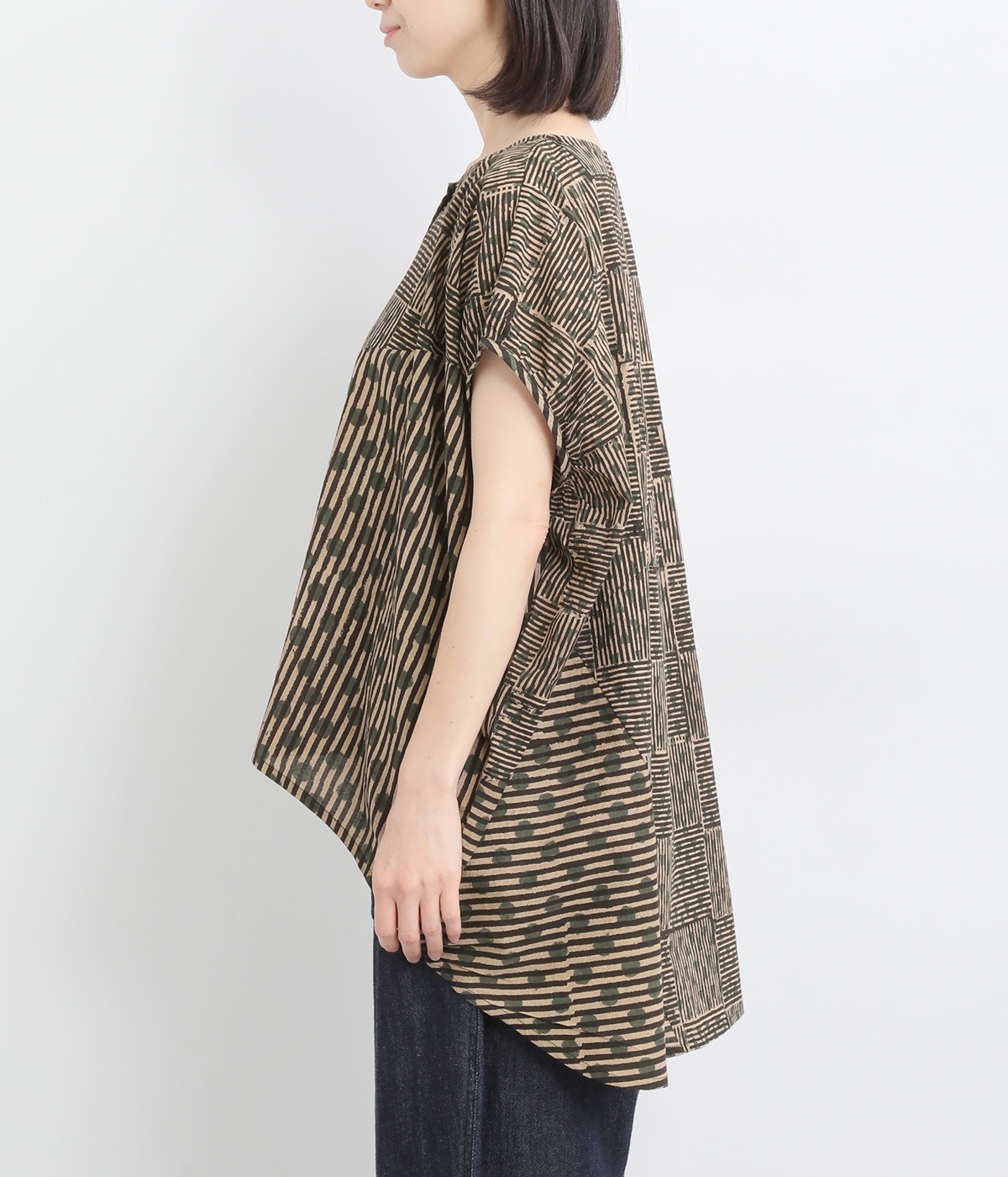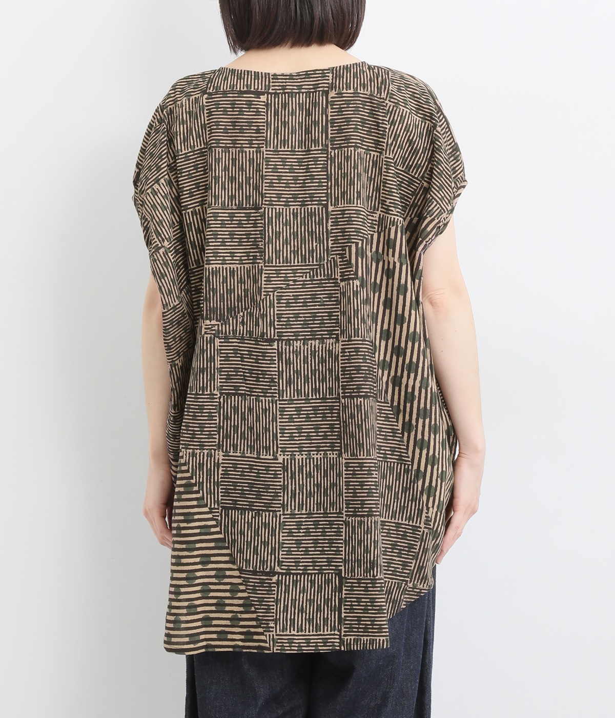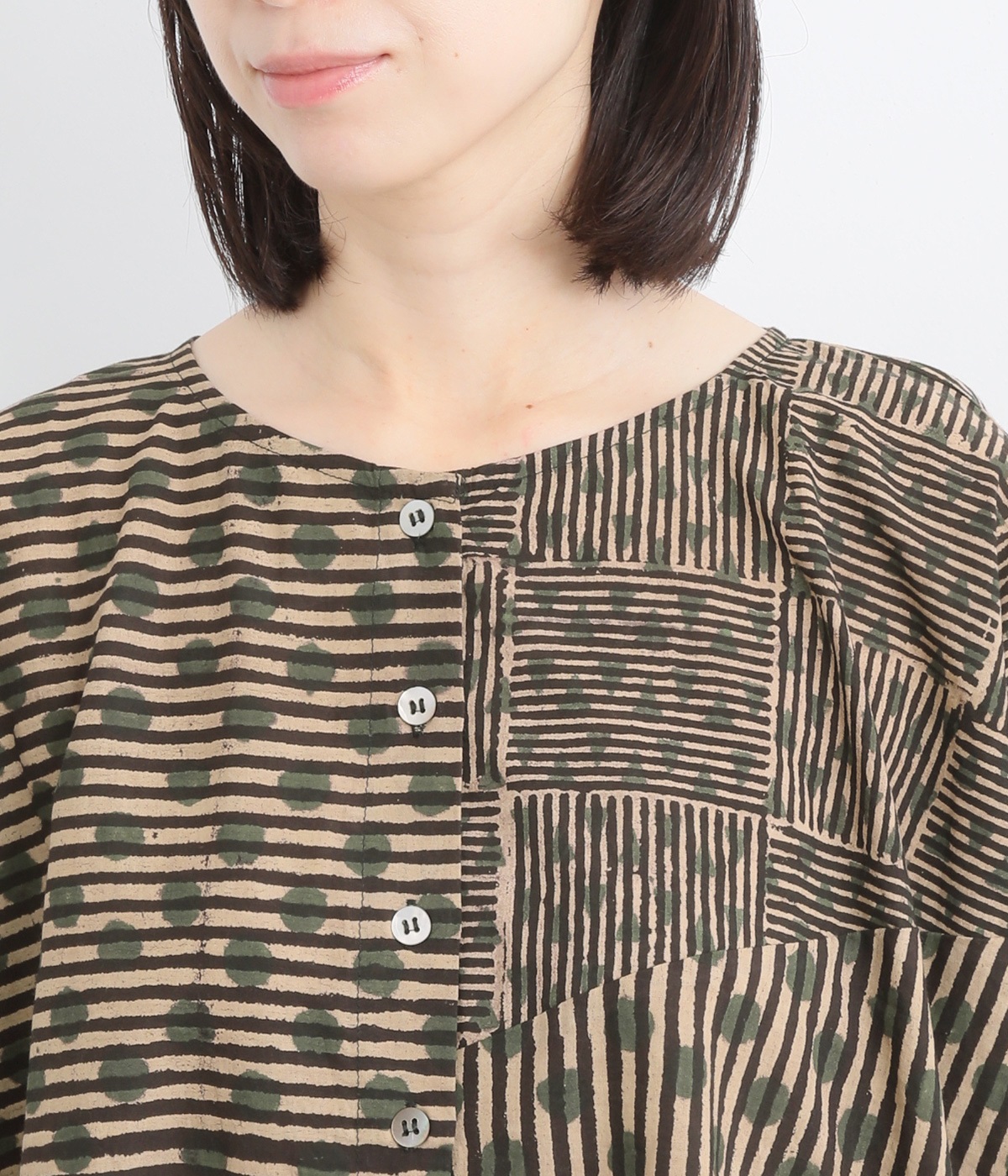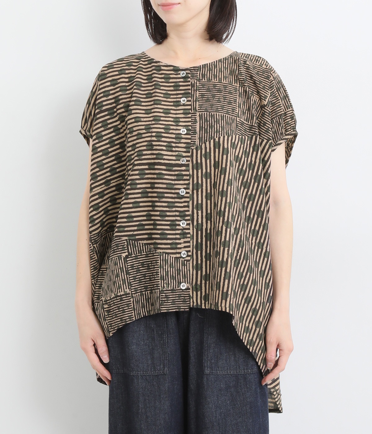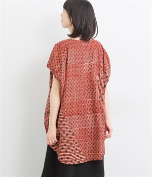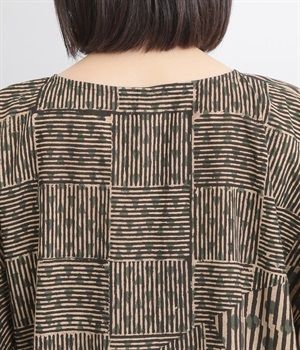 ドットや三角、ストライプなどシンプルなパターンを組み合わせた華やかなブラウスです。袖口にタックを入れて丸みを出し、ゆったりとしたシルエットに仕上げました。後ろ裾が長く、ヒップまわりをカバーしてくれるのも◎。