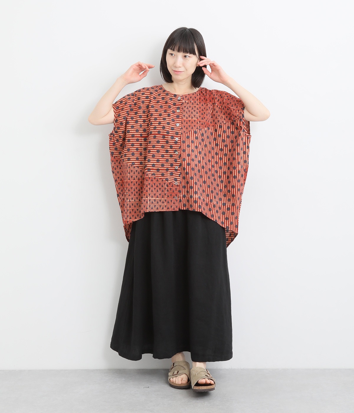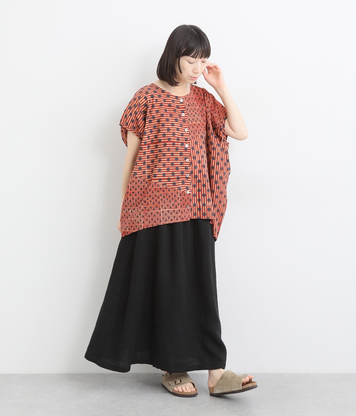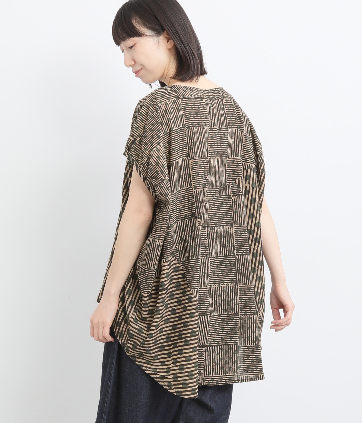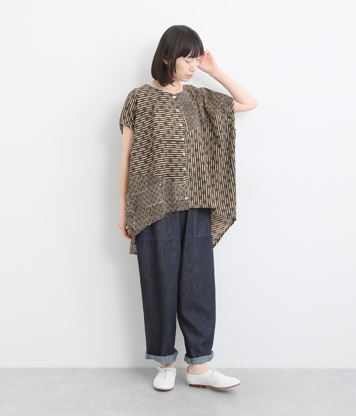 ドットや三角、ストライプなどシンプルなパターンを組み合わせた華やかなブラウスです。袖口にタックを入れて丸みを出し、ゆったりとしたシルエットに仕上げました。後ろ裾が長く、ヒップまわりをカバーしてくれるのも◎。