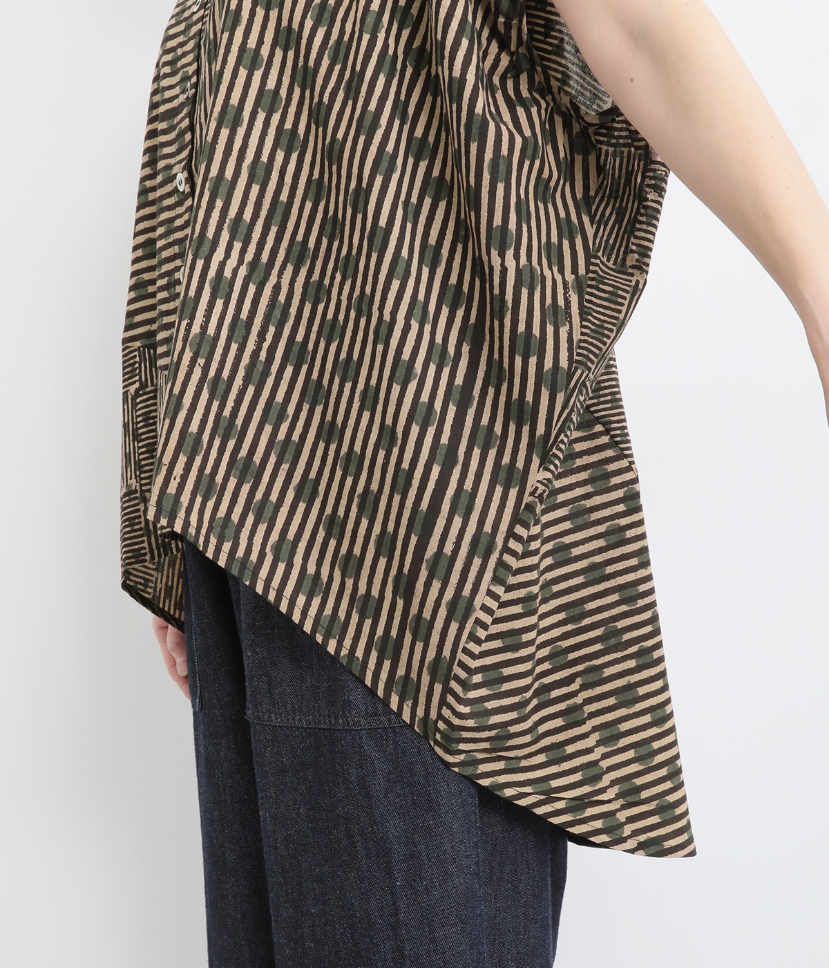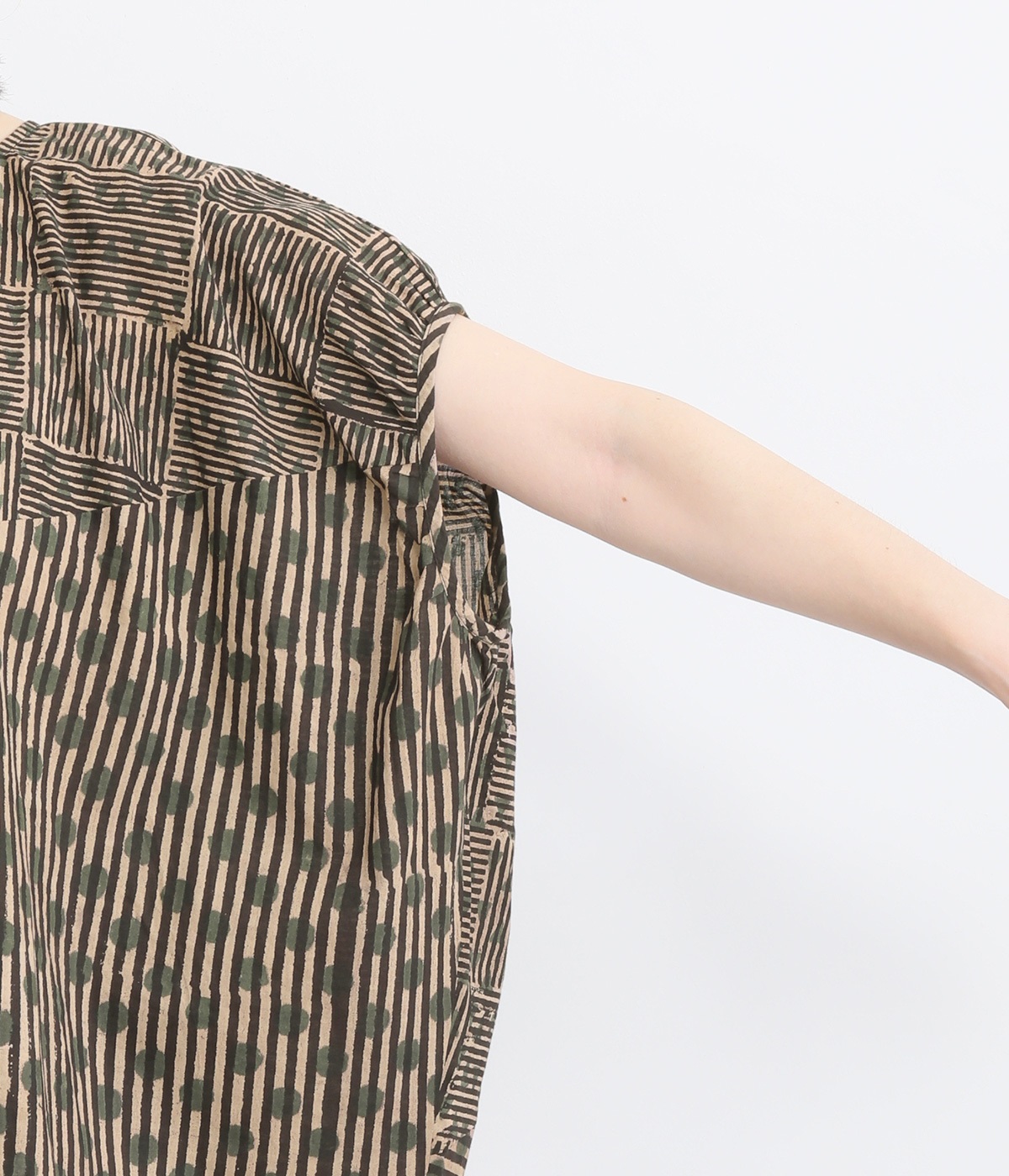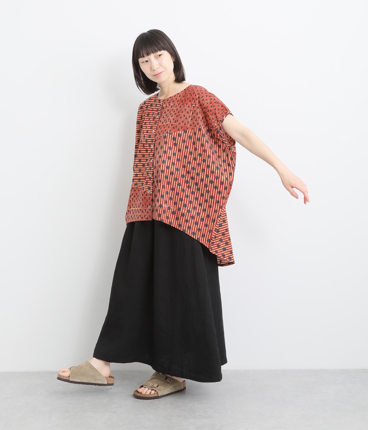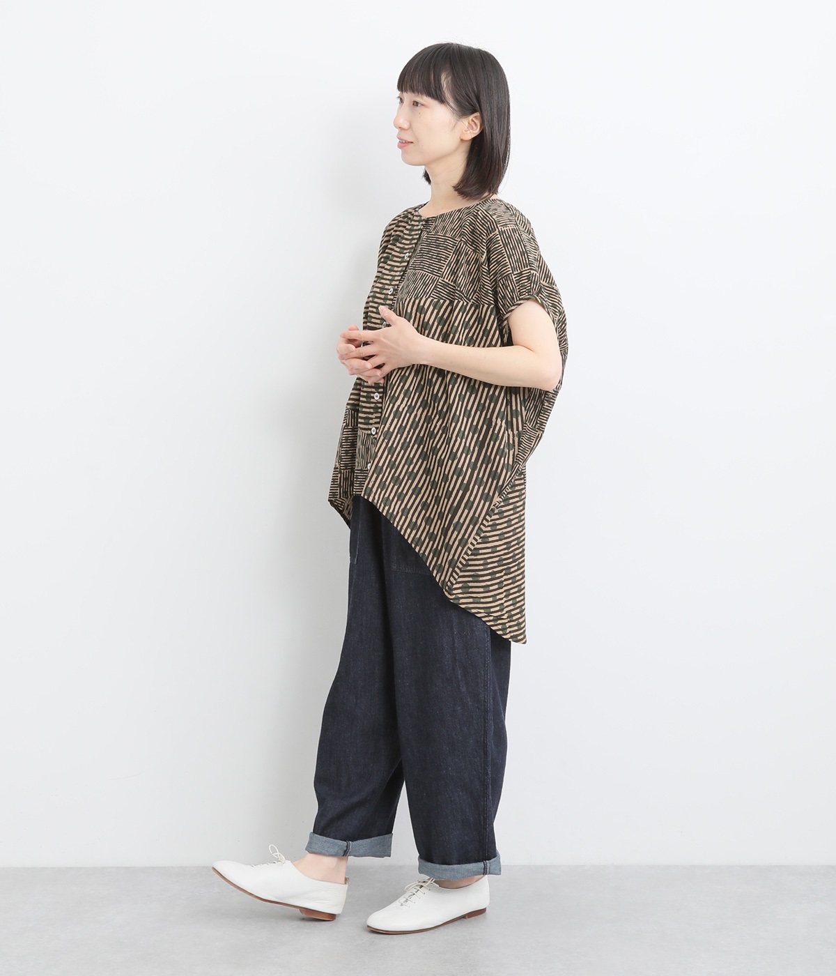 ドットや三角、ストライプなどシンプルなパターンを組み合わせた華やかなブラウスです。袖口にタックを入れて丸みを出し、ゆったりとしたシルエットに仕上げました。後ろ裾が長く、ヒップまわりをカバーしてくれるのも◎。