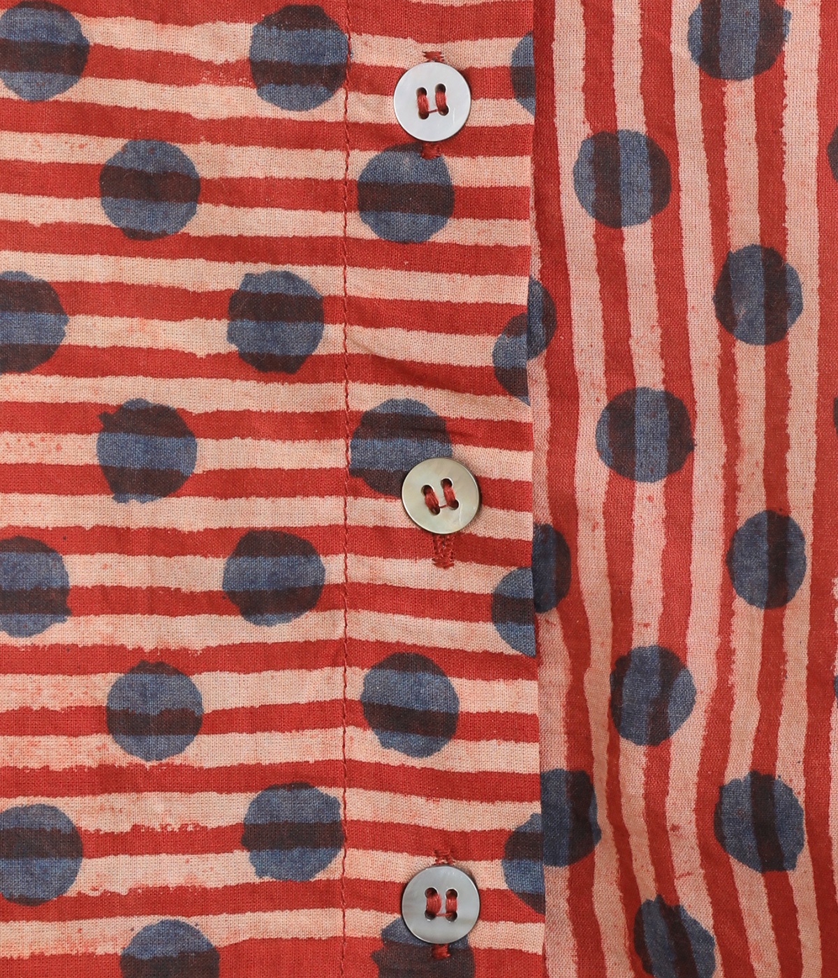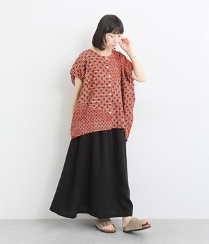 やや透ける、肌ざわりのよいやわらかなインドコットンを使用しました。深みのある色合いが特徴的な、インド伝統のブロックプリントを用いた総柄です。