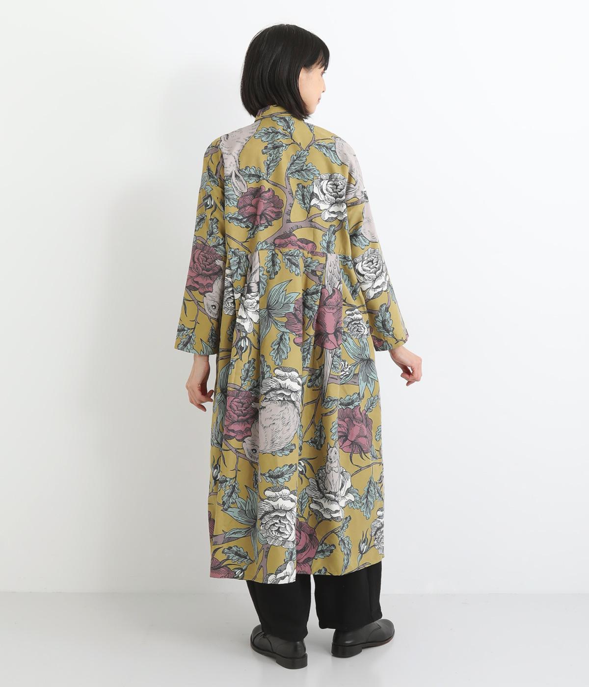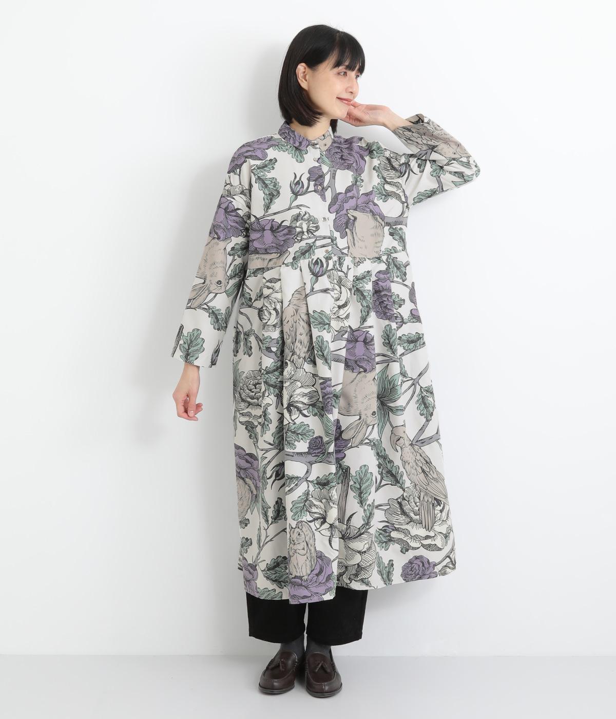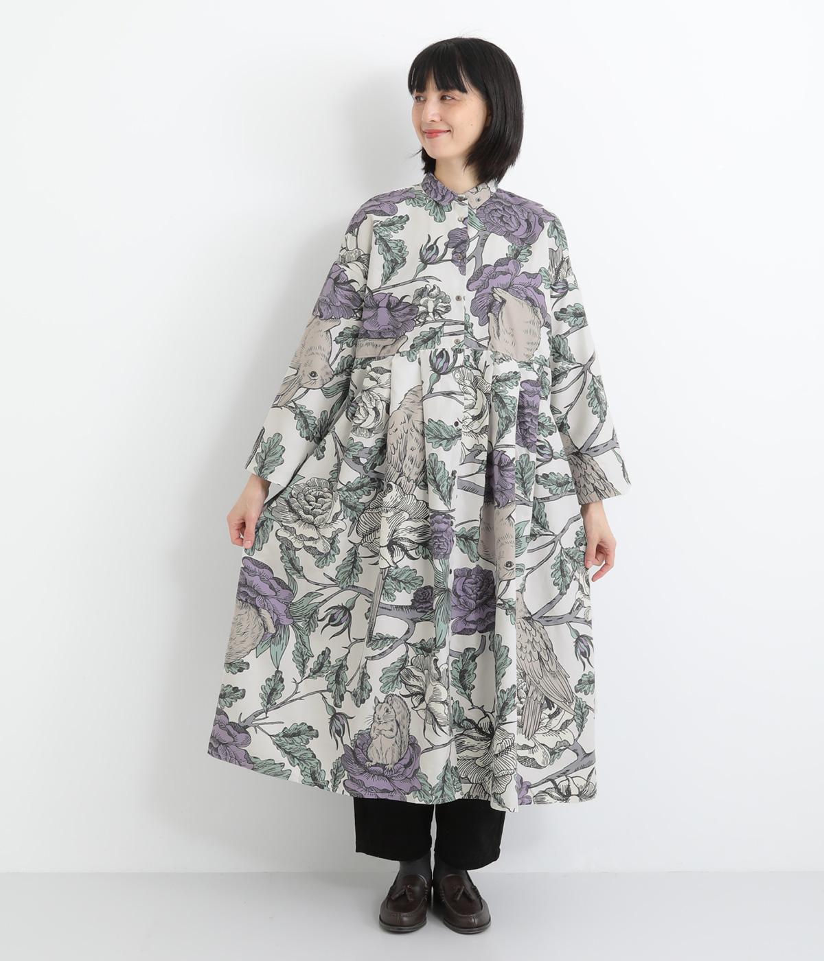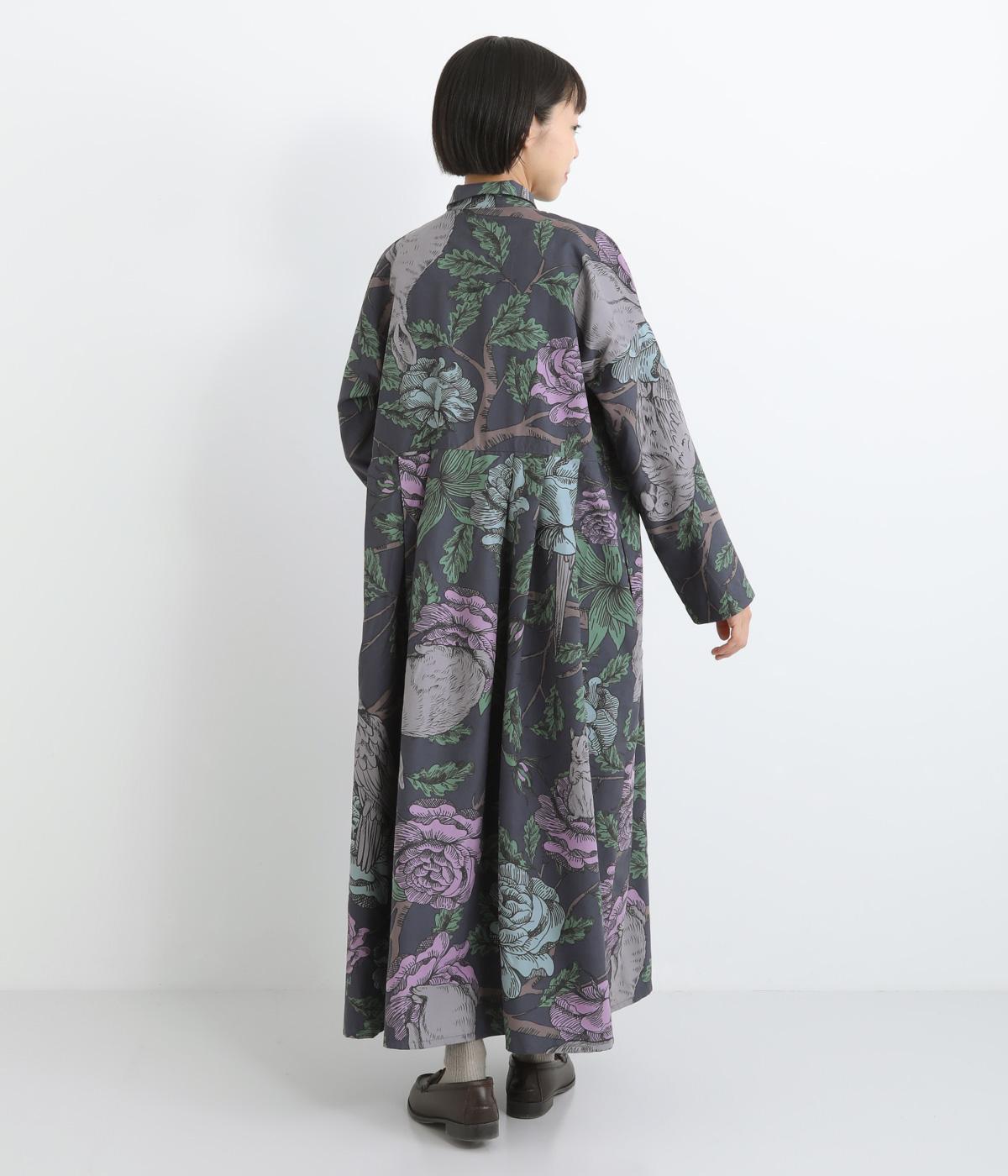 森の動物たちと花柄プリントを大胆にほどこした、雰囲気のある着映え力の高いワンピース。ドロップショルダーにウエストタック入りのゆったりとしたシルエットです。前あきなのでアウターとして軽やかに羽織るのもおすすめ。