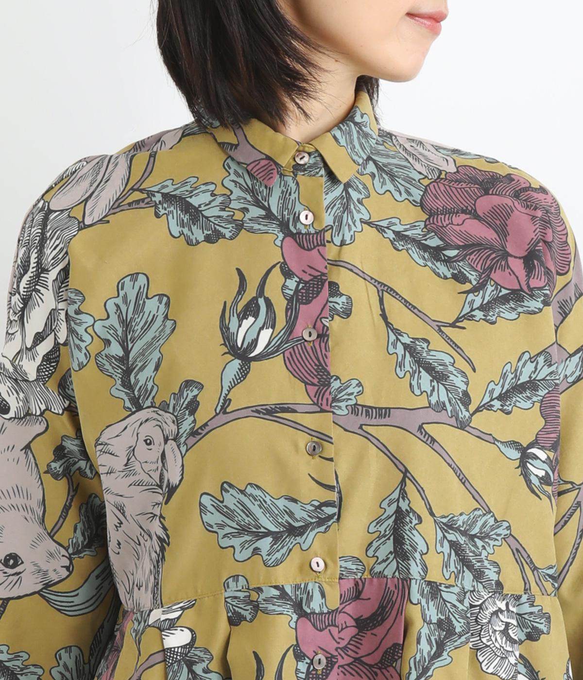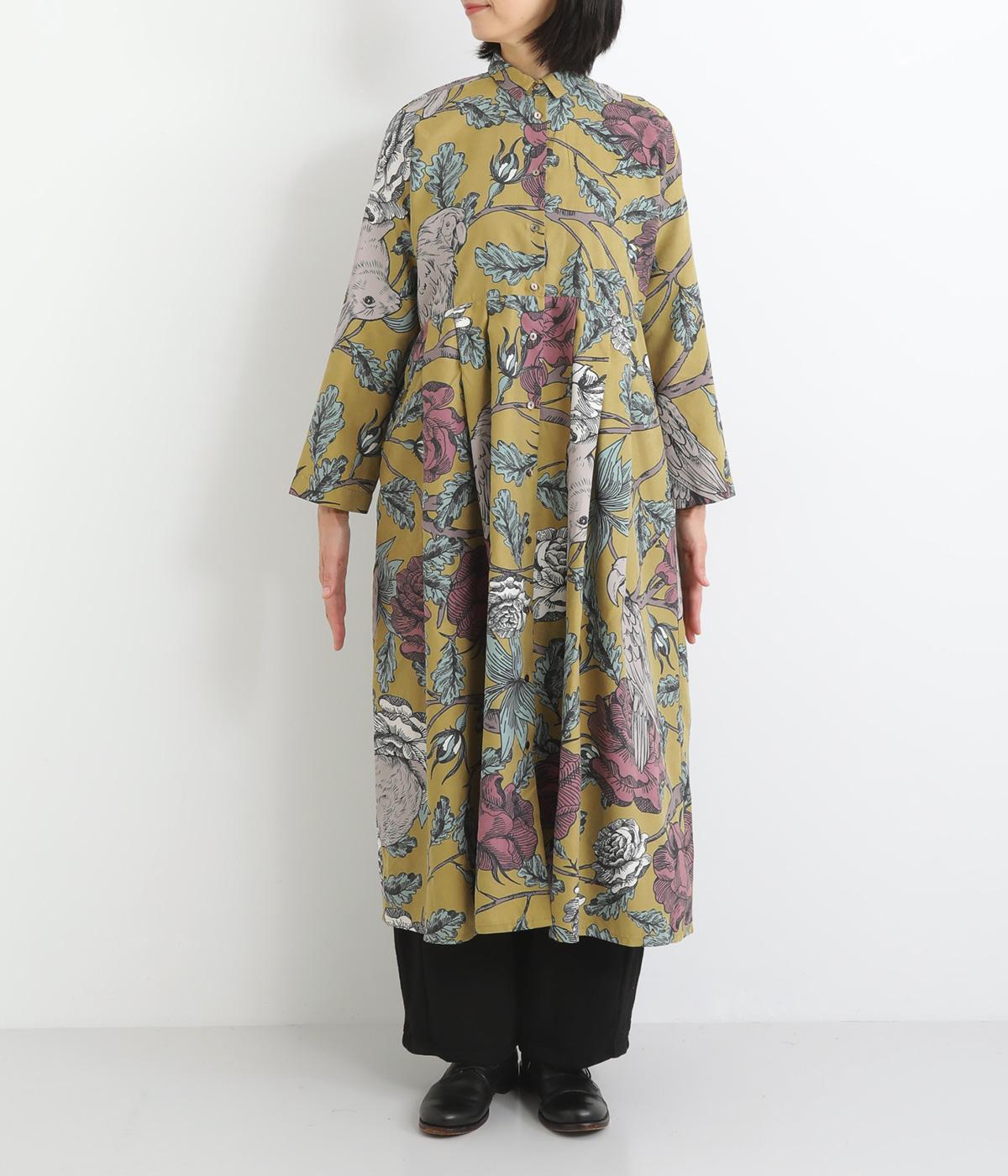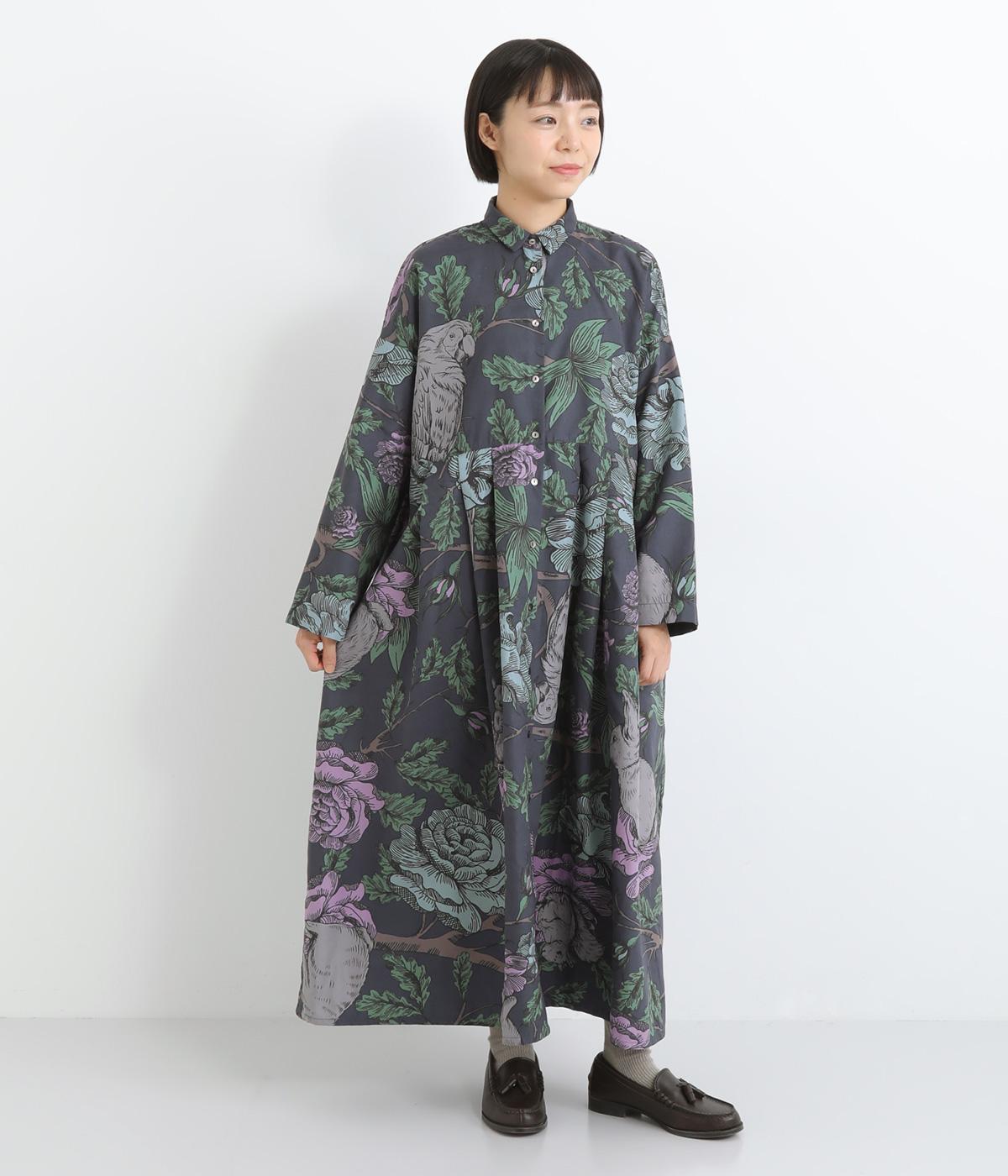 森の動物たちと花柄プリントを大胆にほどこした、雰囲気のある着映え力の高いワンピース。ドロップショルダーにウエストタック入りのゆったりとしたシルエットです。前あきなのでアウターとして軽やかに羽織るのもおすすめ。