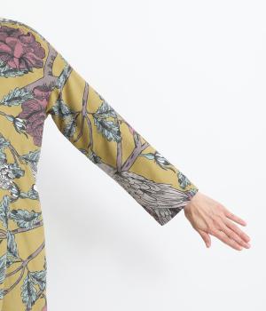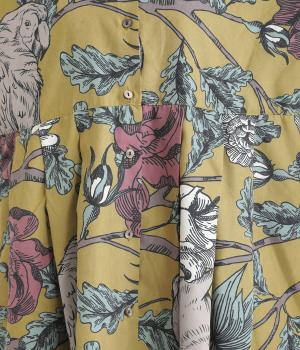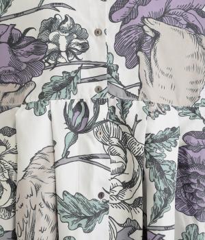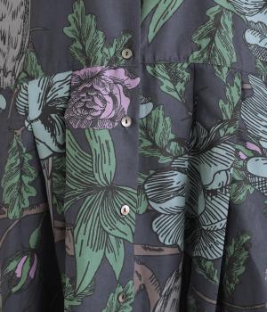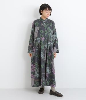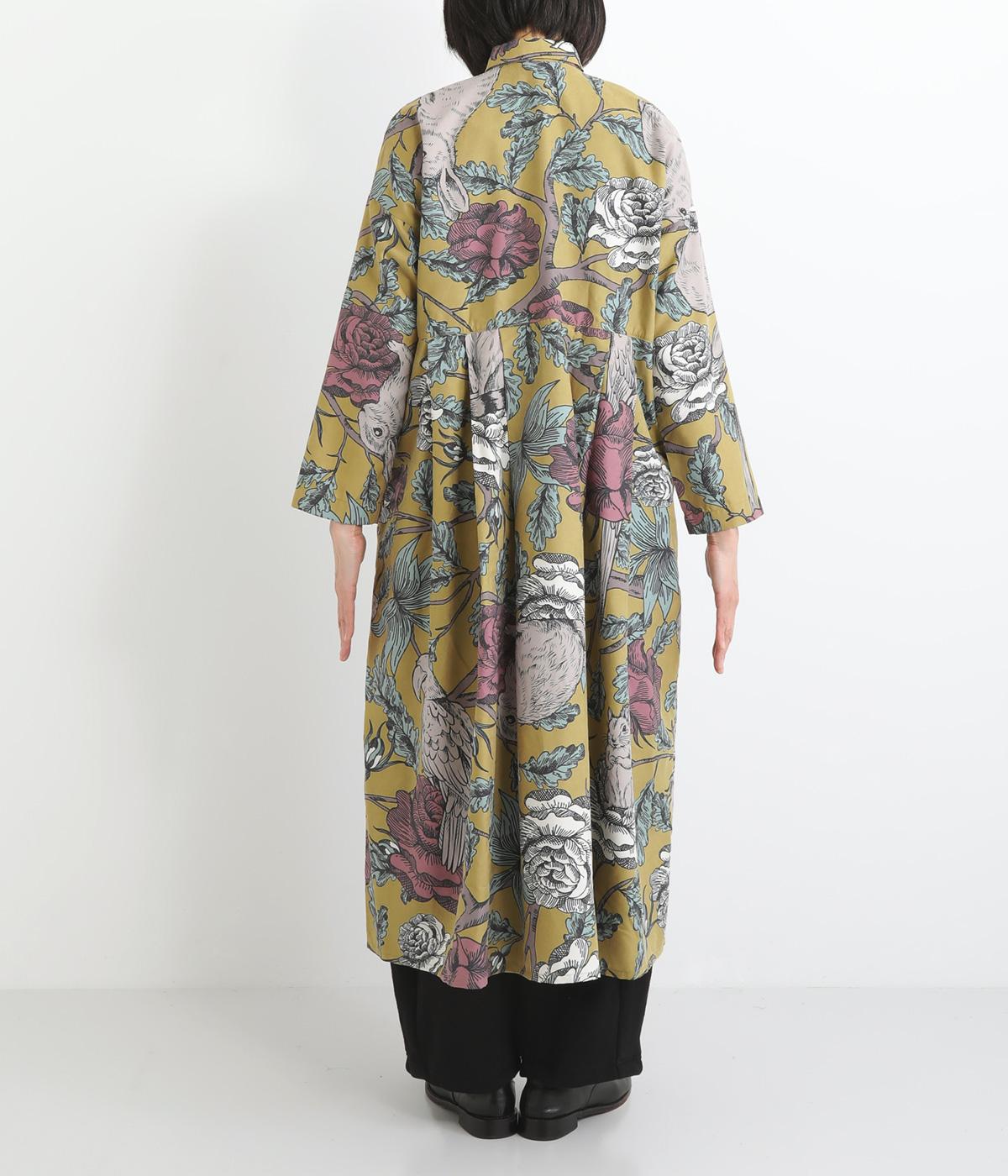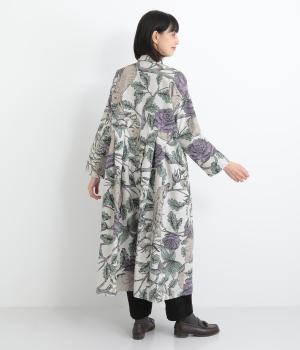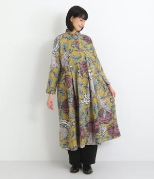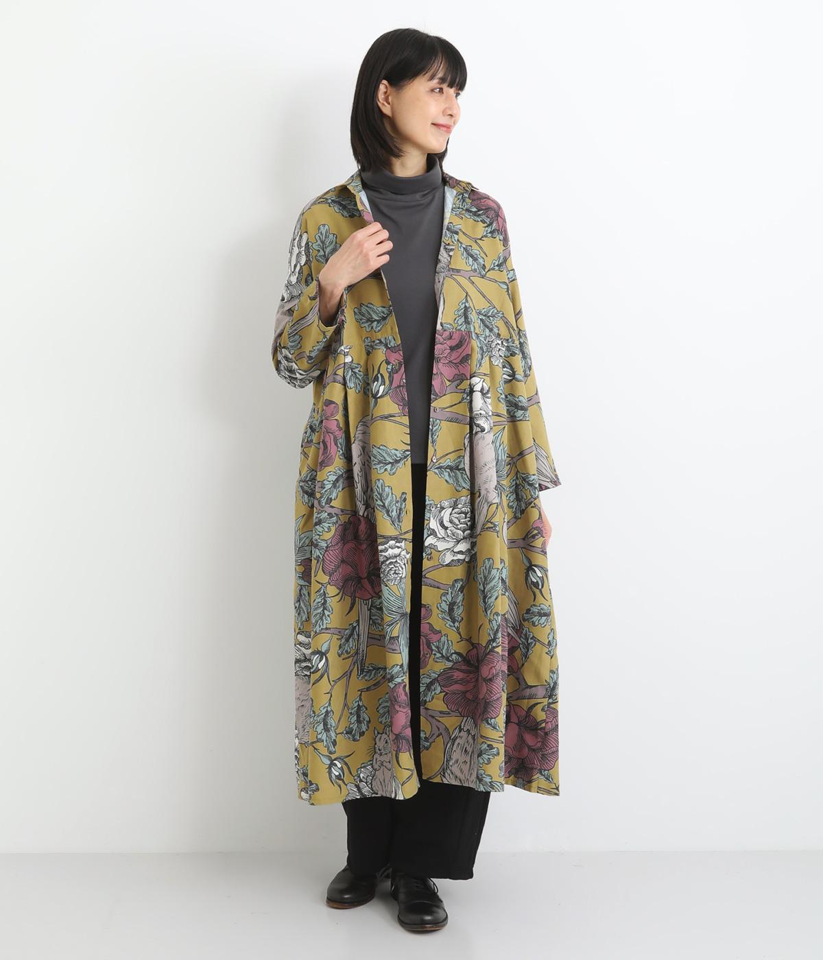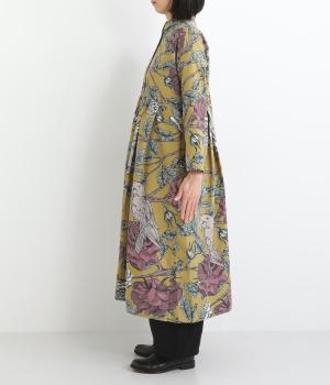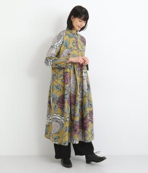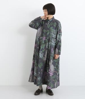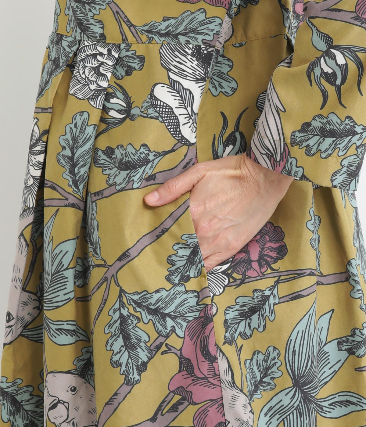 森の動物たちと花柄プリントを大胆にほどこした、雰囲気のある着映え力の高いワンピース。ドロップショルダーにウエストタック入りのゆったりとしたシルエットです。前あきなのでアウターとして軽やかに羽織るのもおすすめ。