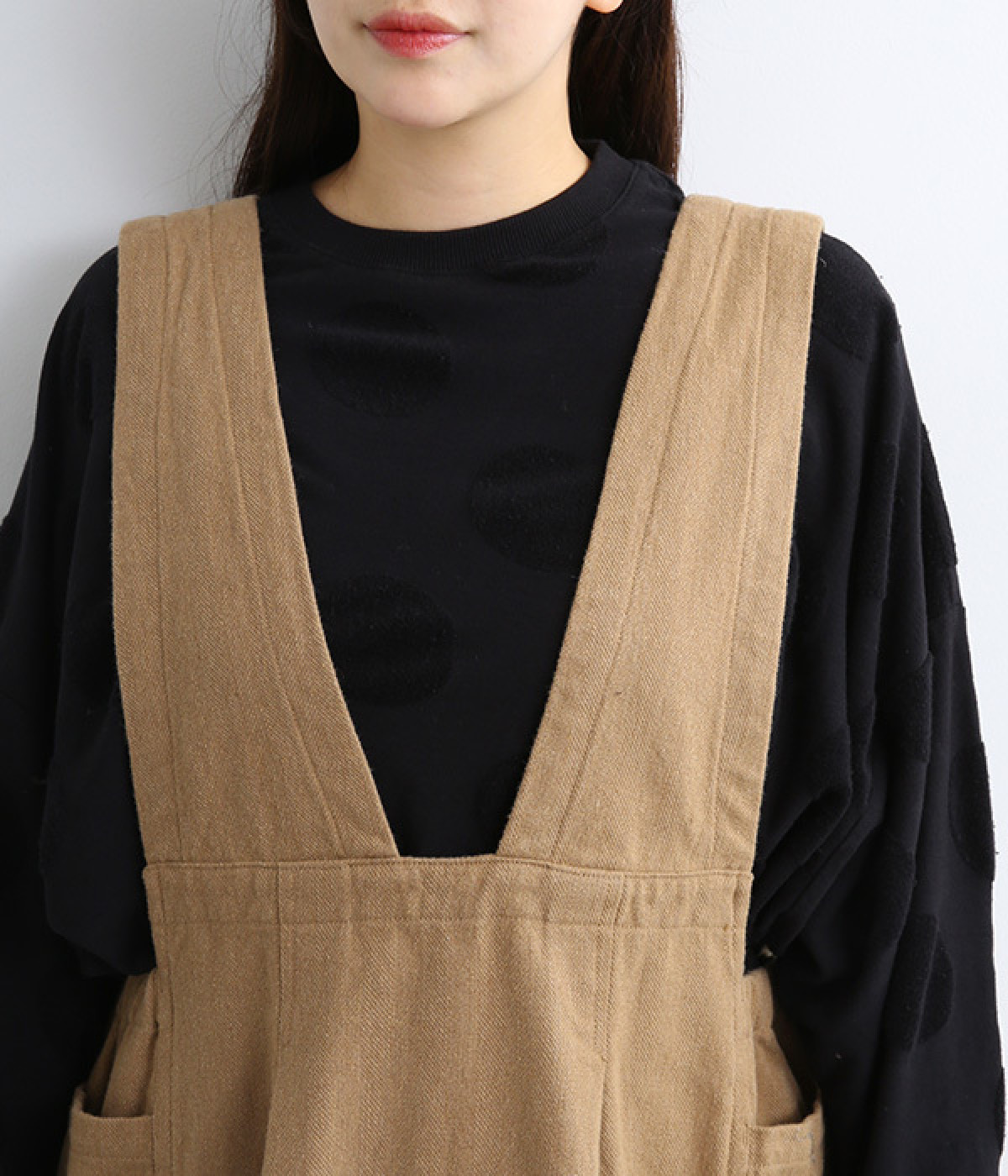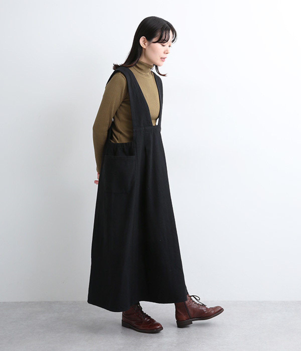 胸当てを下げたリラクシーな雰囲気の仕立て