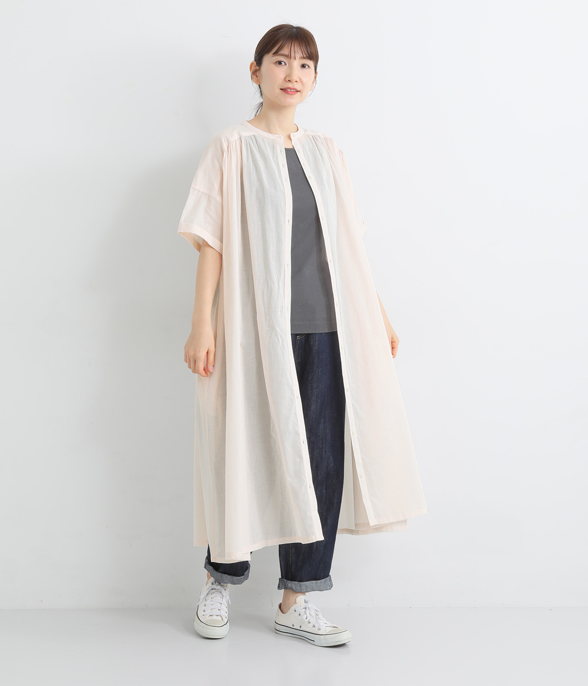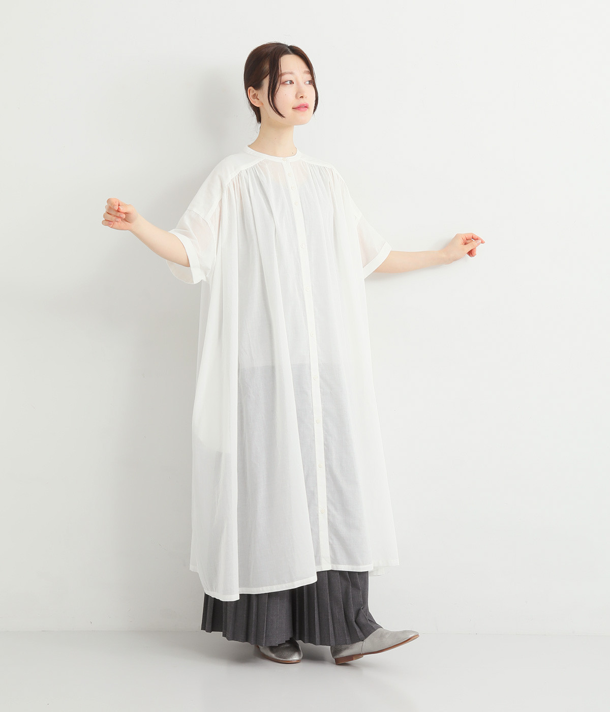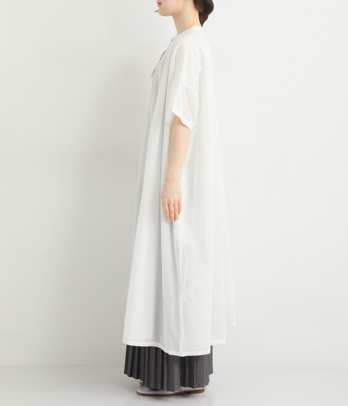 細番手の糸で織られた薄手のローン生地を使用し、涼やかな見た目と軽い着心地を実現。透け感たっぷりに仕上がっているので、重ね着や羽織りで取り入れてもおしゃれが重たくなりません。