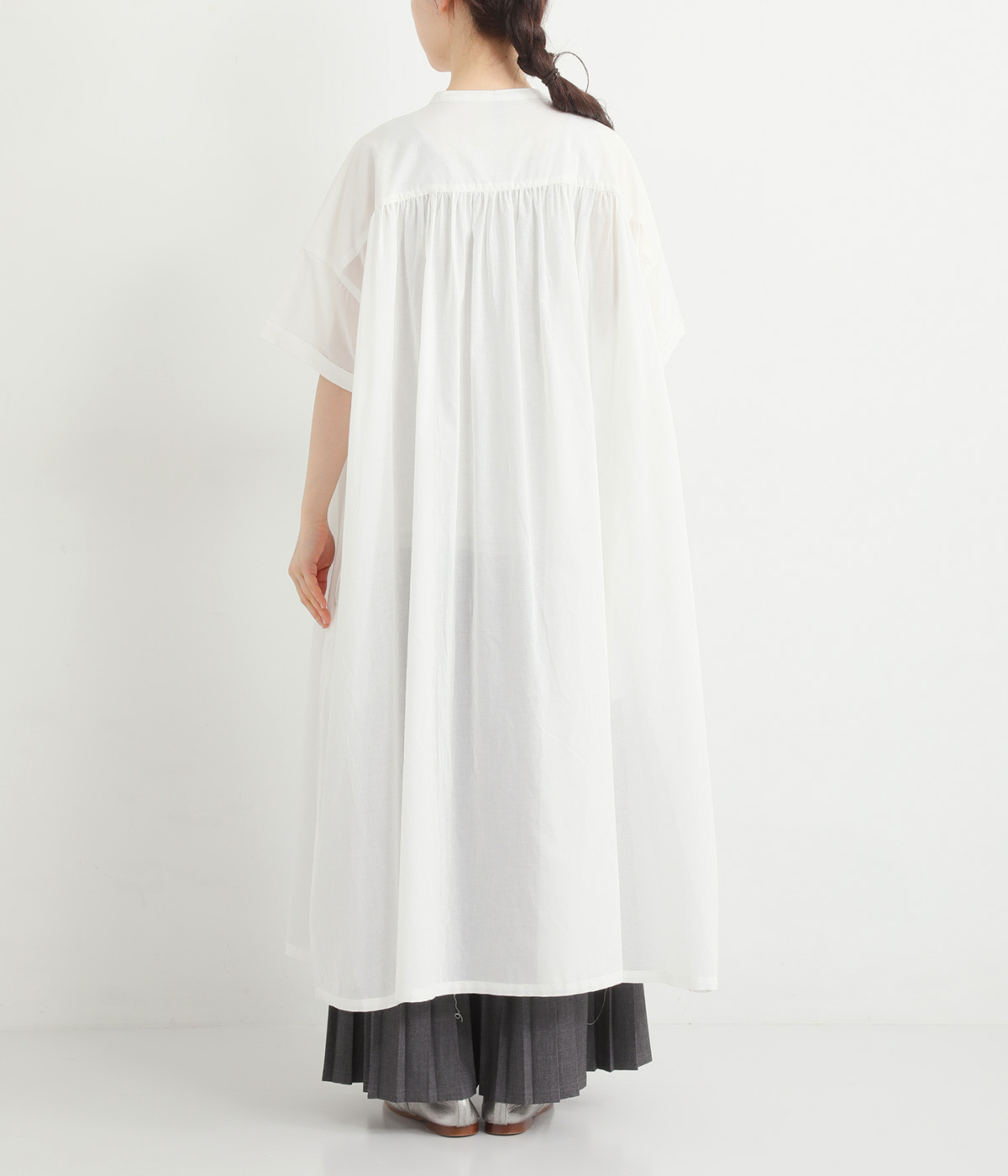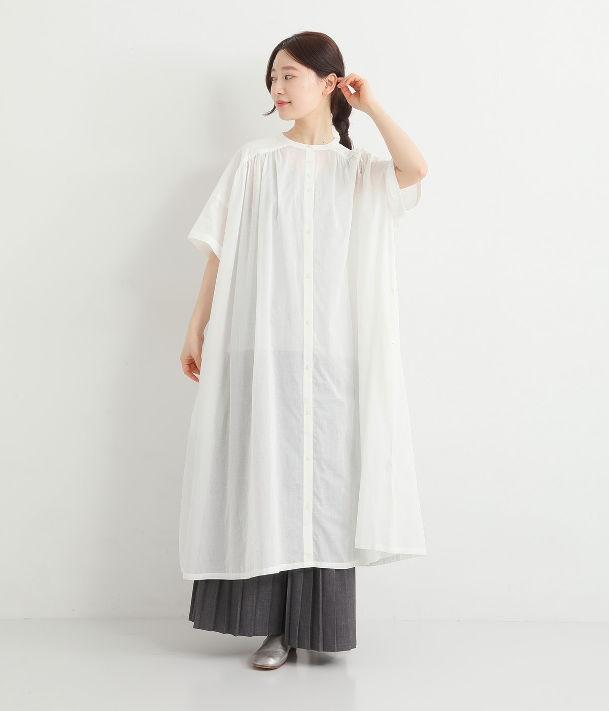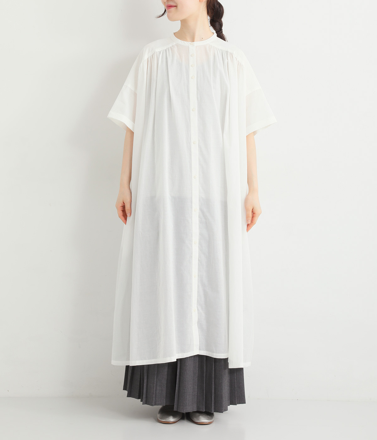 細番手の糸で織られた薄手のローン生地を使用し、涼やかな見た目と軽い着心地を実現。透け感たっぷりに仕上がっているので、重ね着や羽織りで取り入れてもおしゃれが重たくなりません。