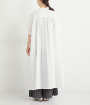 ショルダーラインやバックヨークにギャザーをたっぷりと入れて、ふんわりしたボリュームのあるシルエットに。袖口は折り返し、ほどよくラフなニュアンスを添えています。前立てのボタン配置にこだわった個性的な仕上がりに注目を。
