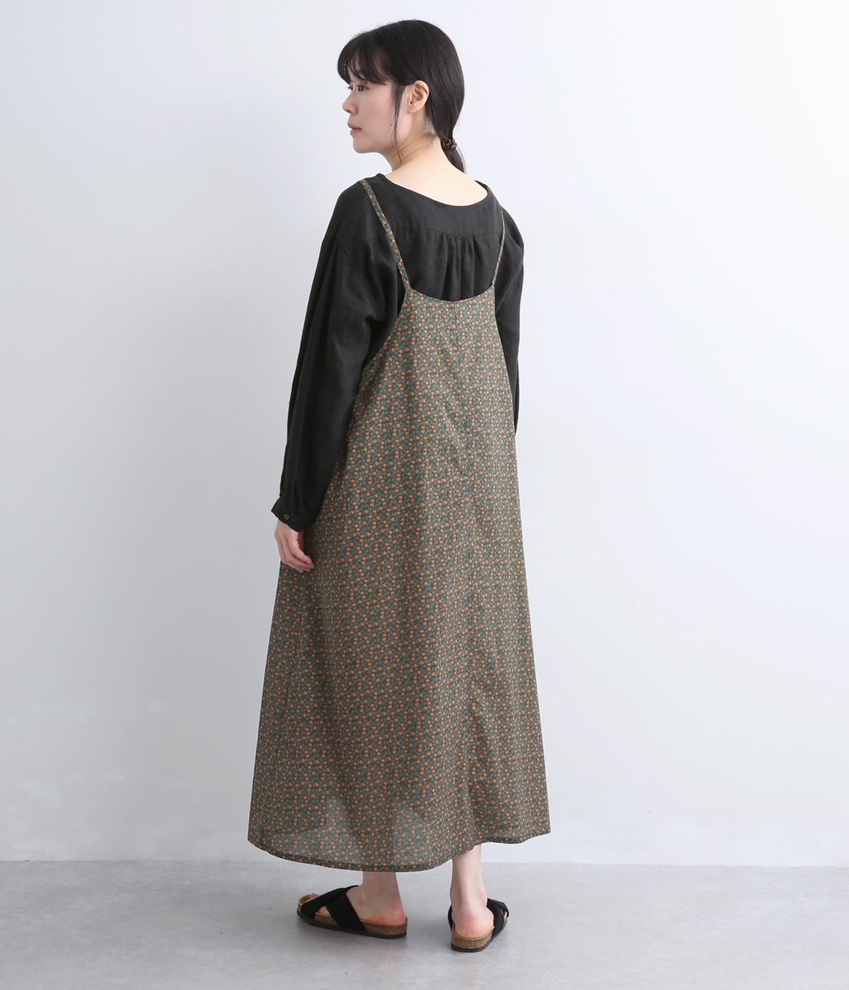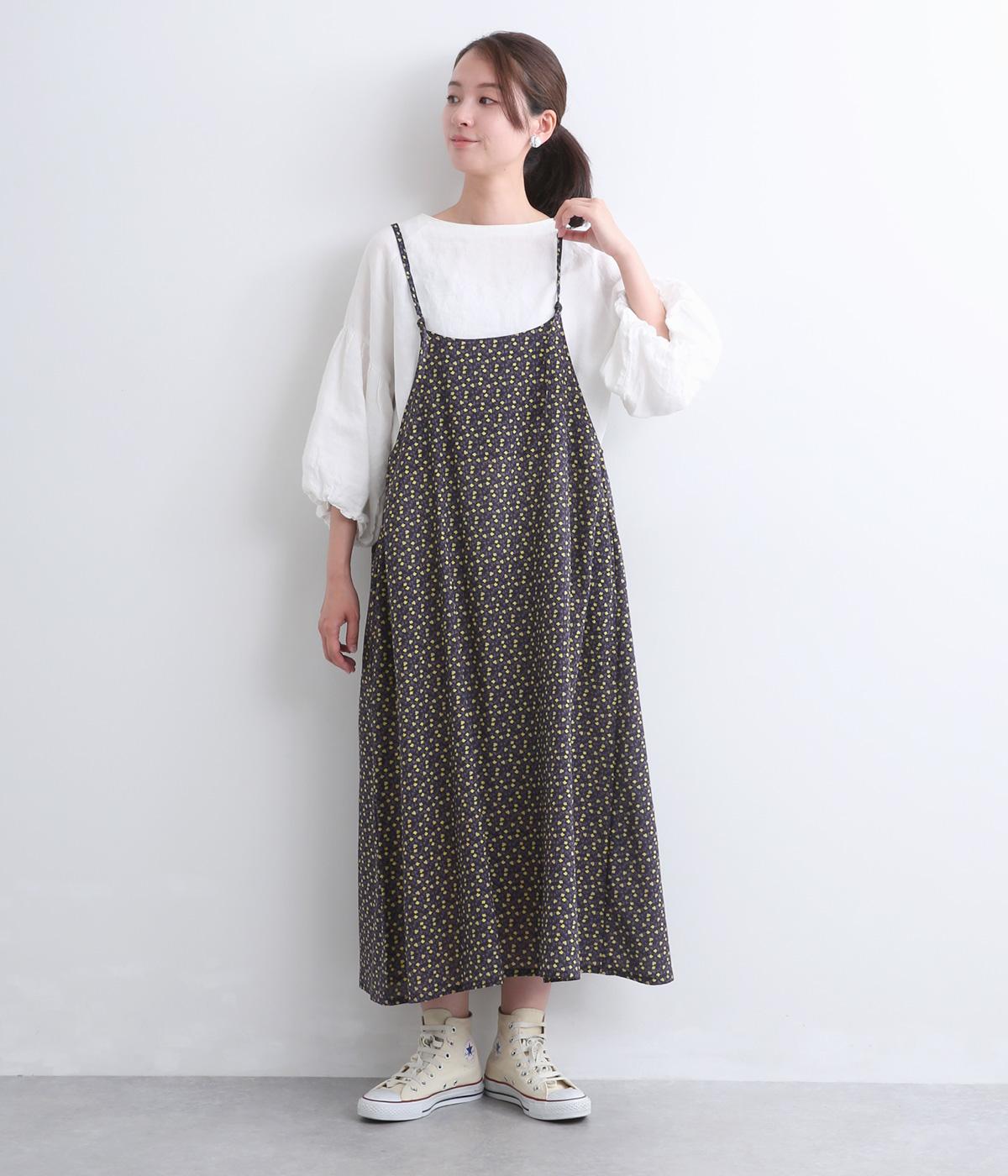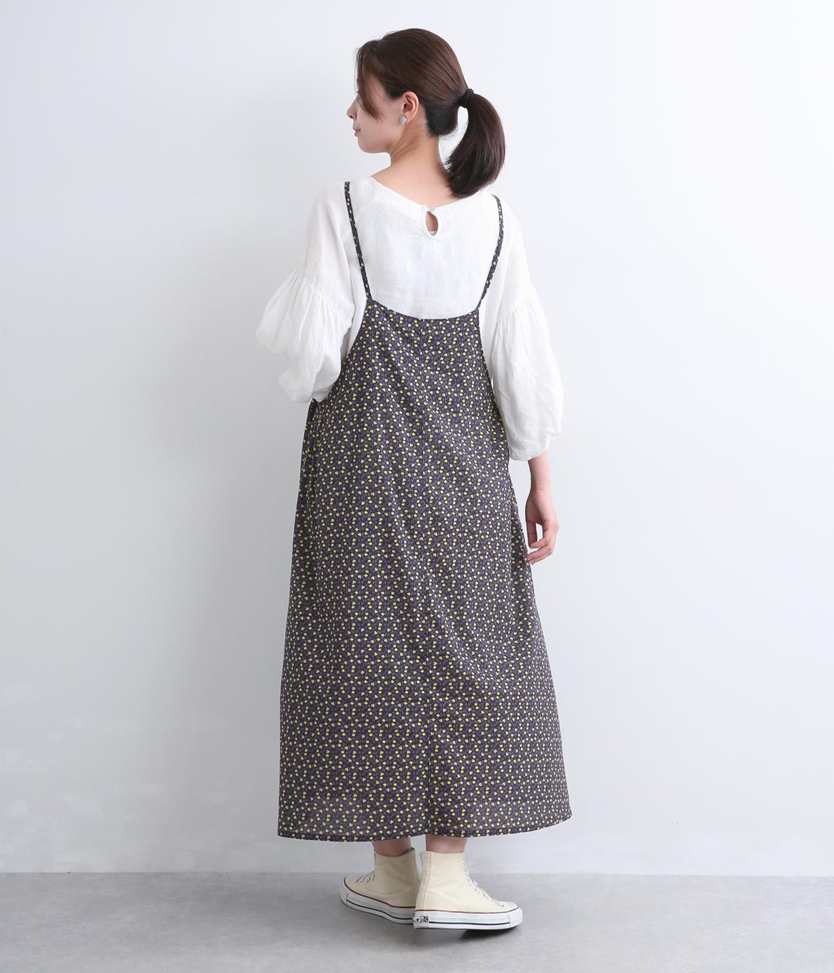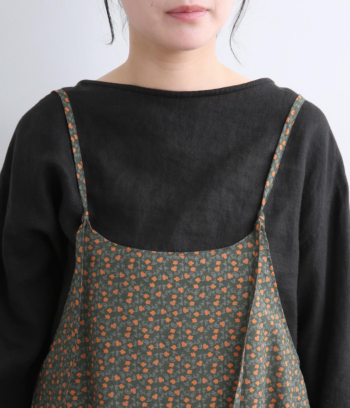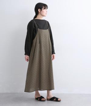 リネン裾ボーダーピンタック&胸・裾レースフリルギャザー2wayキャミワンピース