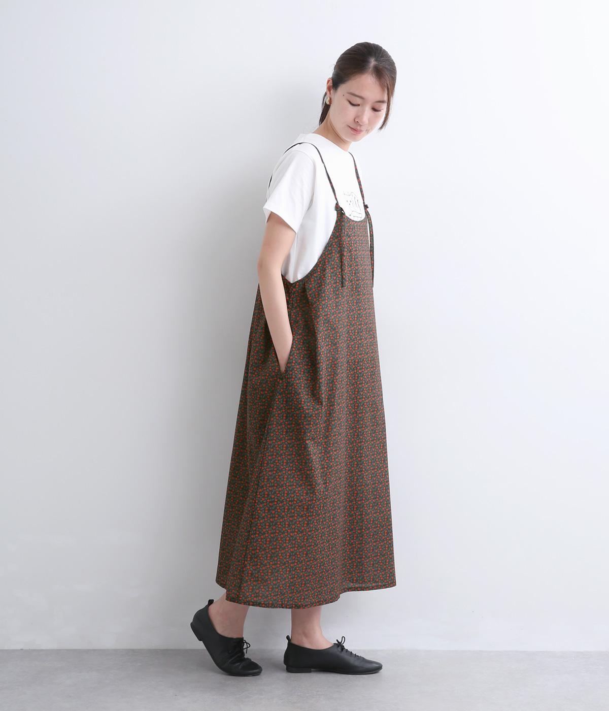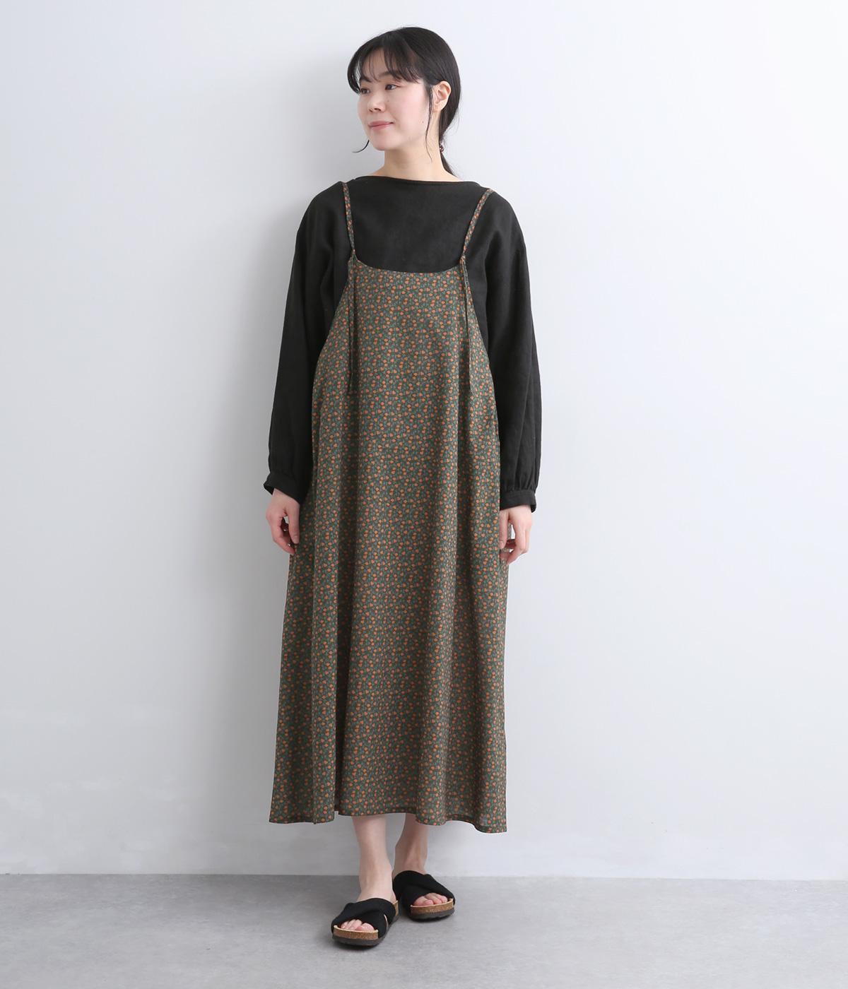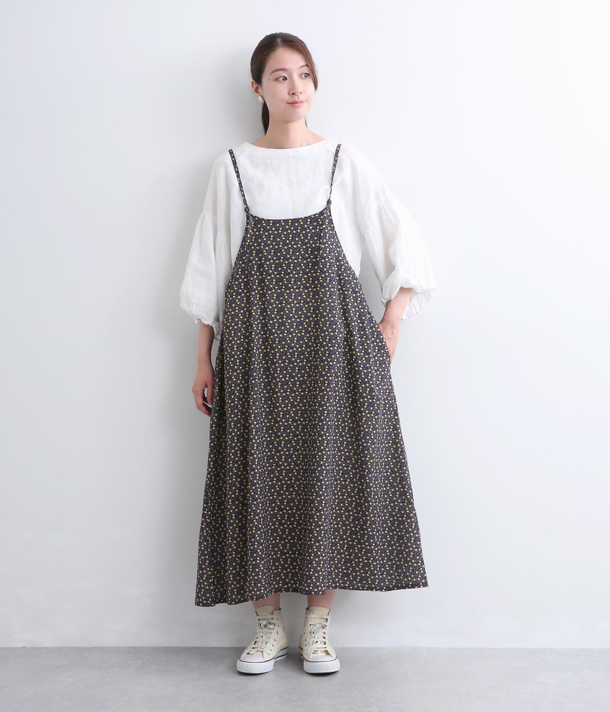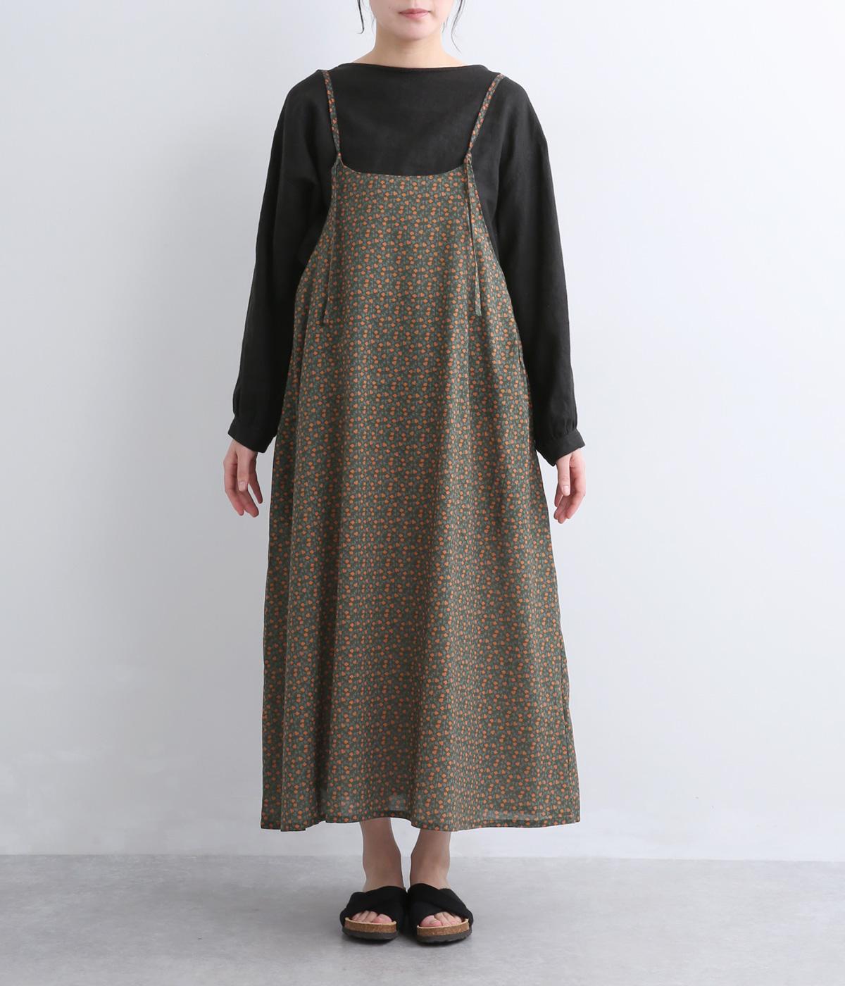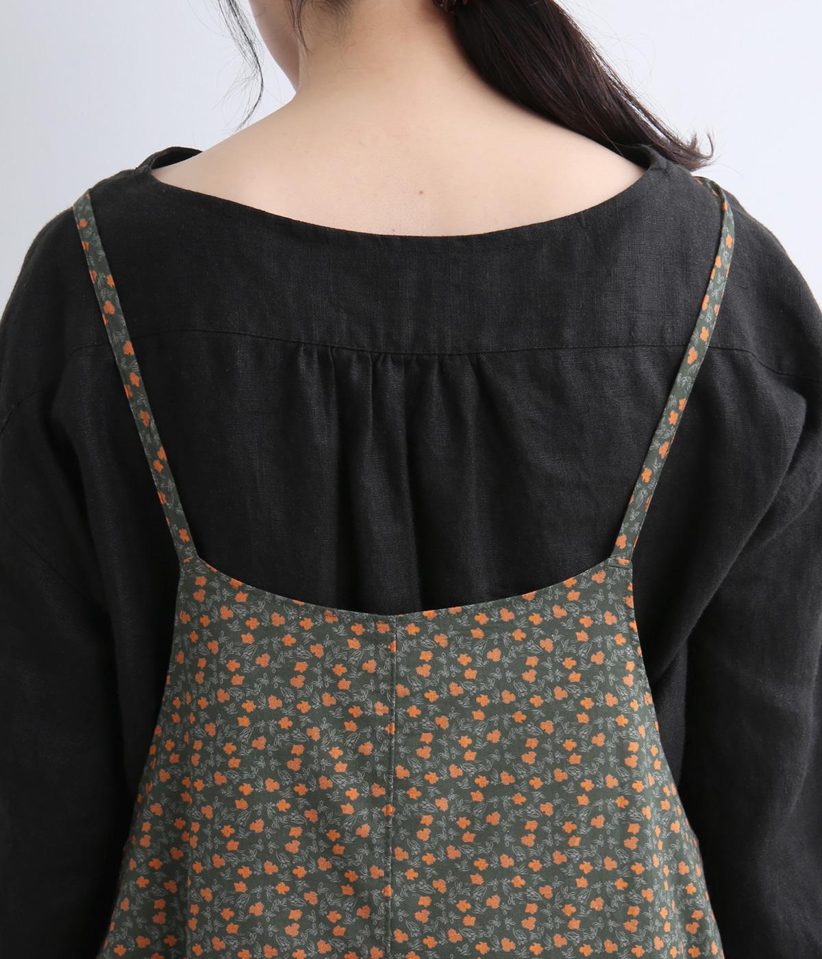 リネン裾ボーダーピンタック&胸・裾レースフリルギャザー2wayキャミワンピース