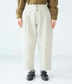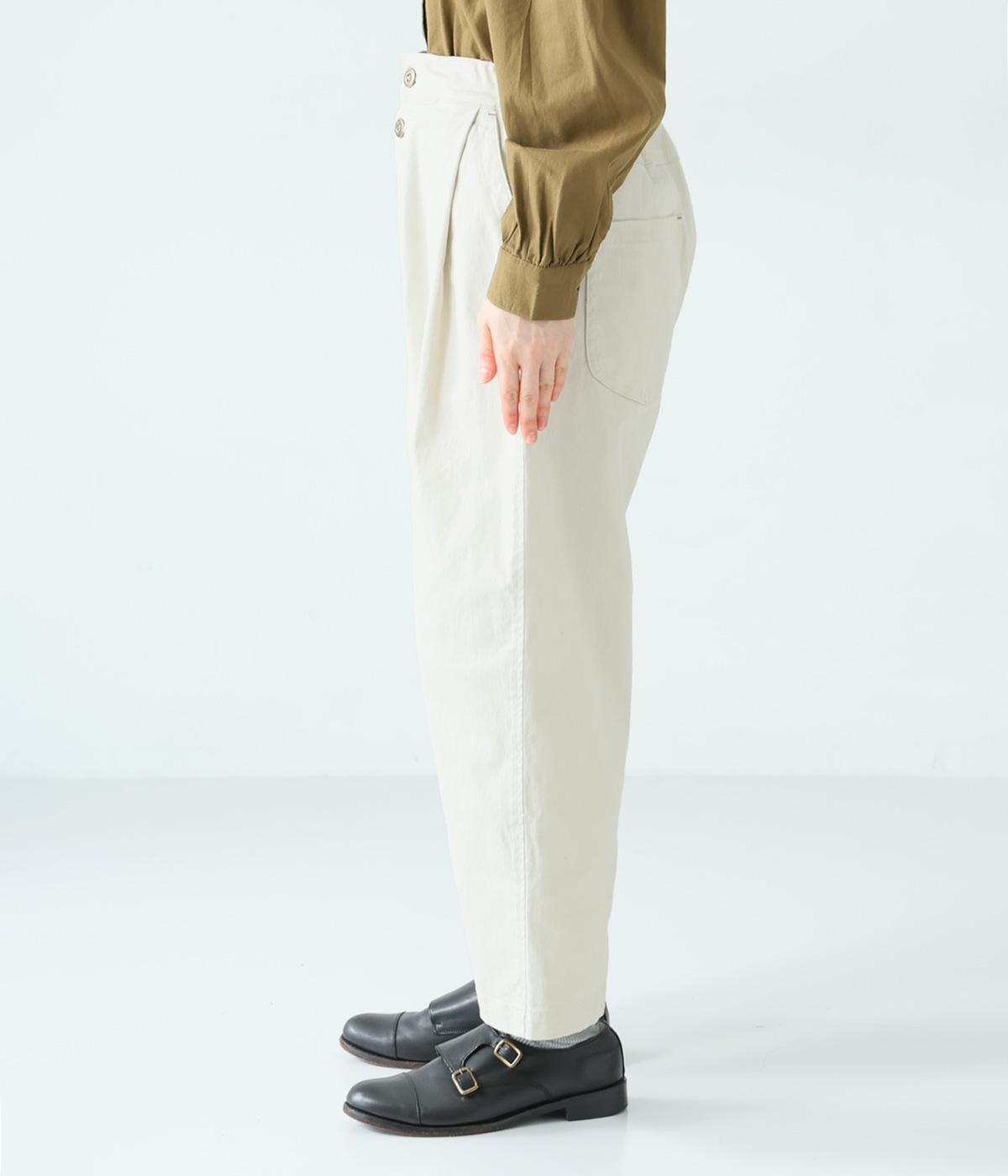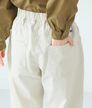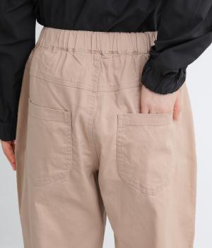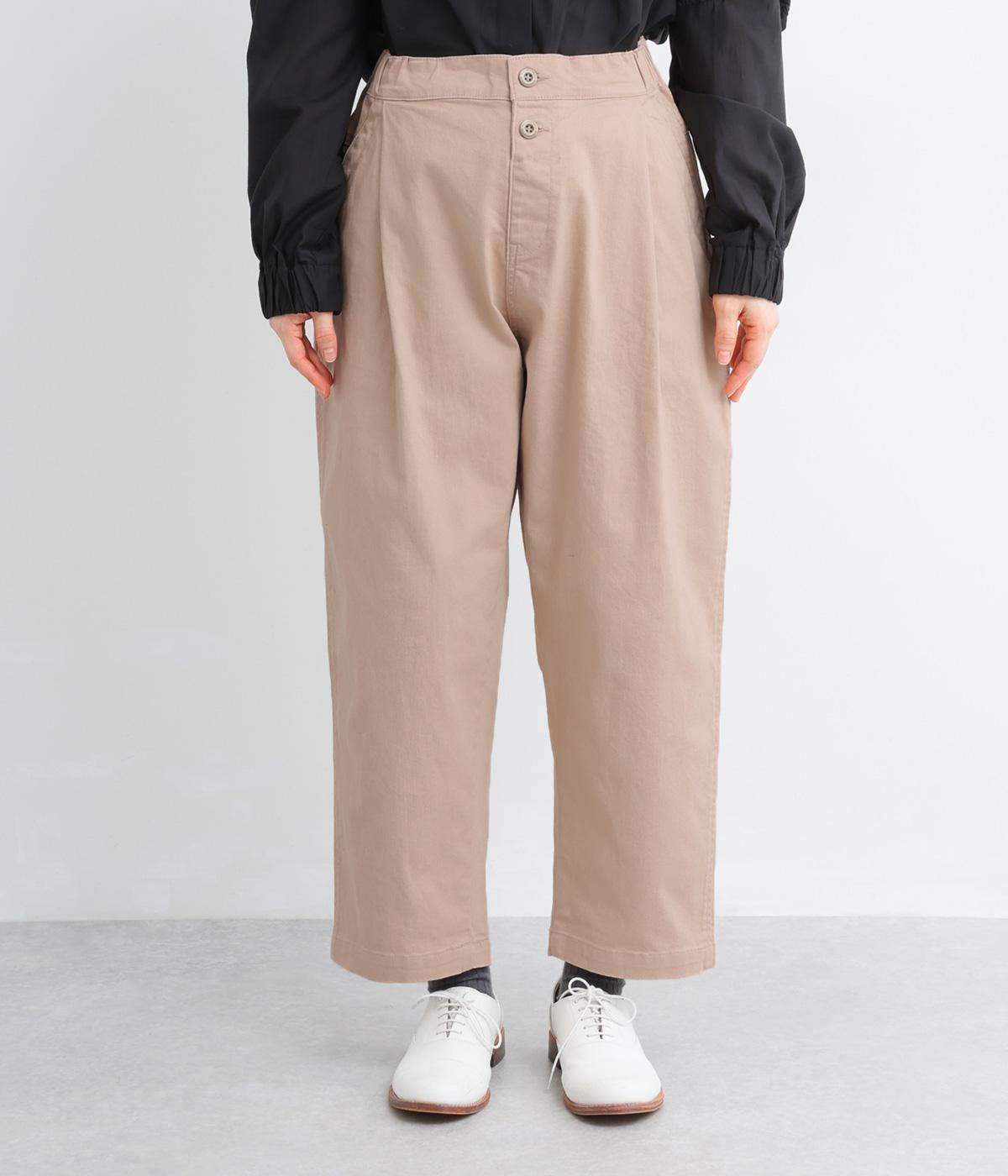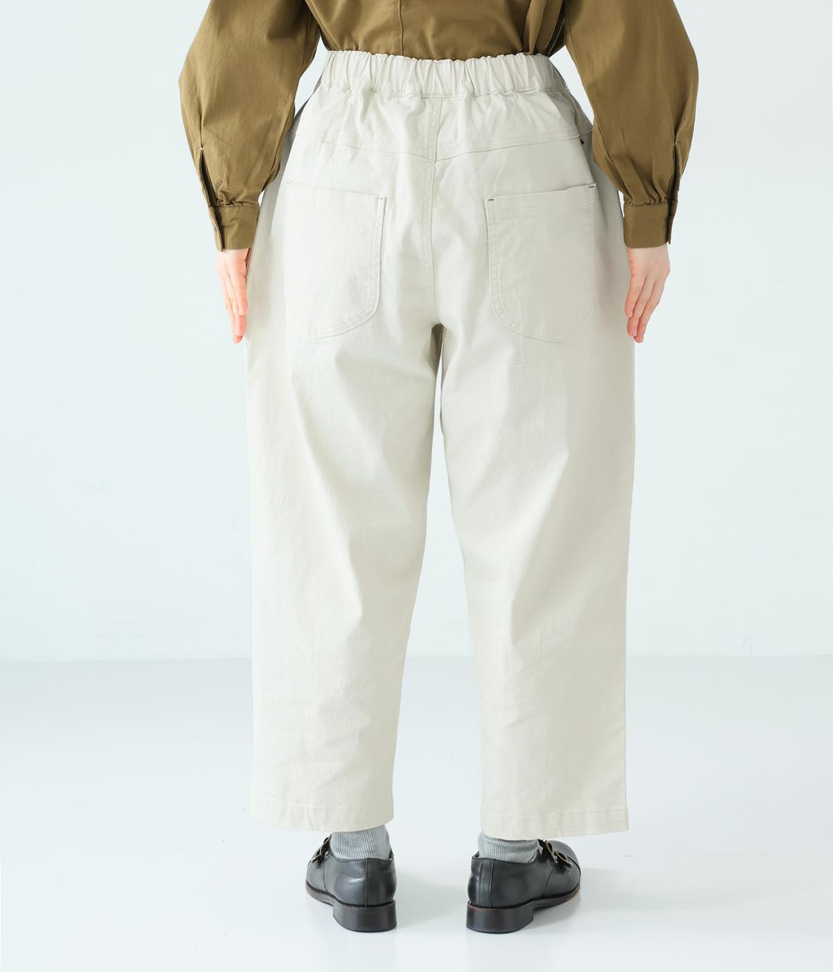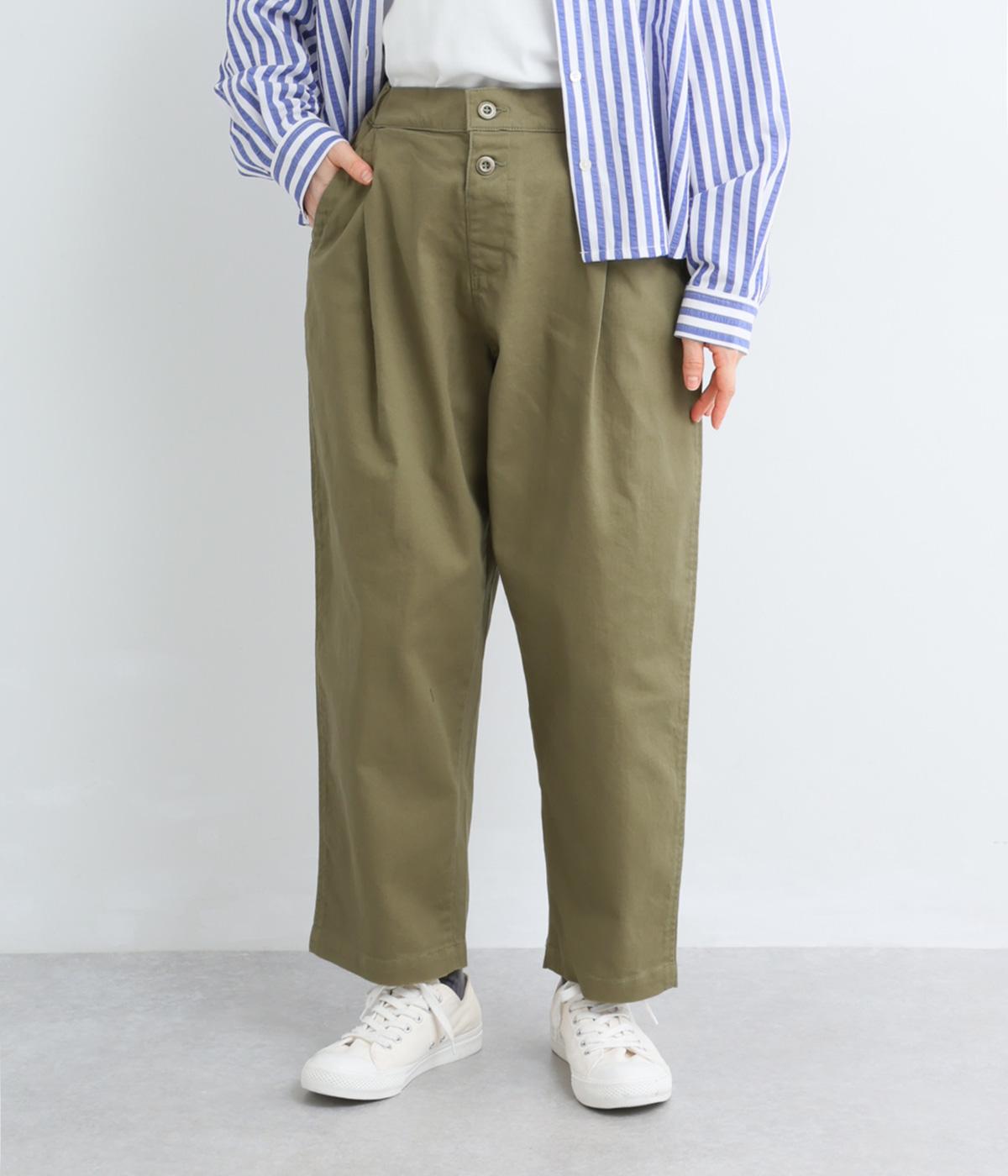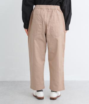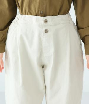 腰まわりのラインを拾いにくく、裾に向かって緩やかにしぼまるシルエットです。2つボタン仕様のハイウエストで、トップスインしてもきれいに決まります。ウエストのうしろはゴム仕様で、サイズ調節ができる内紐付きです。