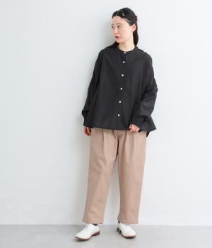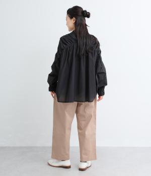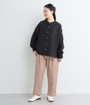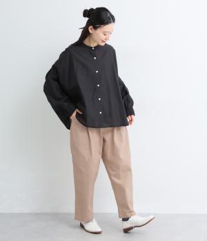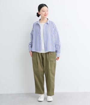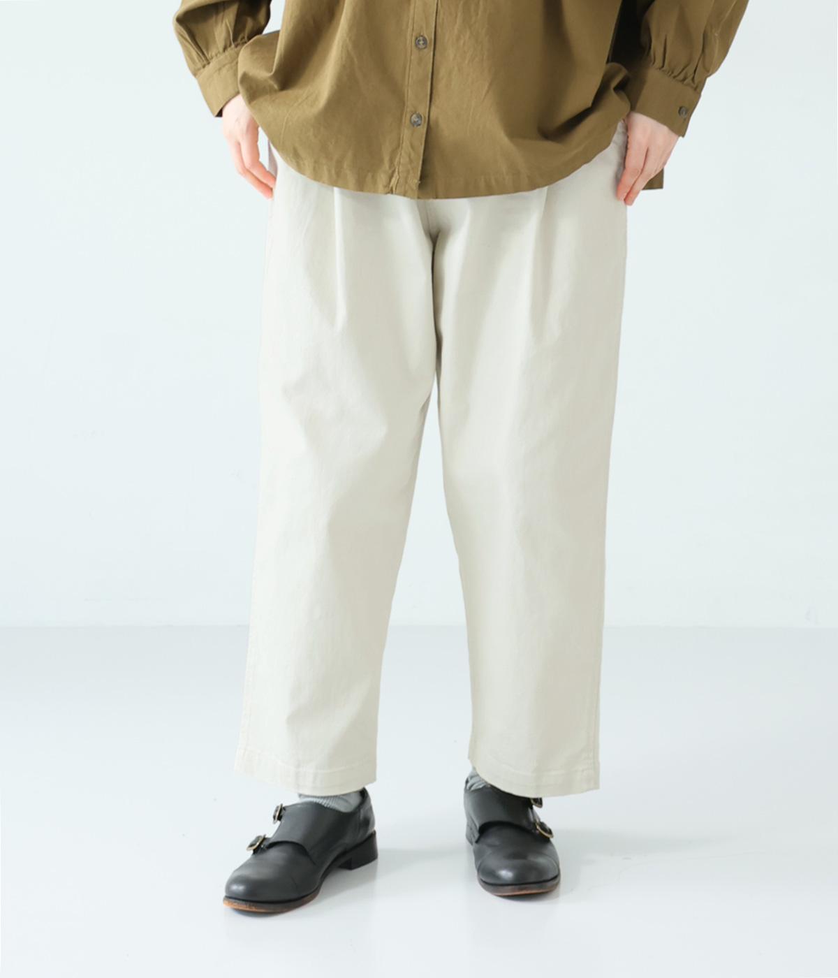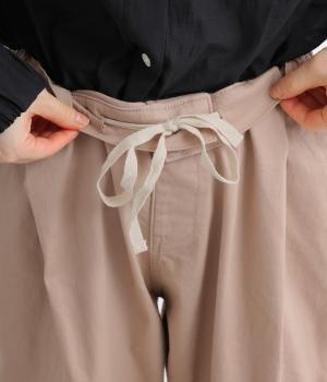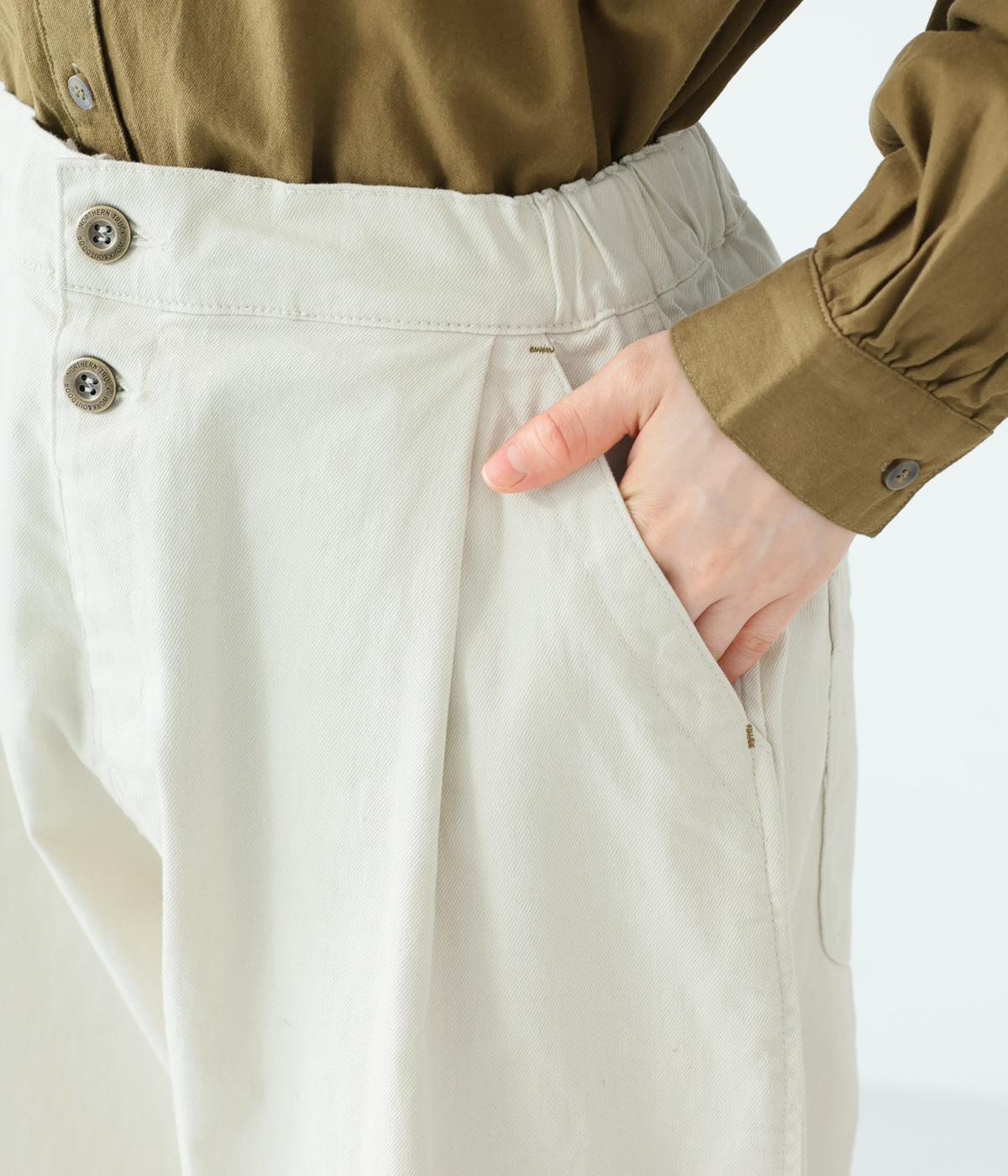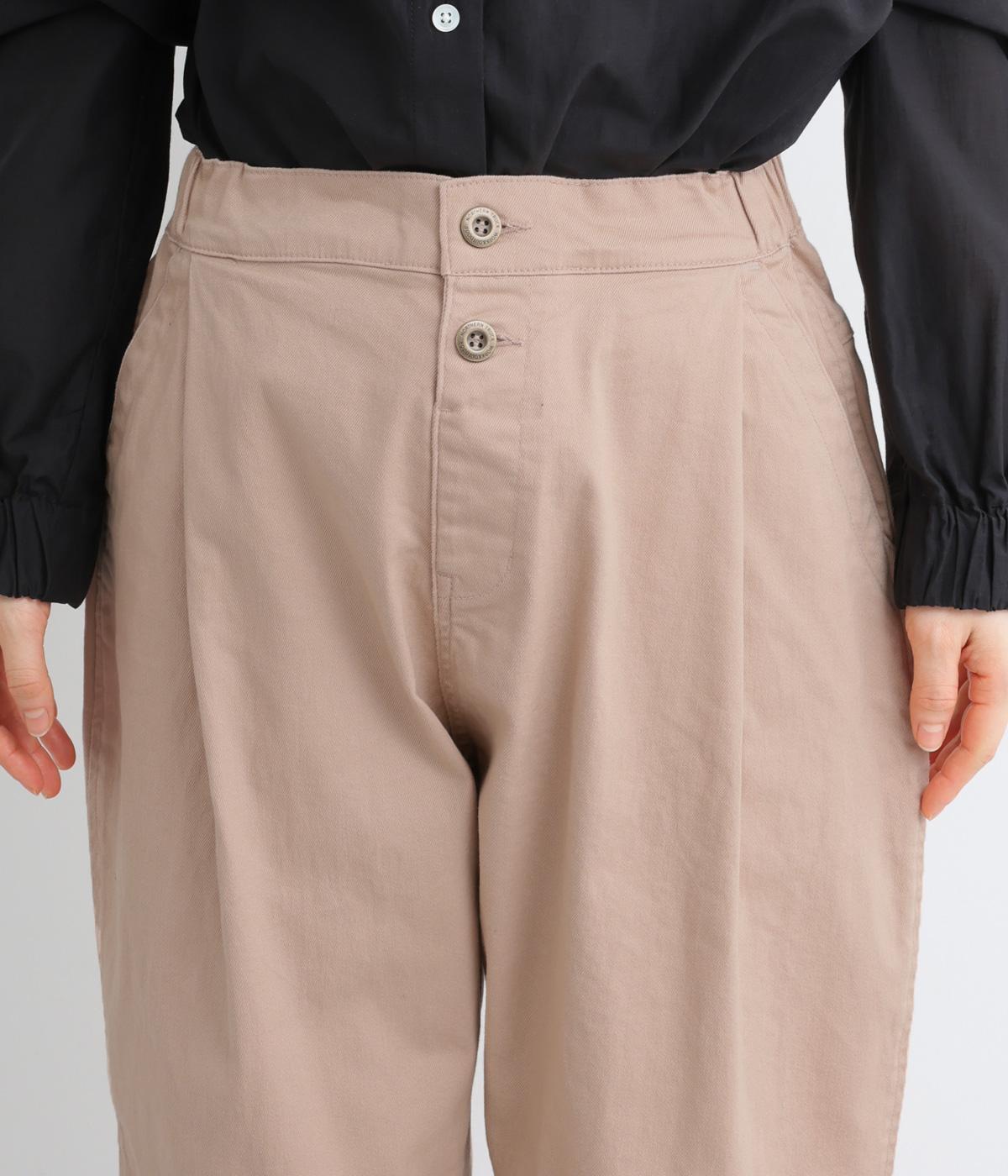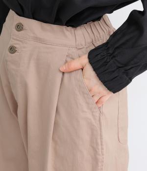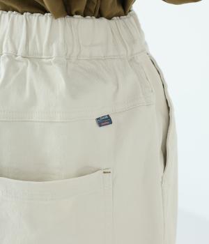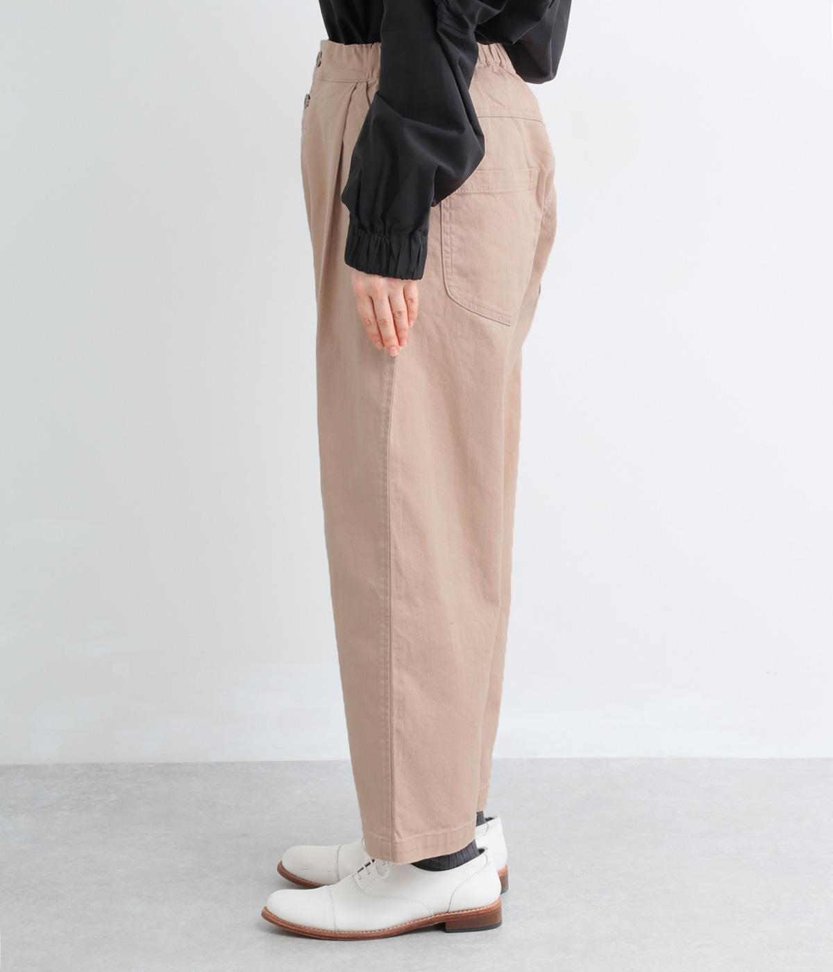 腰まわりのラインを拾いにくく、裾に向かって緩やかにしぼまるシルエットです。2つボタン仕様のハイウエストで、トップスインしてもきれいに決まります。ウエストのうしろはゴム仕様で、サイズ調節ができる内紐付きです。