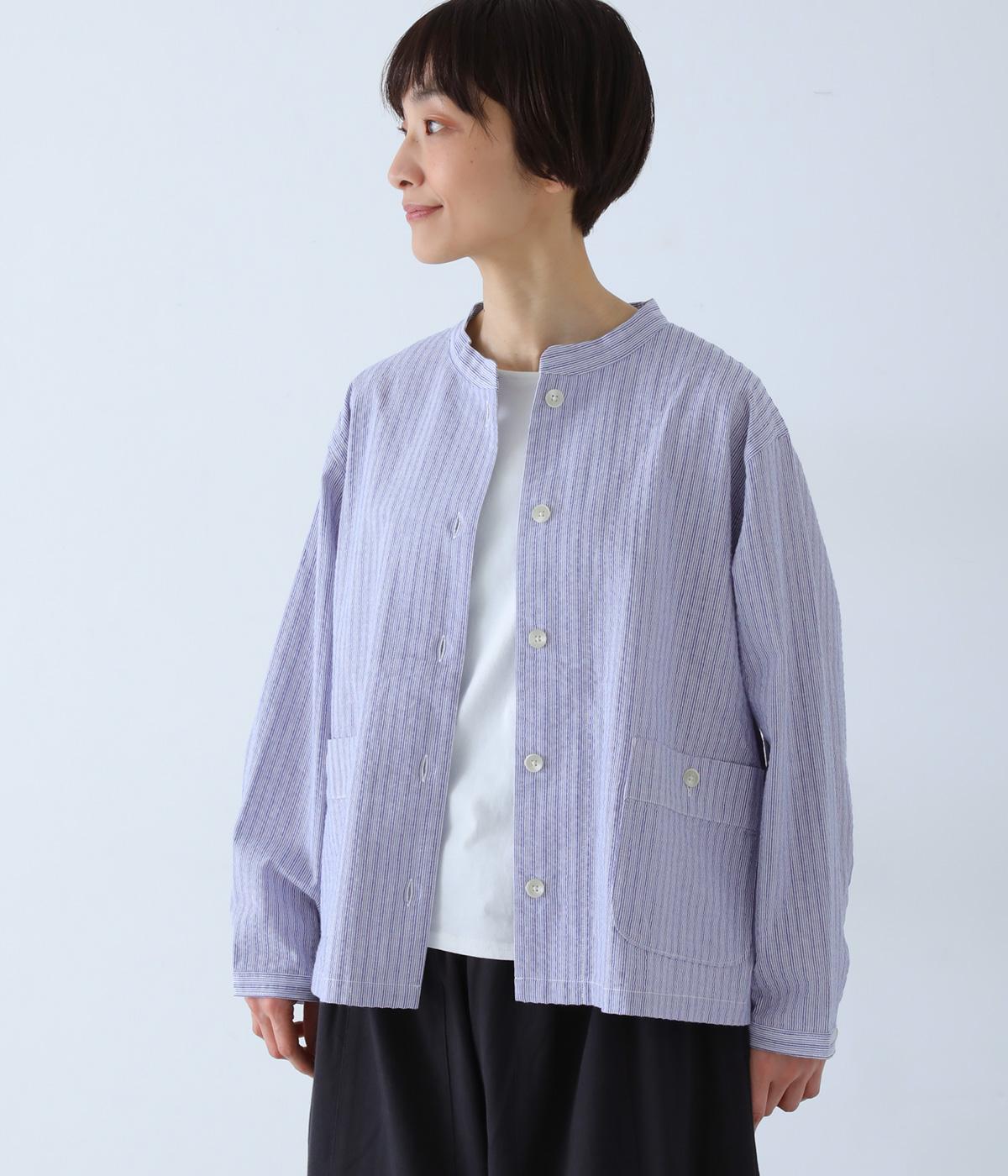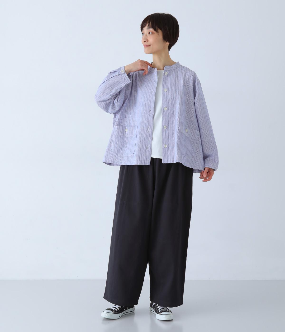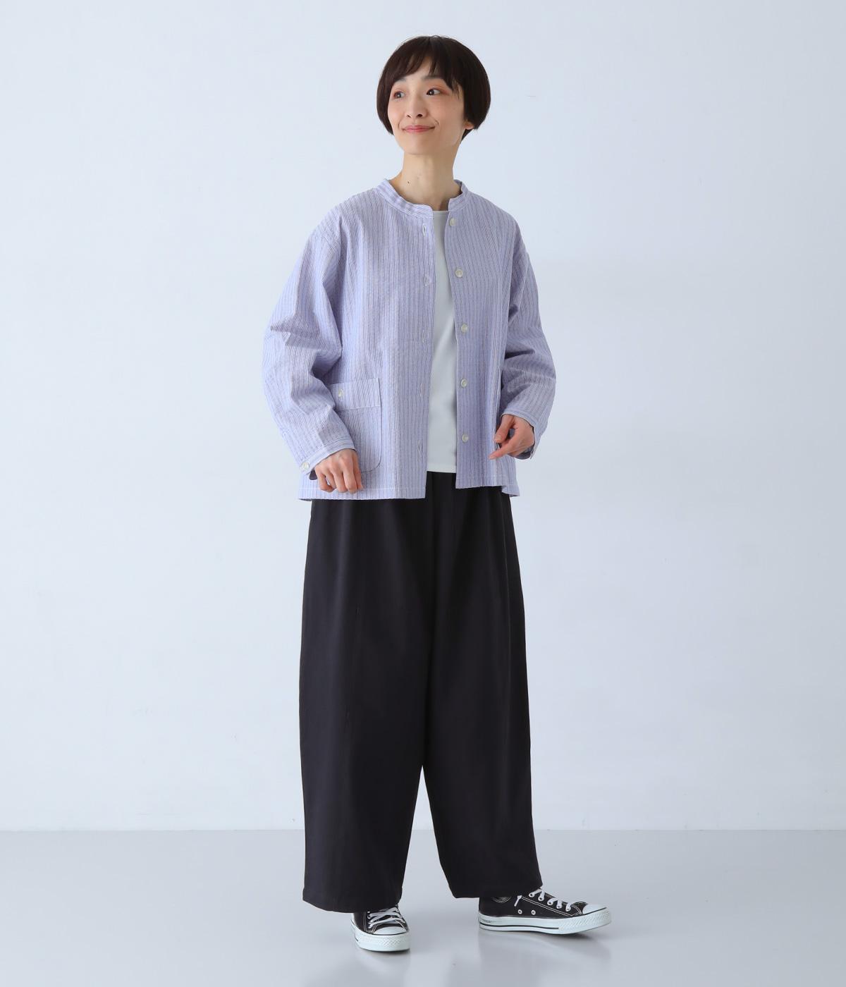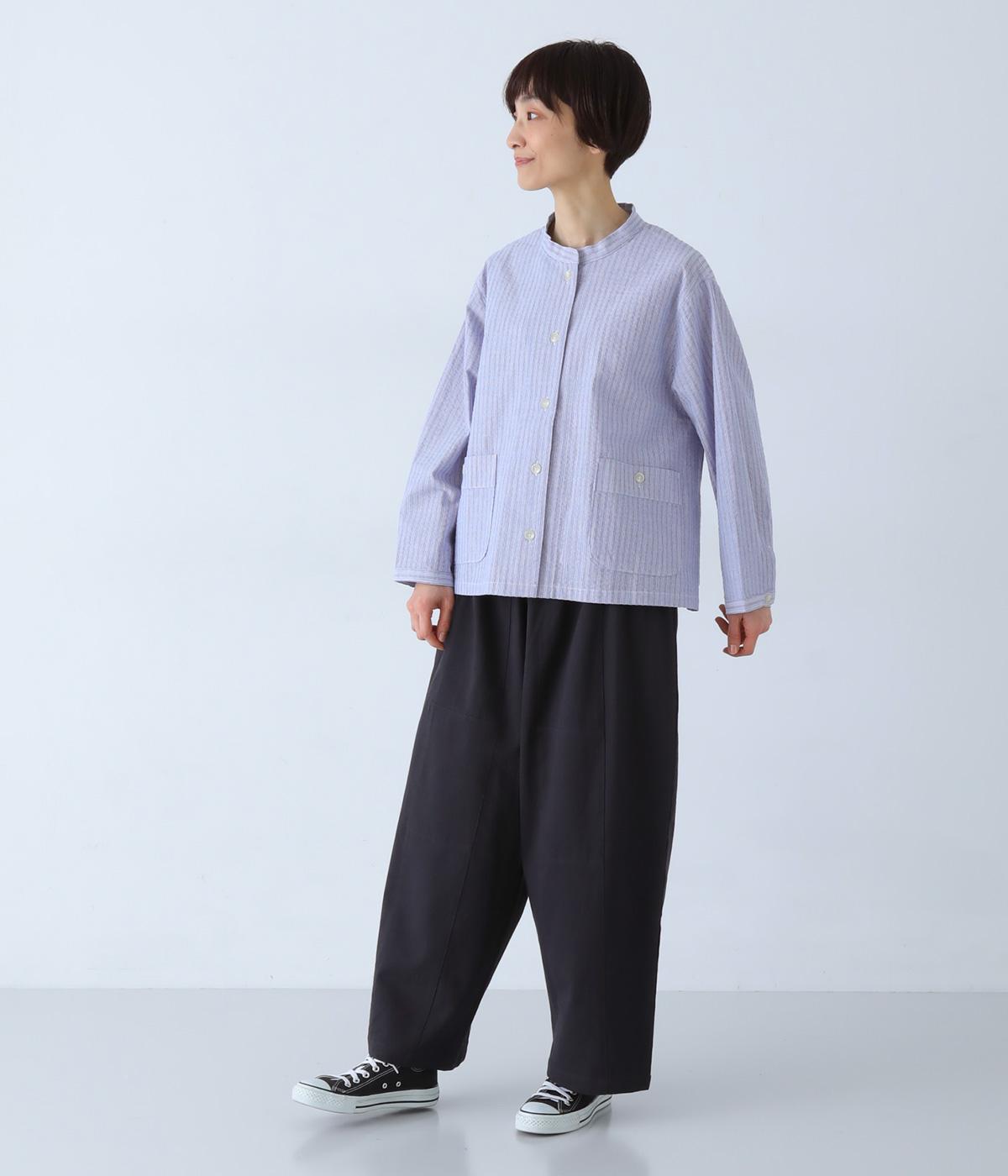 表面の凹凸が特徴のサッカー生地を使用しました。先染めならではのやわらかな風合いが魅力です。さらりとして肌離れがよく、汗ばむ季節も心地よく着用できます。軽やかで扱いやすく、デイリーに取り入れやすい素材です。