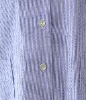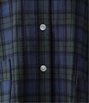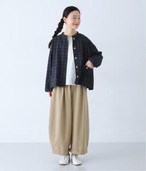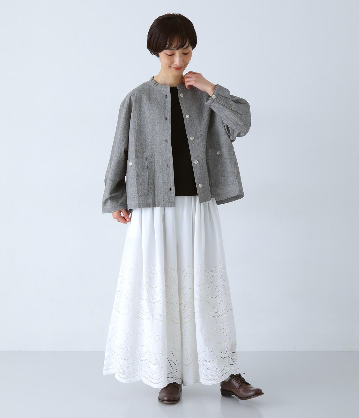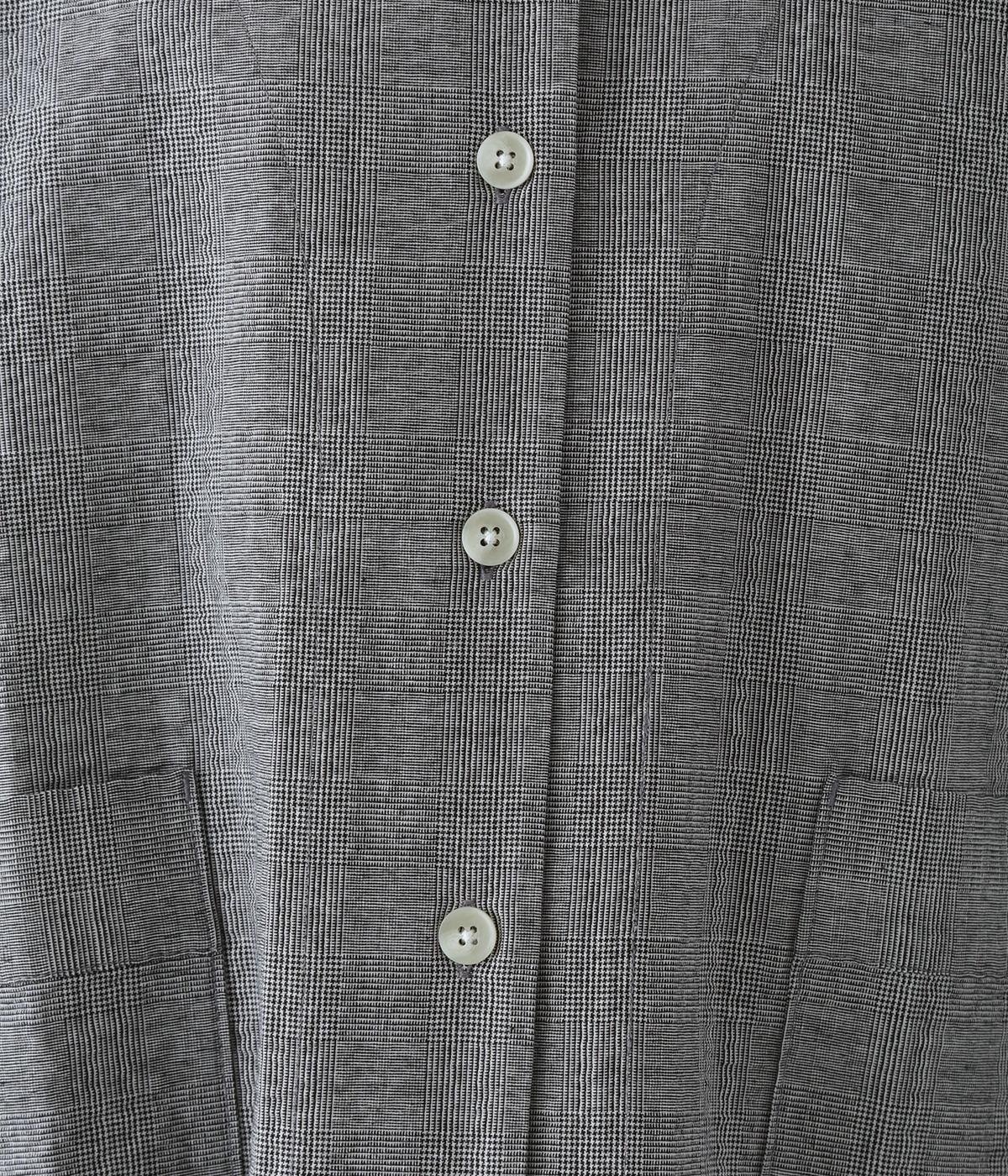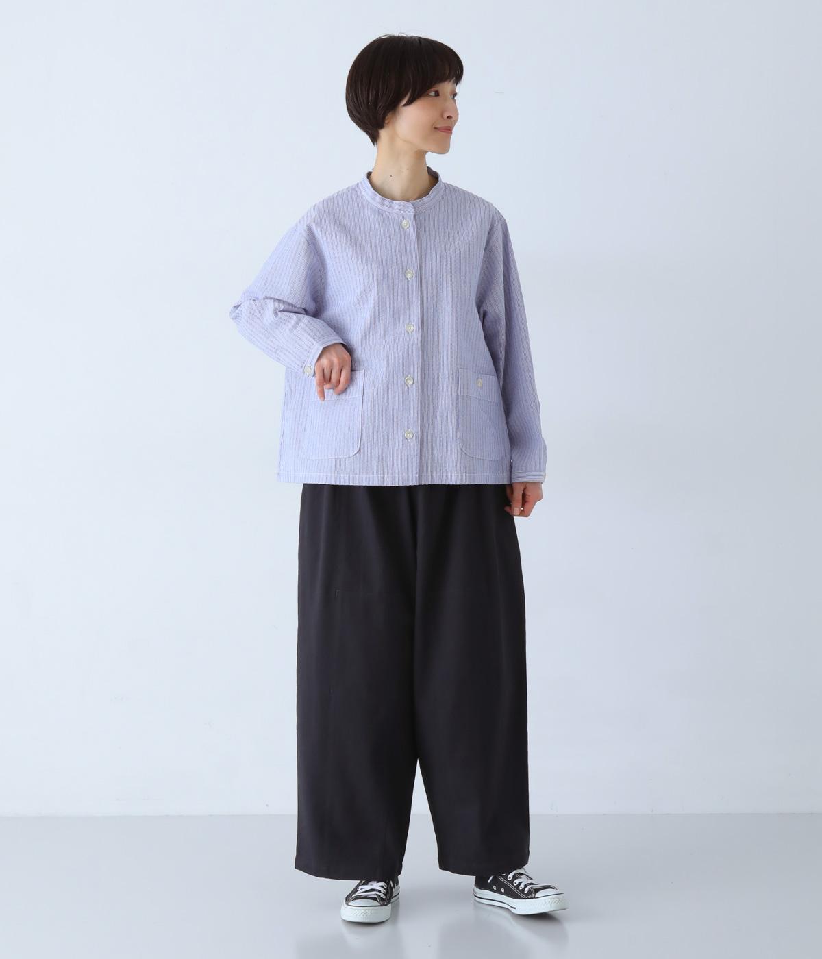 表面の凹凸が特徴のサッカー生地を使用しました。先染めならではのやわらかな風合いが魅力です。さらりとして肌離れがよく、汗ばむ季節も心地よく着用できます。軽やかで扱いやすく、デイリーに取り入れやすい素材です。