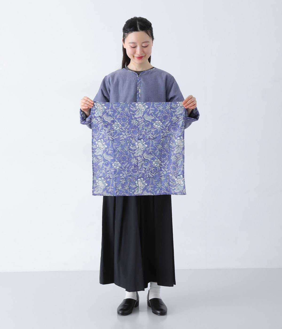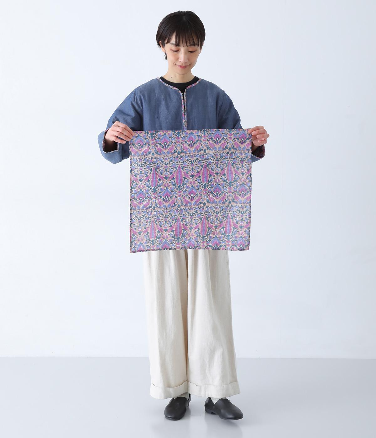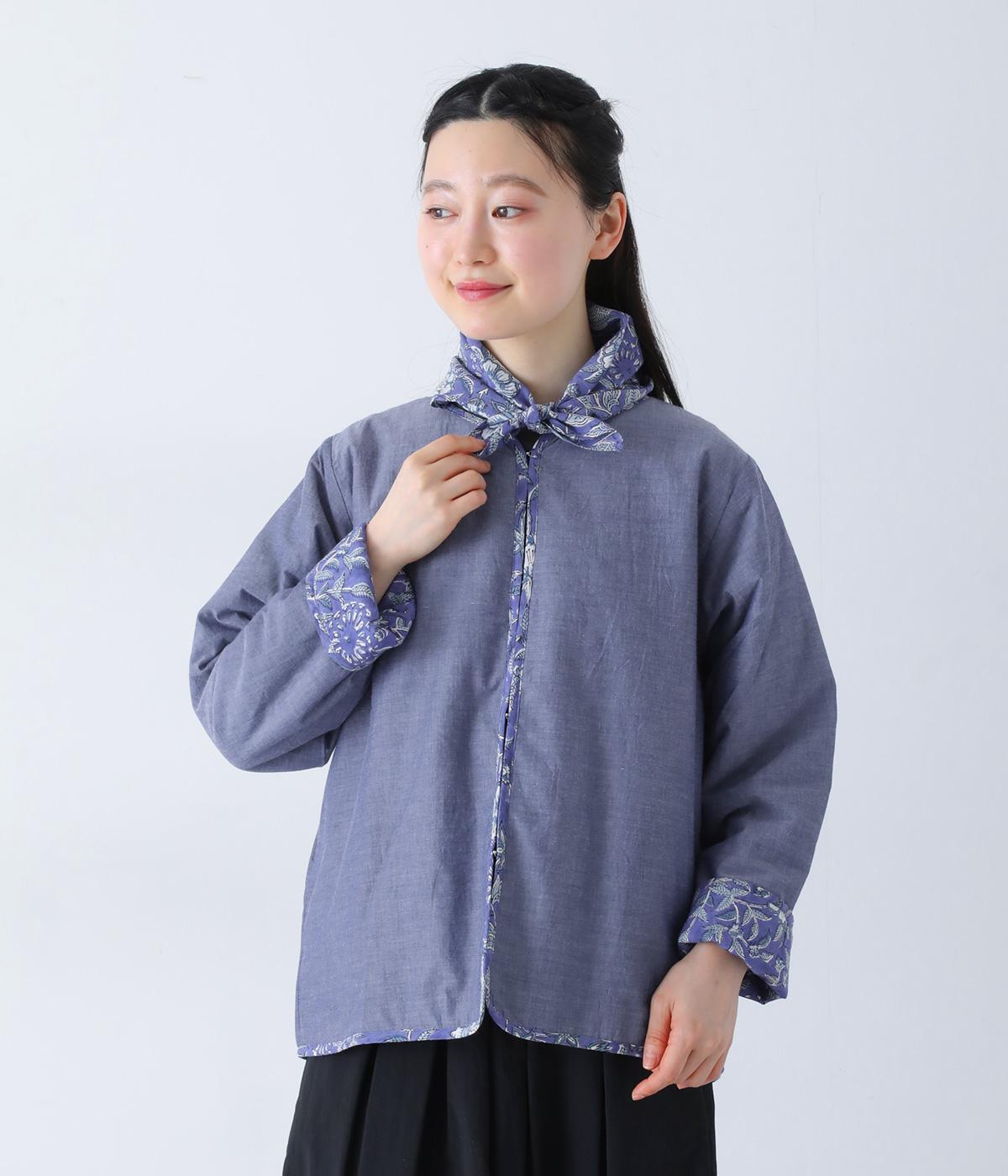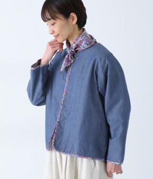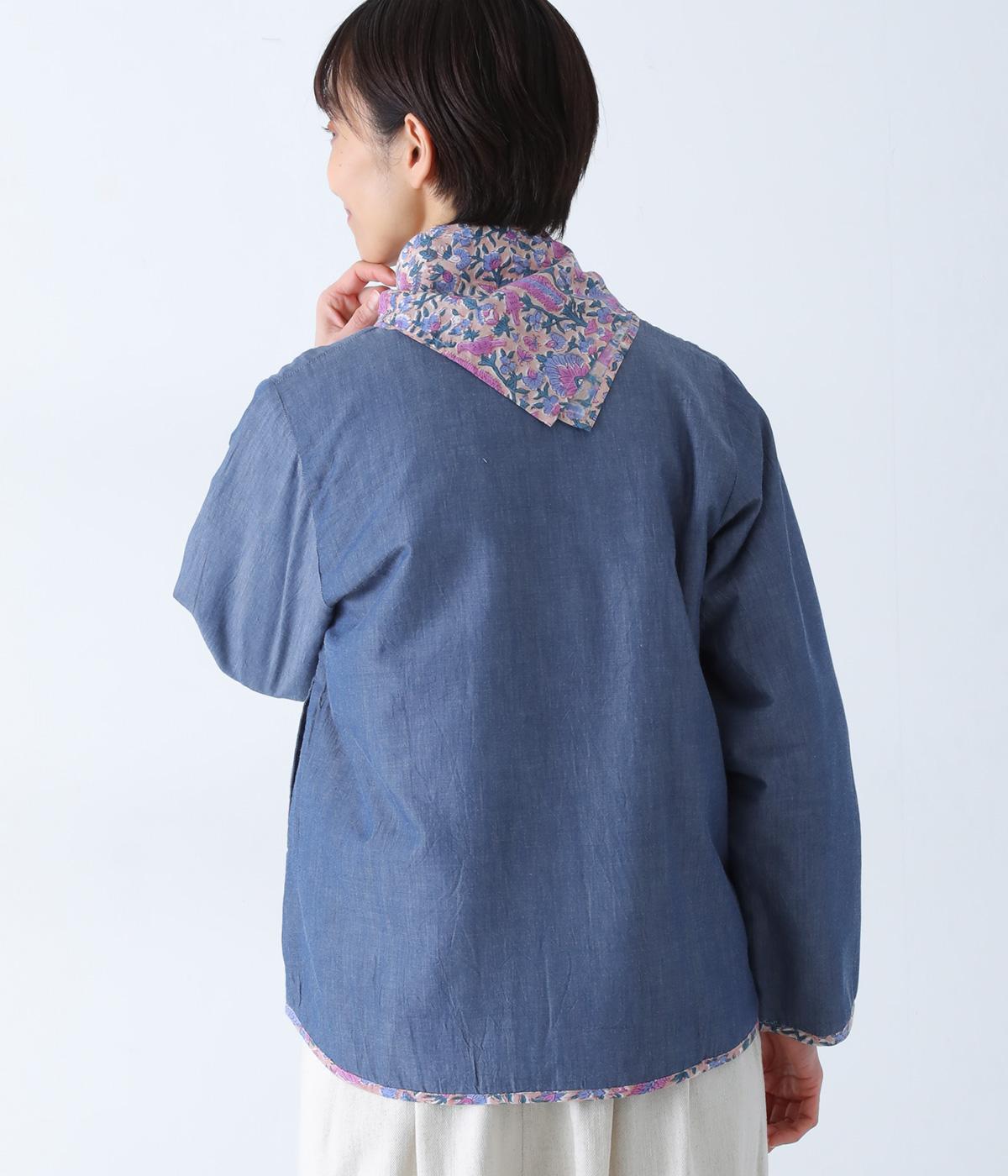 シンプルなシャンブレーと、華やかな草花モチーフのブロックプリントを合わせたリバーシブル仕様で、気分に合わせて2通りの着方が楽しめます。セットのバンダナと組み合わせることで、さらに幅広いアレンジが可能です。