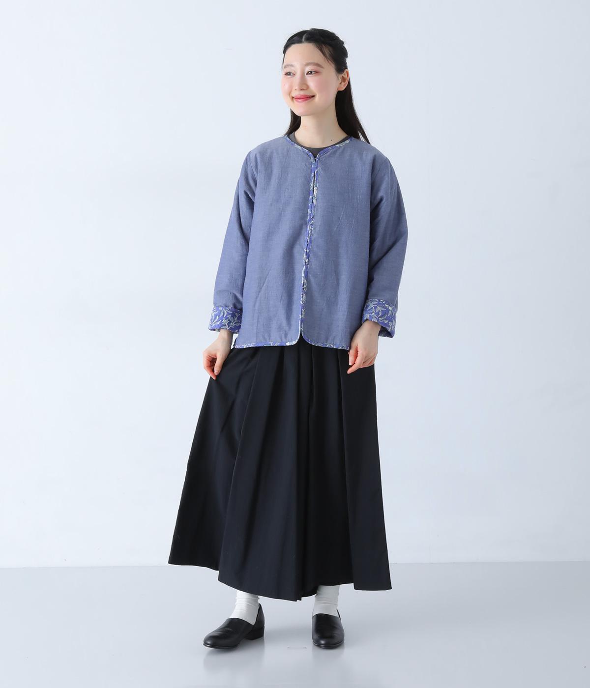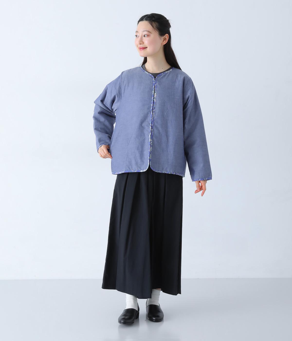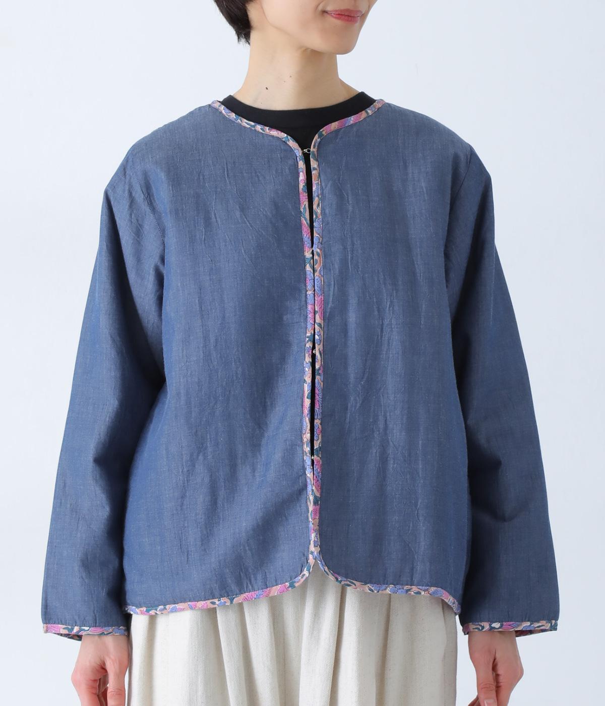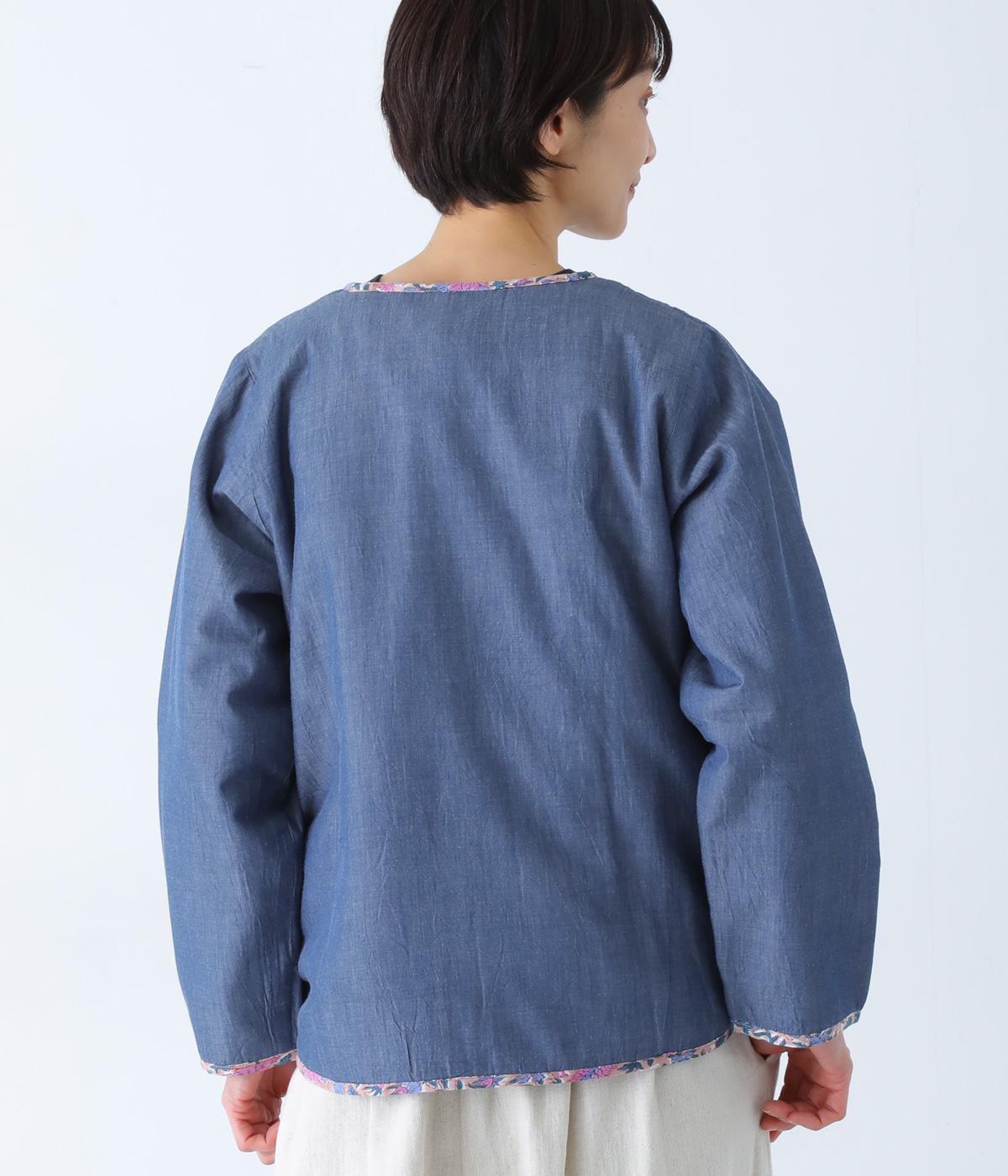 シンプルなシャンブレーと、華やかな草花モチーフのブロックプリントを合わせたリバーシブル仕様で、気分に合わせて2通りの着方が楽しめます。セットのバンダナと組み合わせることで、さらに幅広いアレンジが可能です。