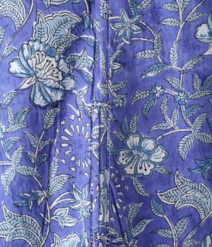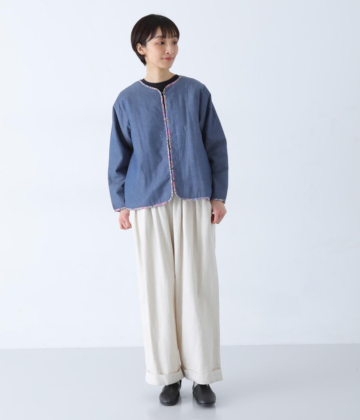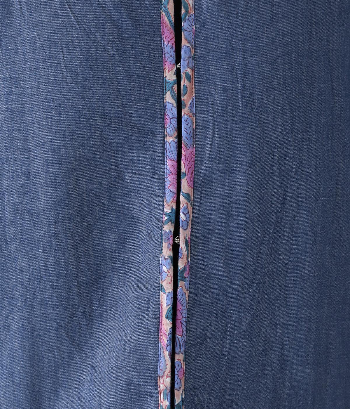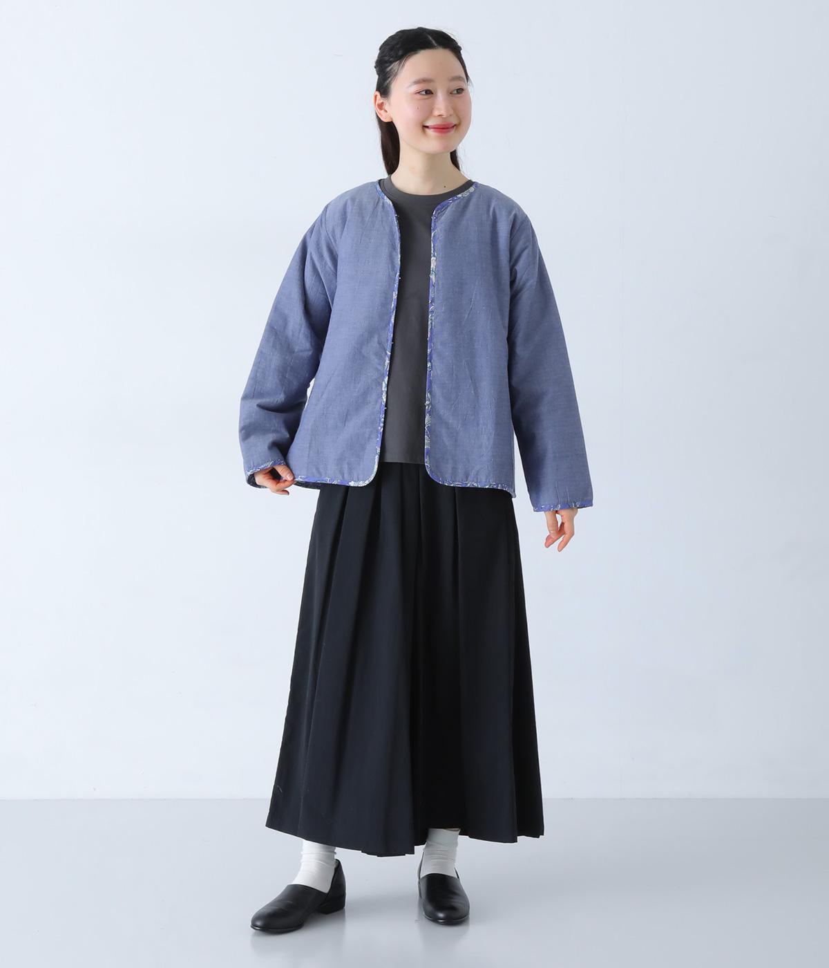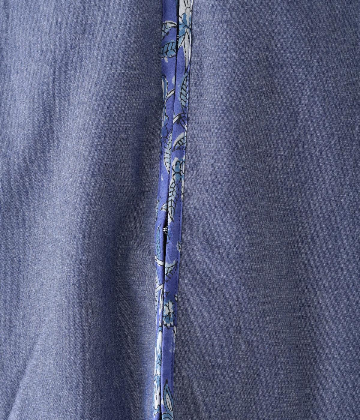 シンプルなシャンブレーと、華やかな草花モチーフのブロックプリントを合わせたリバーシブル仕様で、気分に合わせて2通りの着方が楽しめます。セットのバンダナと組み合わせることで、さらに幅広いアレンジが可能です。