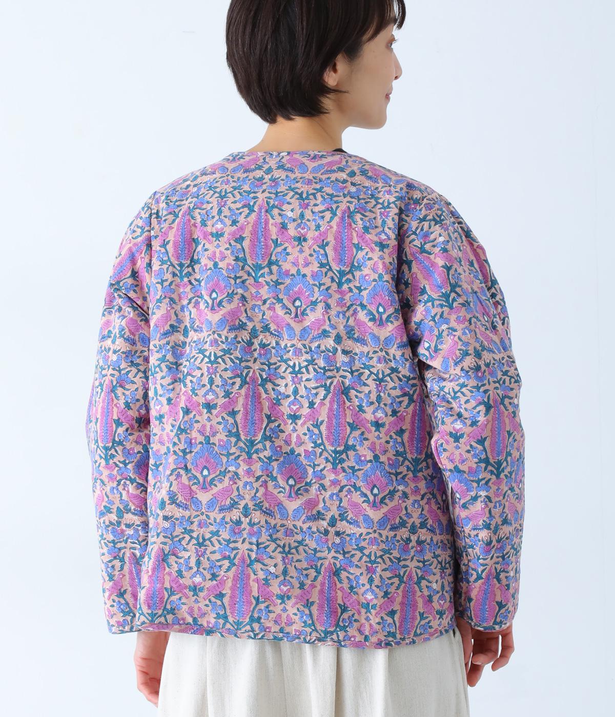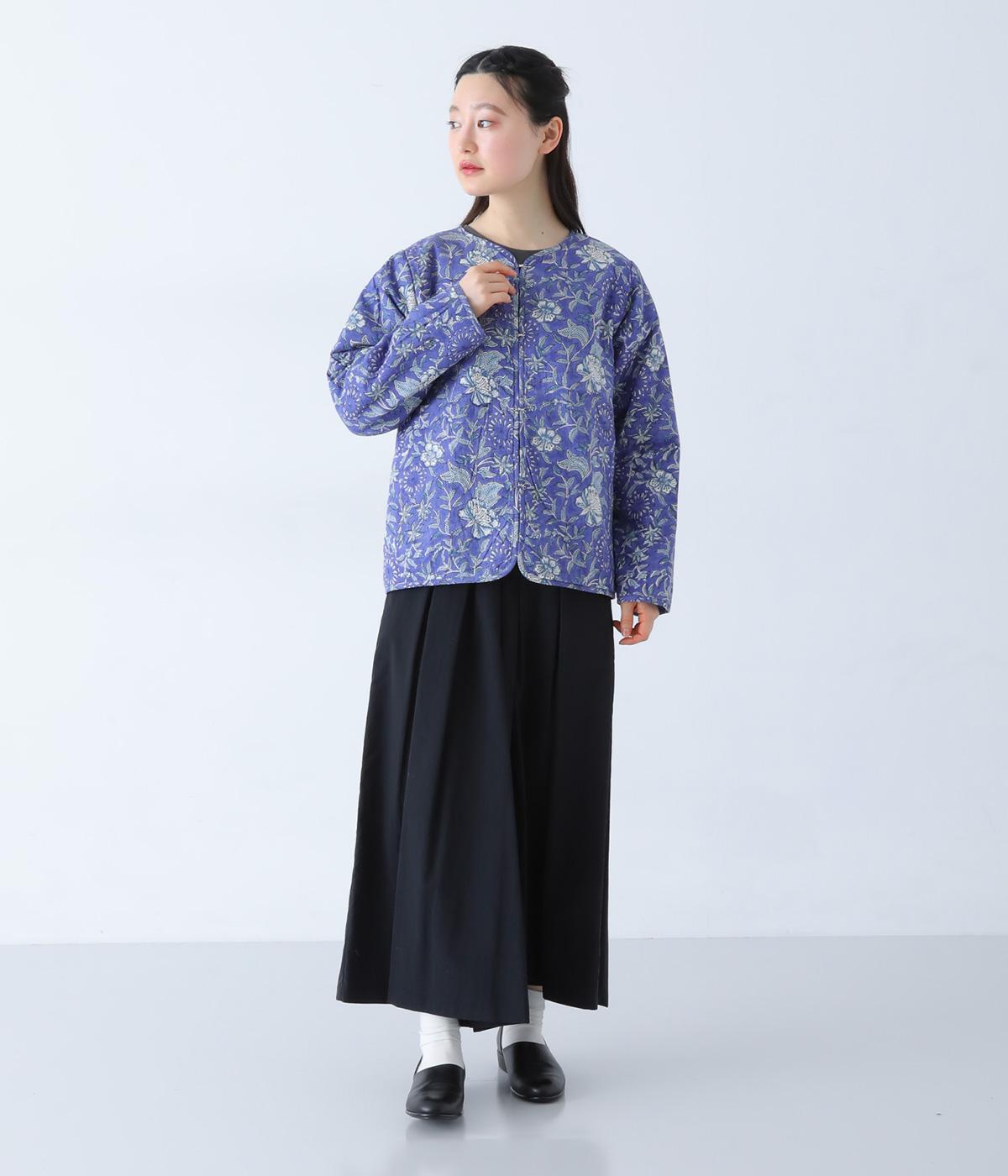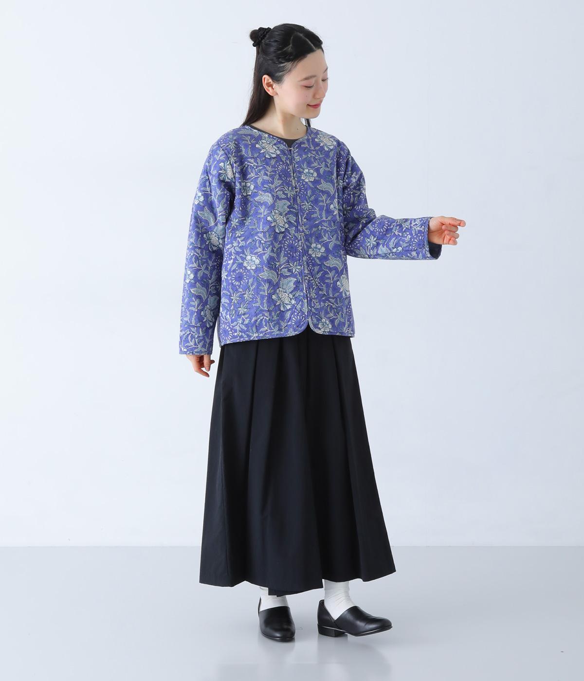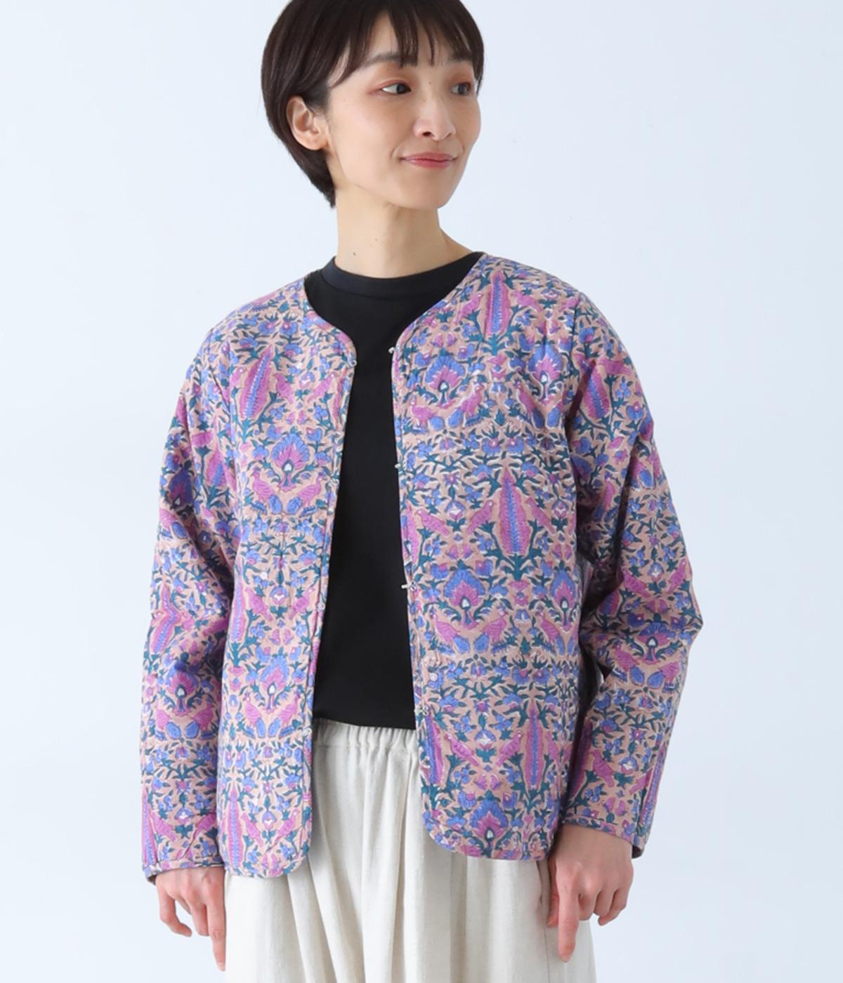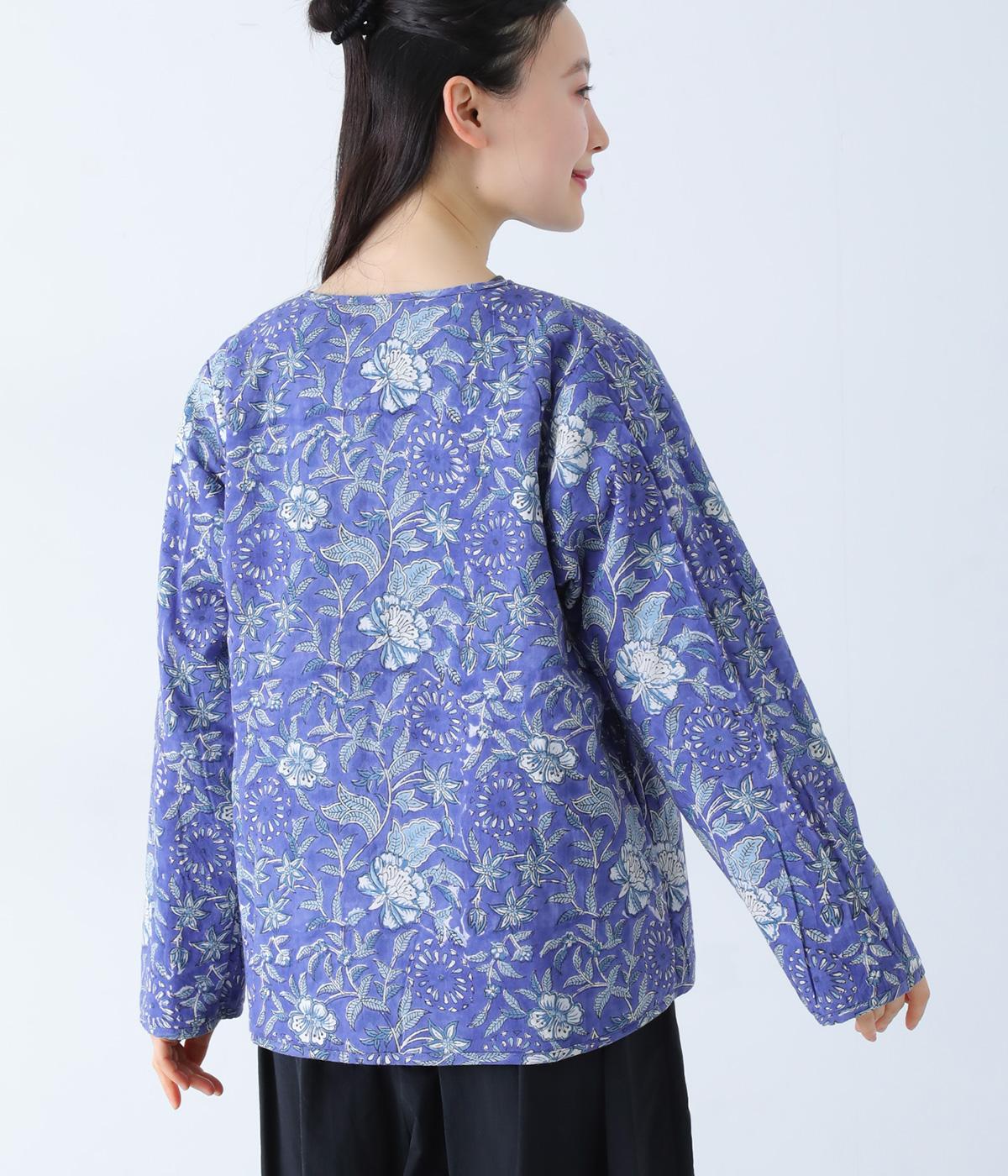 軽く柔らかな着心地の中綿入りのキルティング生地。襟ぐり・前立て・袖口にはパイピングをほどこしてメリハリをつけました。同柄のバンダナ付きで、首元やヘアアレンジにも使えます。