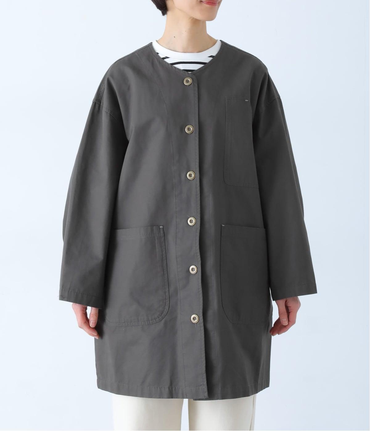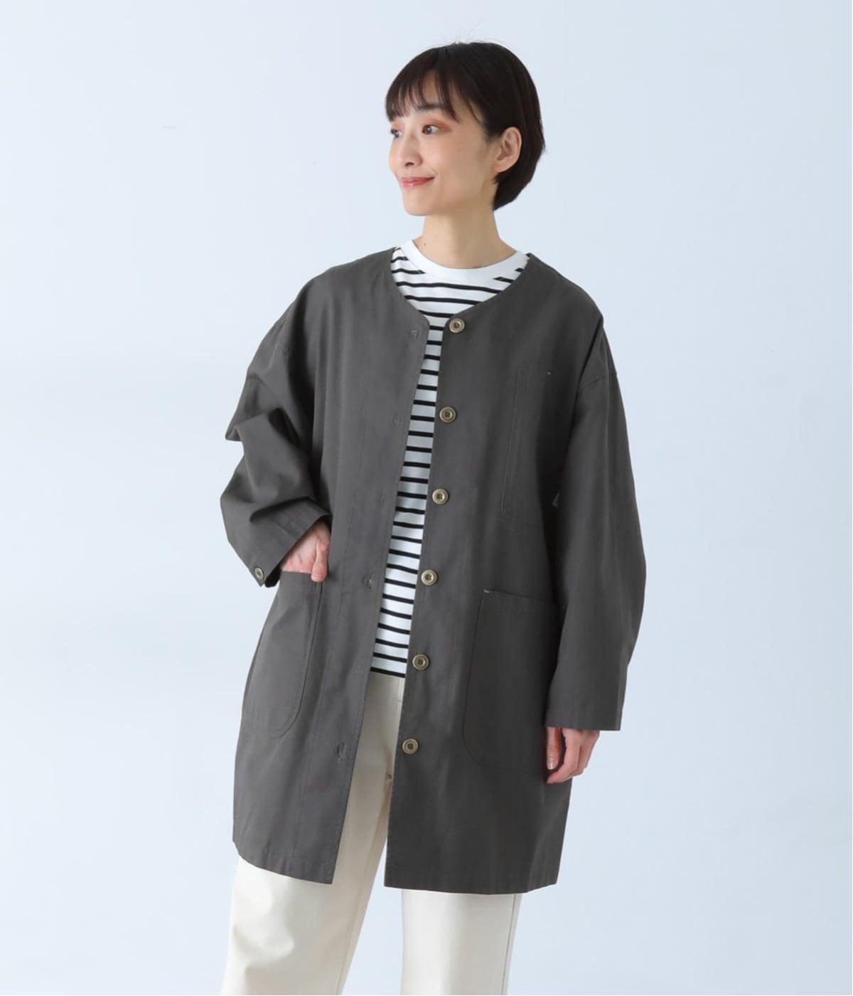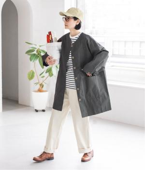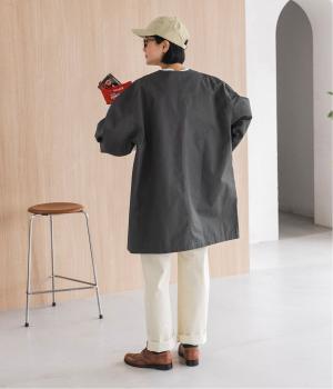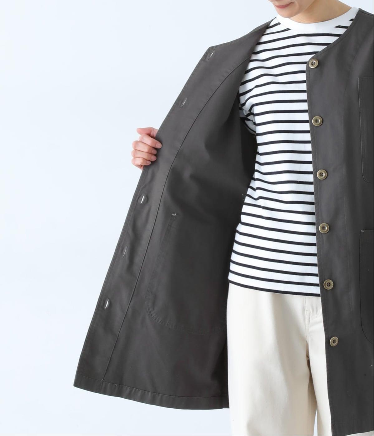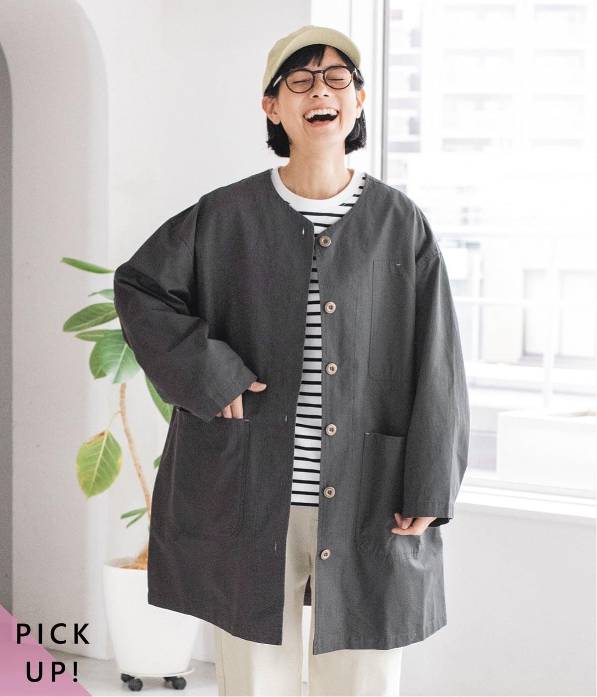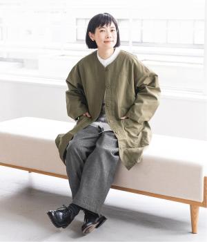 顔まわりをすっきりと見せてくれるノーカラーデザインに、メタルボタンがワーク感とメリハリをプラス。