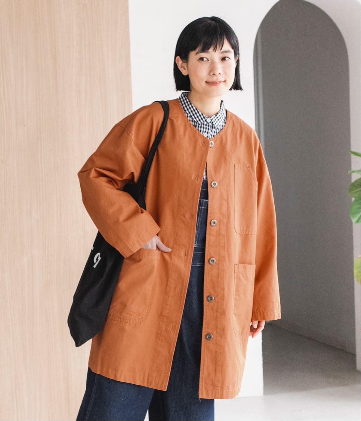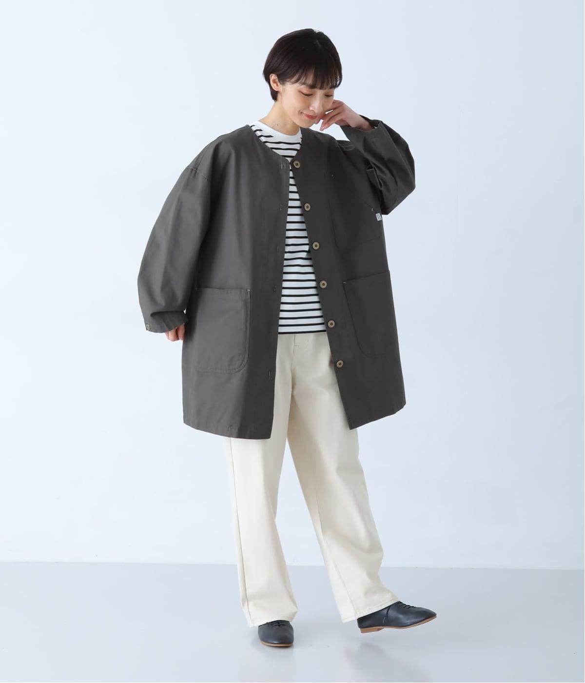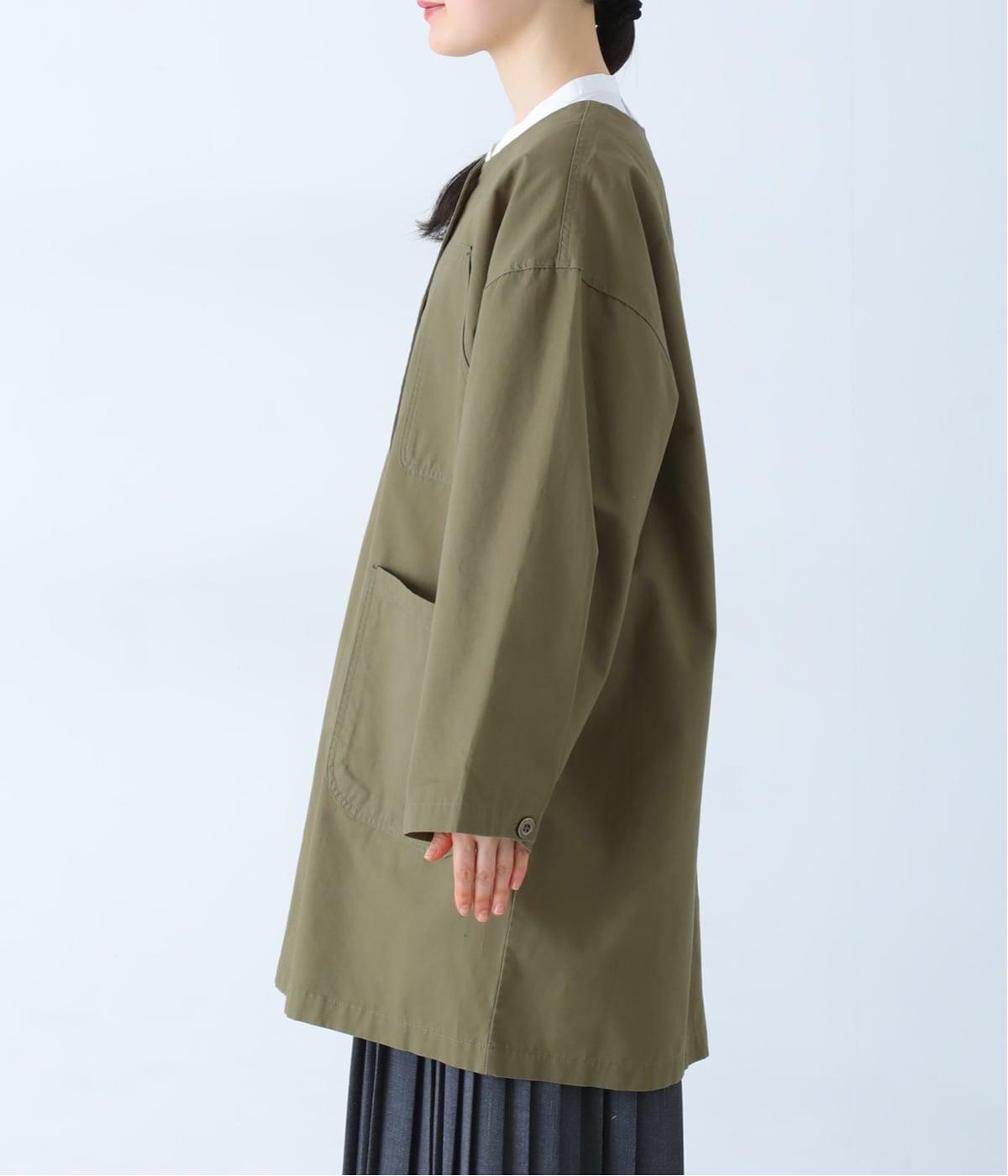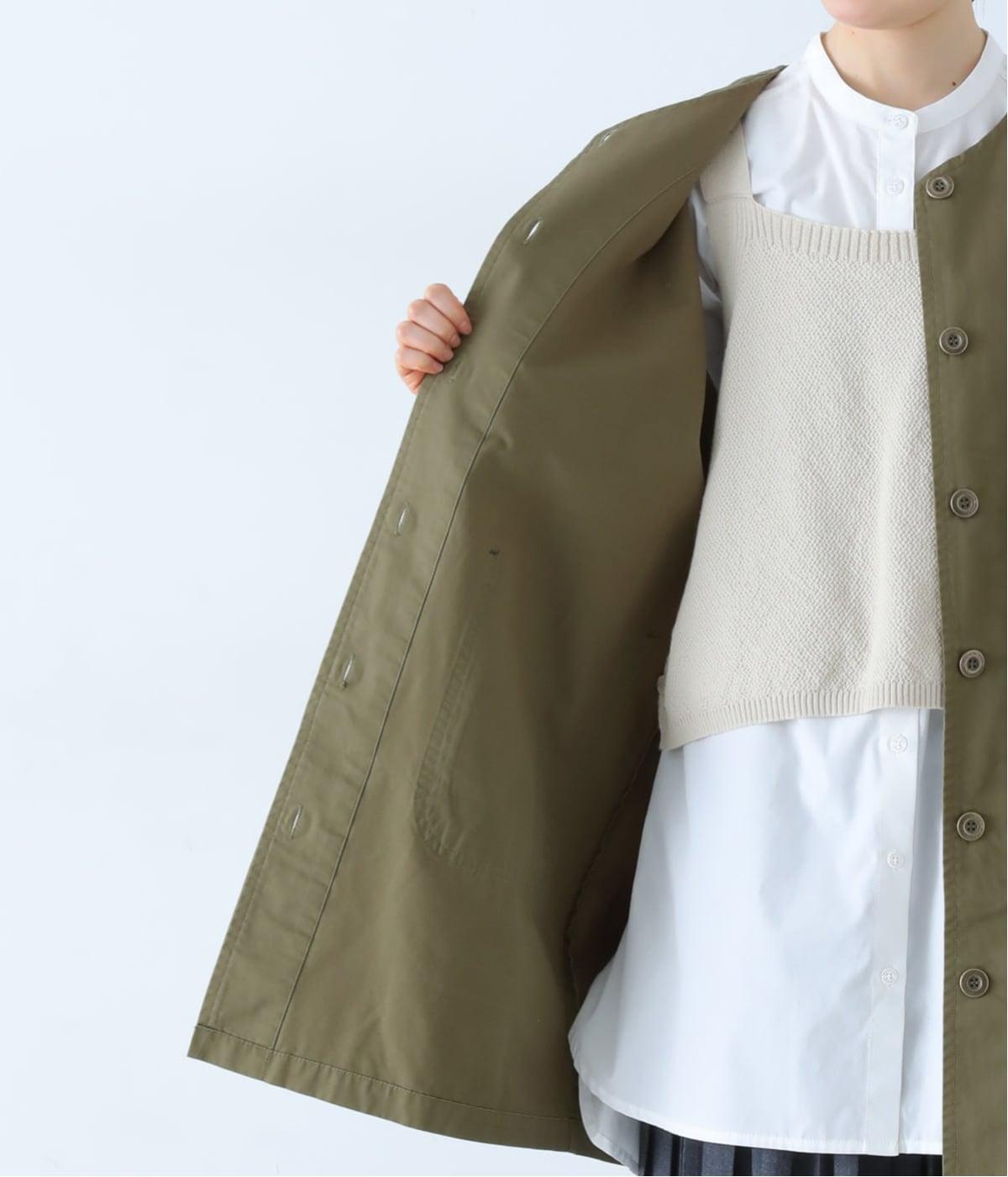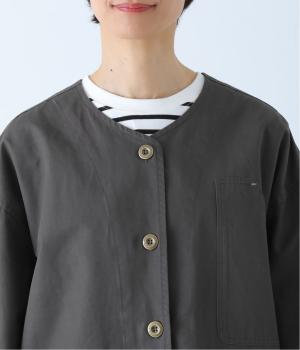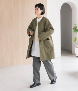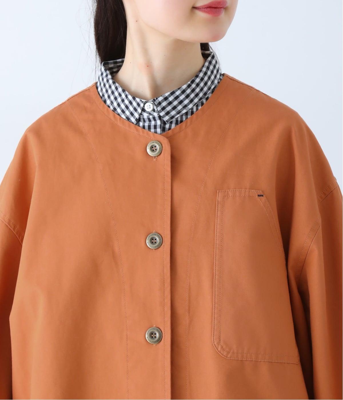 顔まわりをすっきりと見せてくれるノーカラーデザインに、メタルボタンがワーク感とメリハリをプラス。