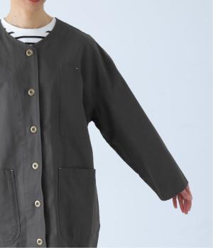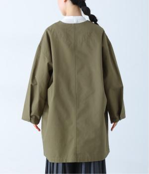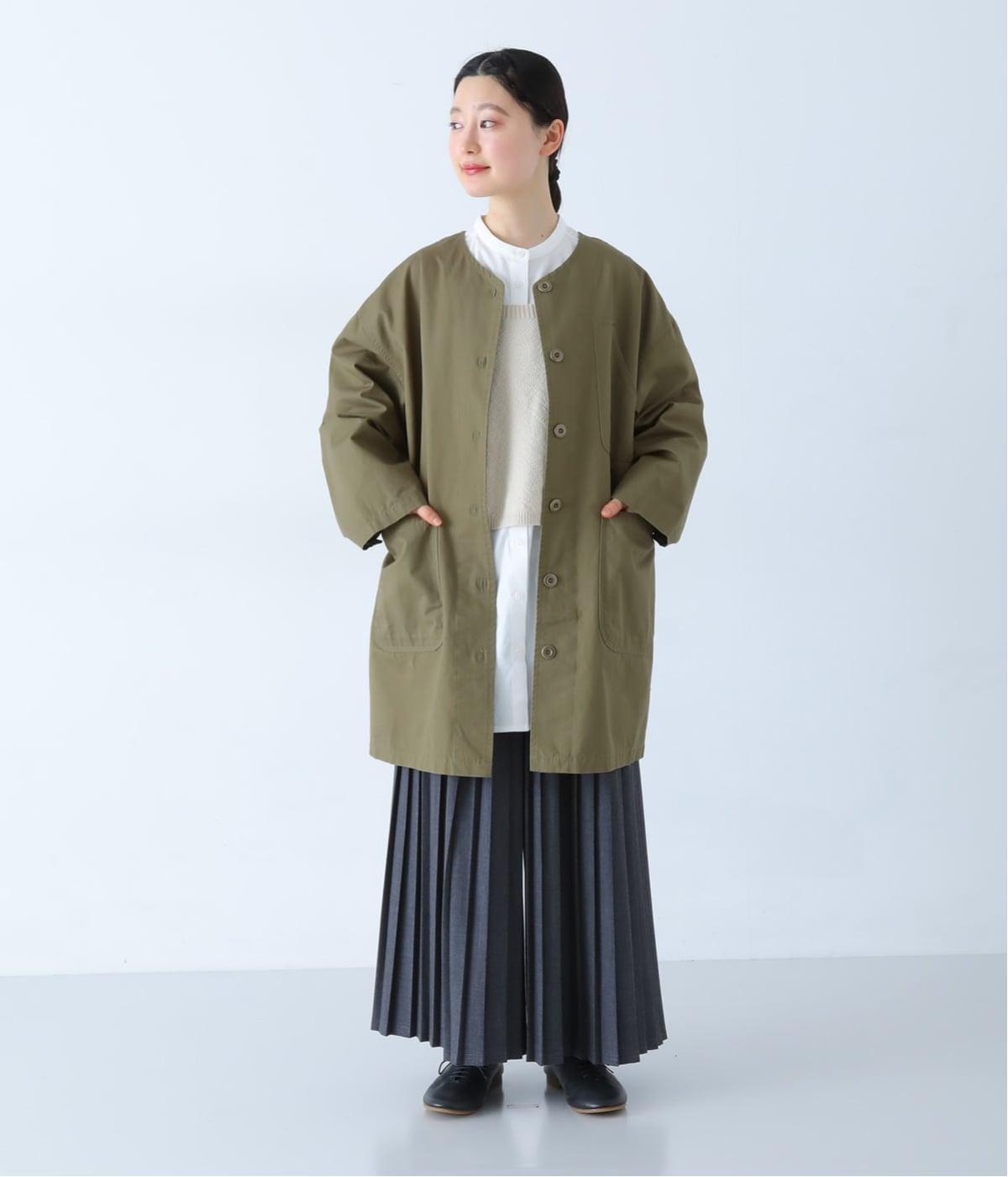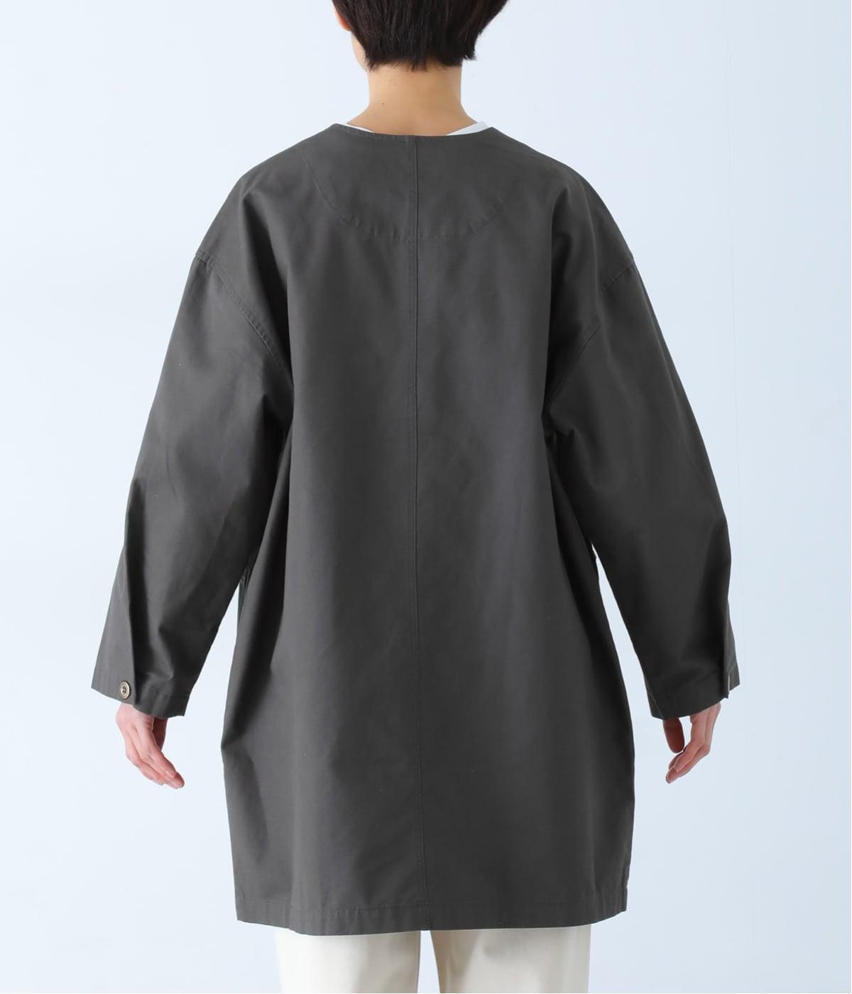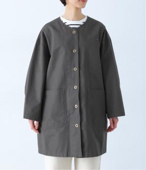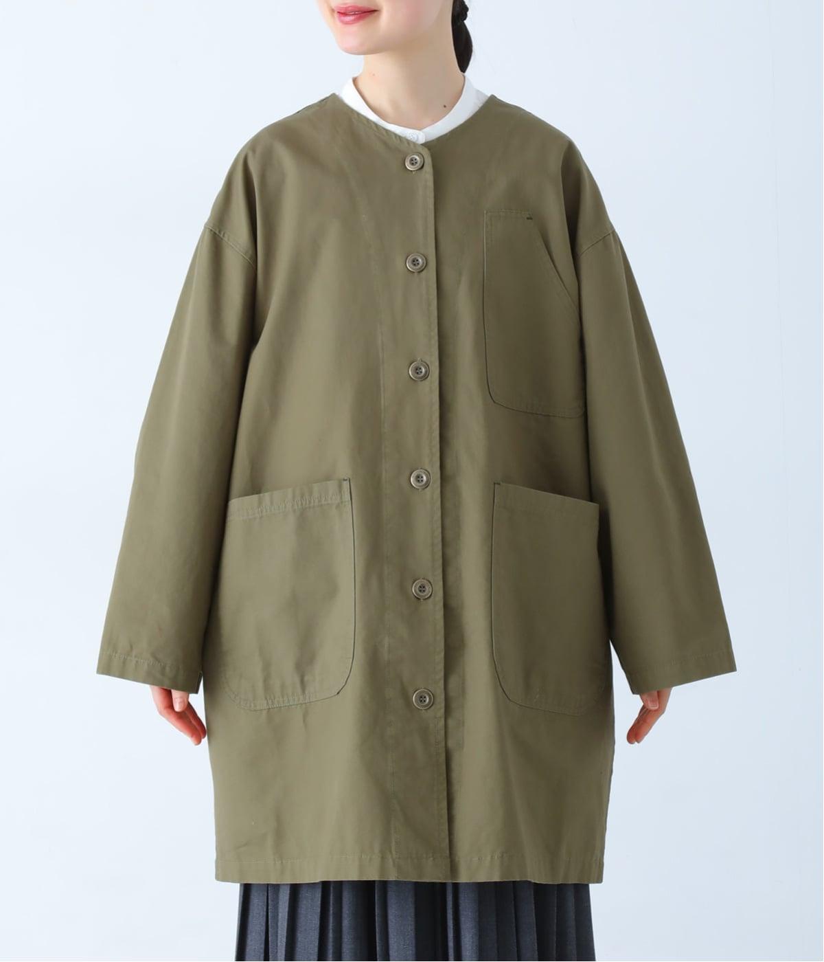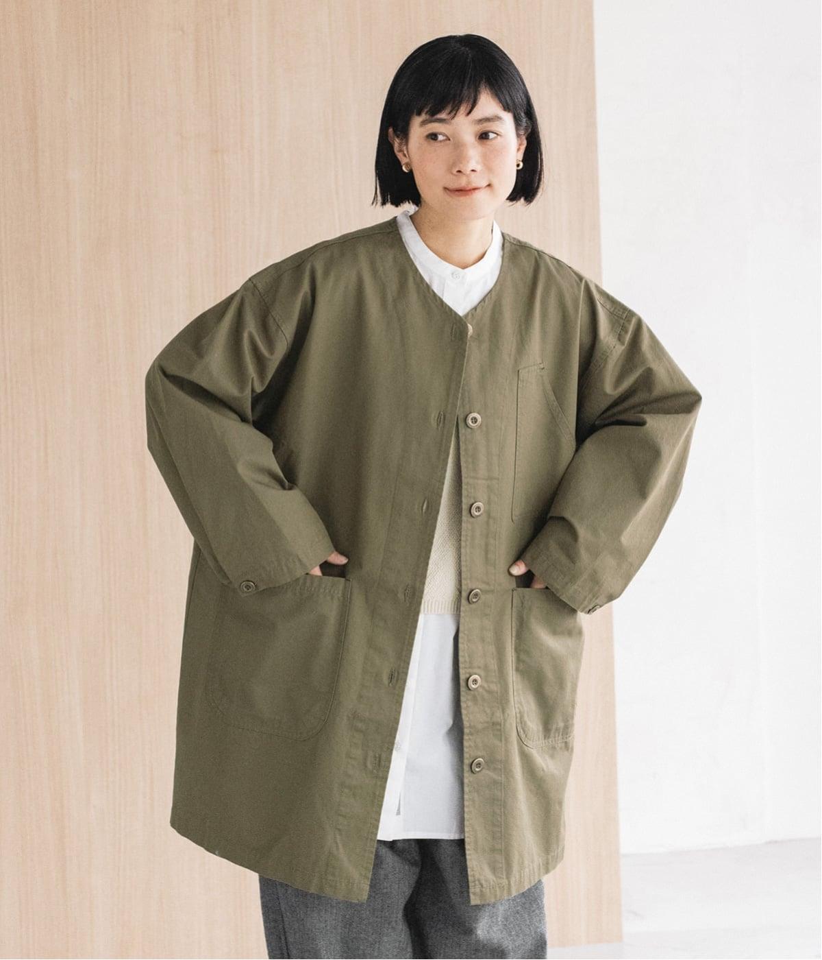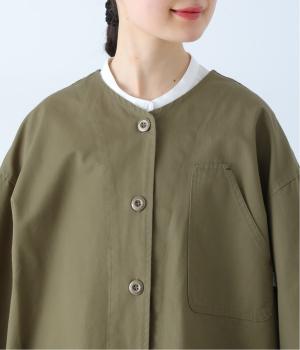 顔まわりをすっきりと見せてくれるノーカラーデザインに、メタルボタンがワーク感とメリハリをプラス。