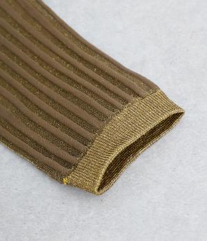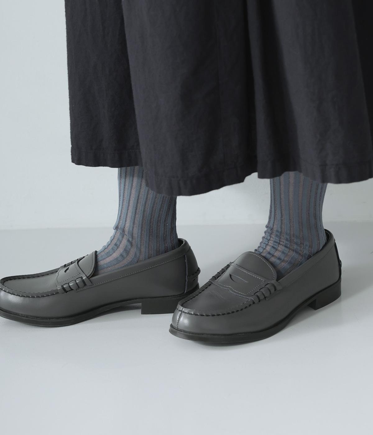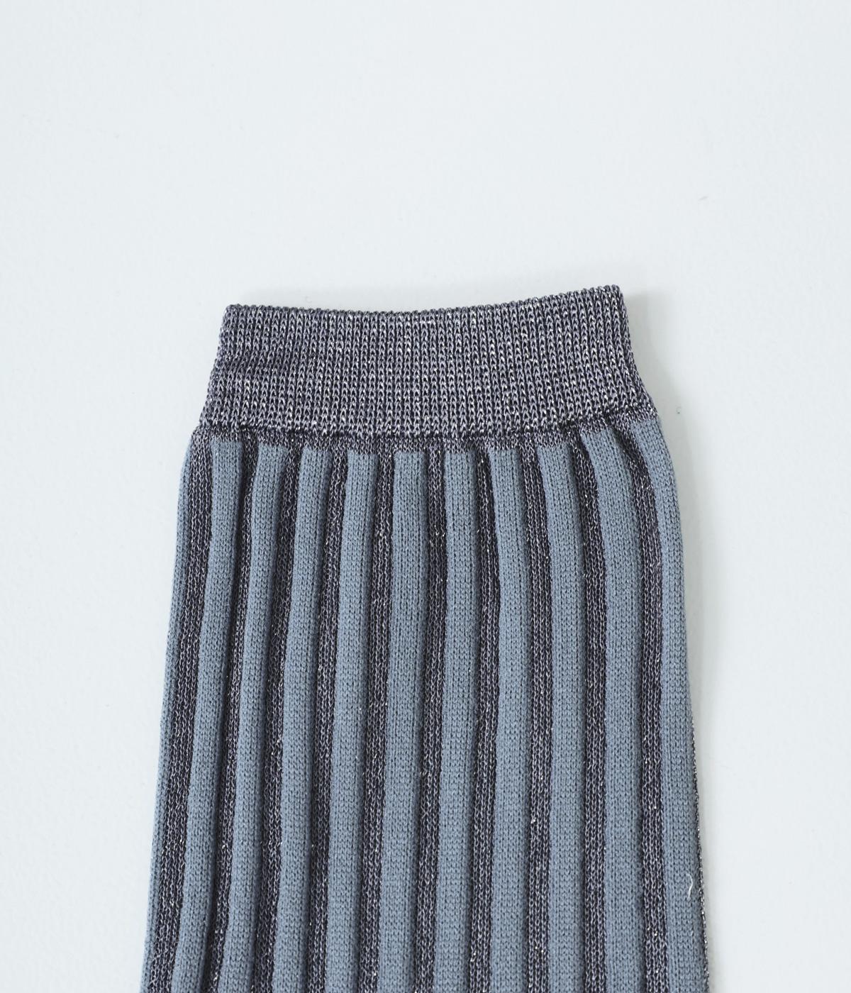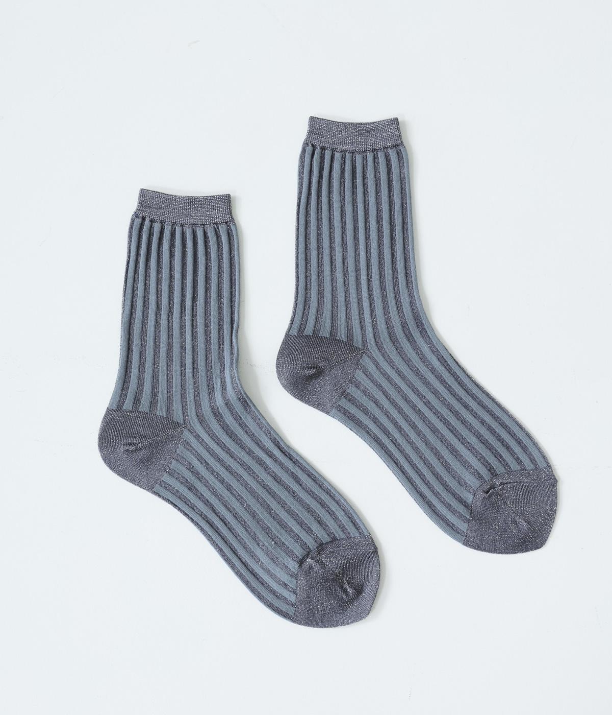 女性らしいシースルー素材のソックス。軽やかな印象なので、パンプスやサンダルとのコーディネートにぴったりです。ストライプ柄は、脚のラインをすっきりと見せてくれる効果も。さりげないラメが足元をパッと華やげてくれます。