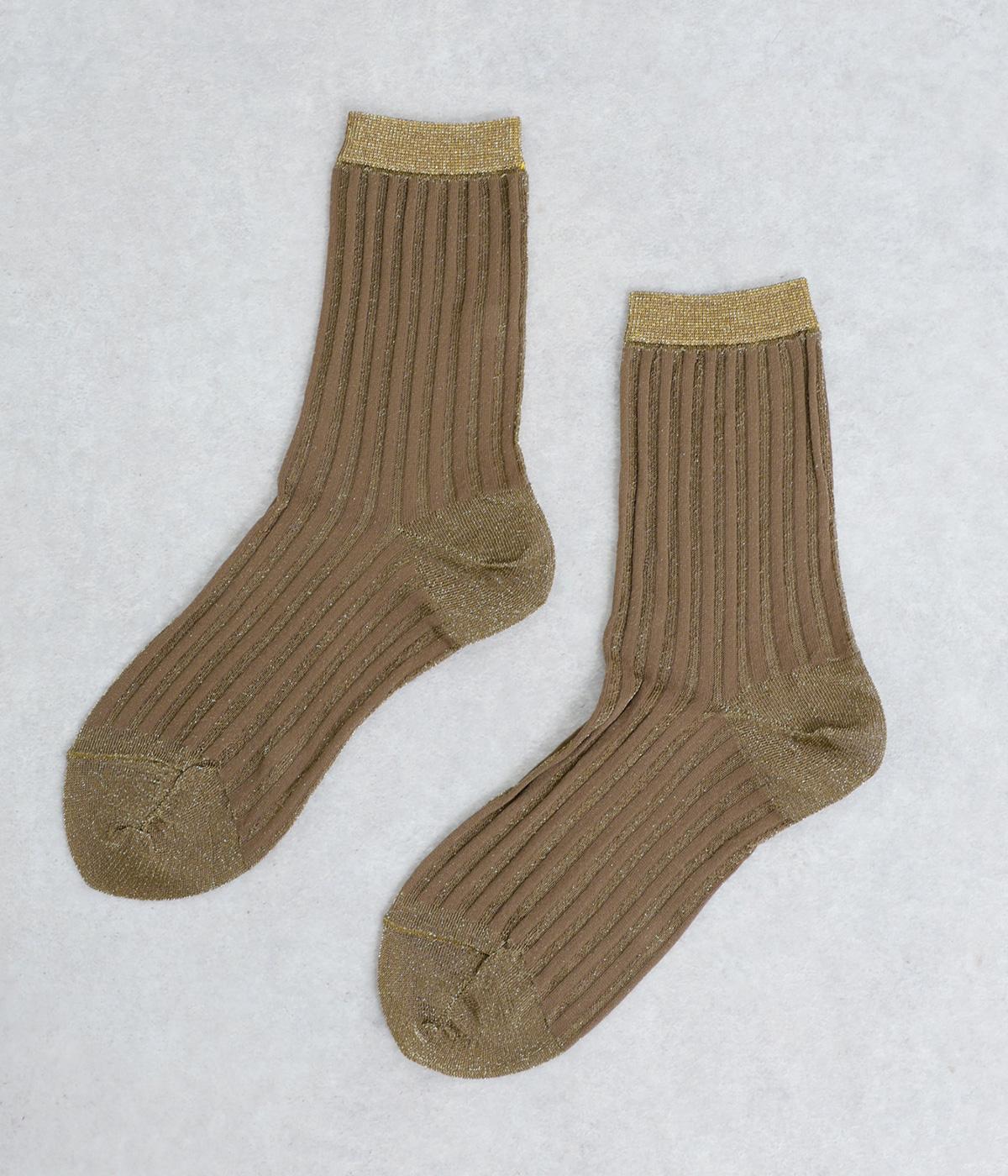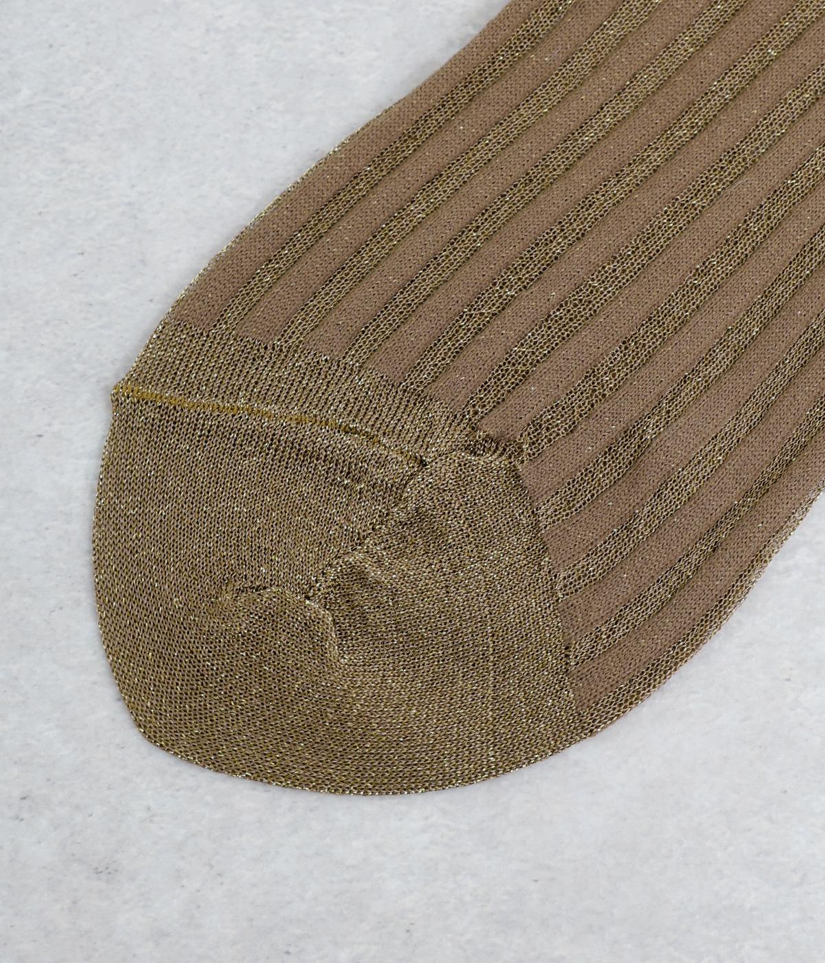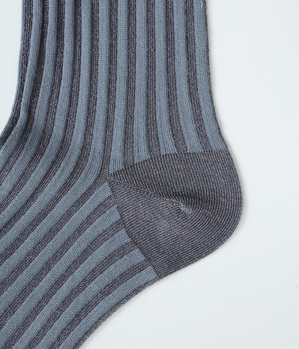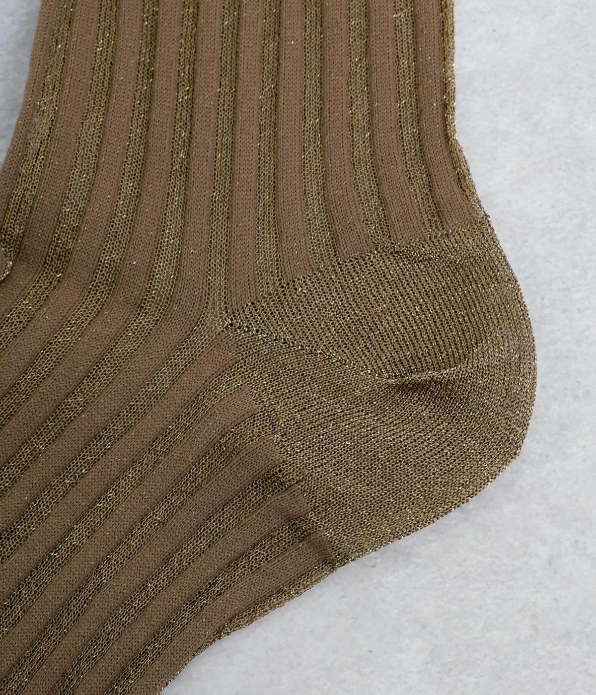 女性らしいシースルー素材のソックス。軽やかな印象なので、パンプスやサンダルとのコーディネートにぴったりです。ストライプ柄は、脚のラインをすっきりと見せてくれる効果も。さりげないラメが足元をパッと華やげてくれます。