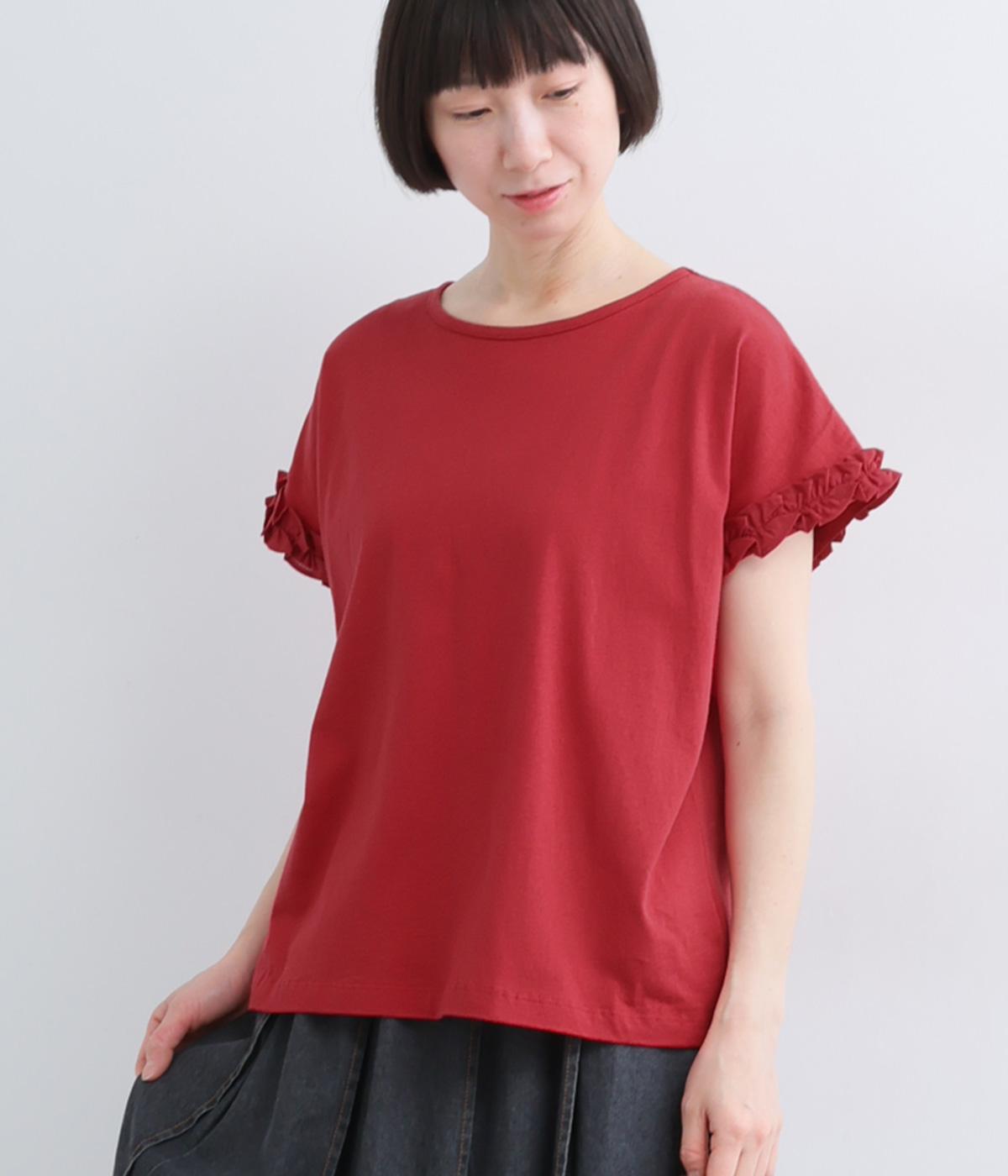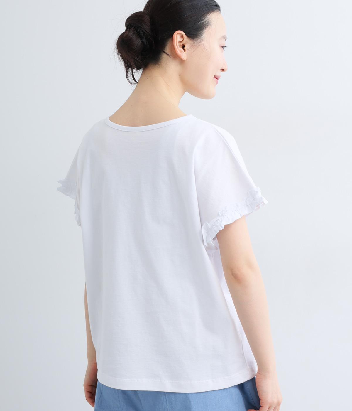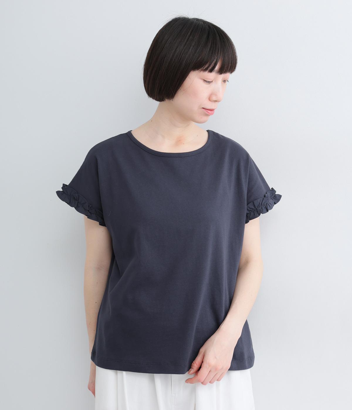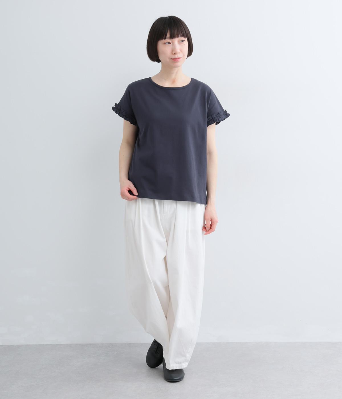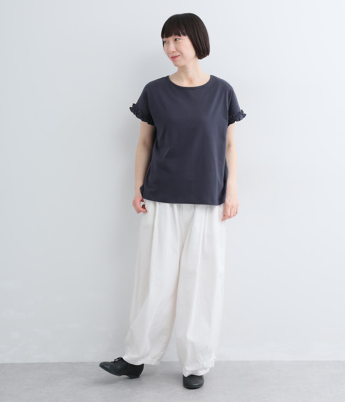 シンプルなボックス型プルオーバーに袖フリルをあしらってワンポイント設けました。フレンチスリーブのようなシルエットがフェミンンさを醸し、Tシャツよりカジュアル感をおさえた着こなしがたのしめます。