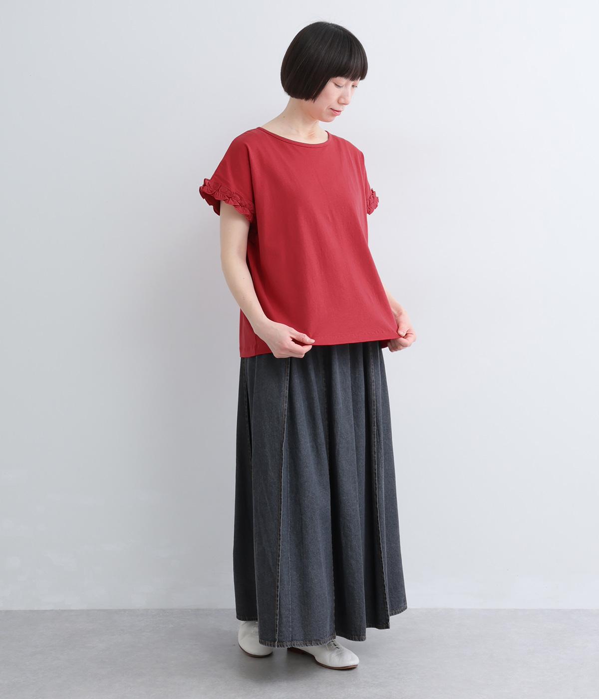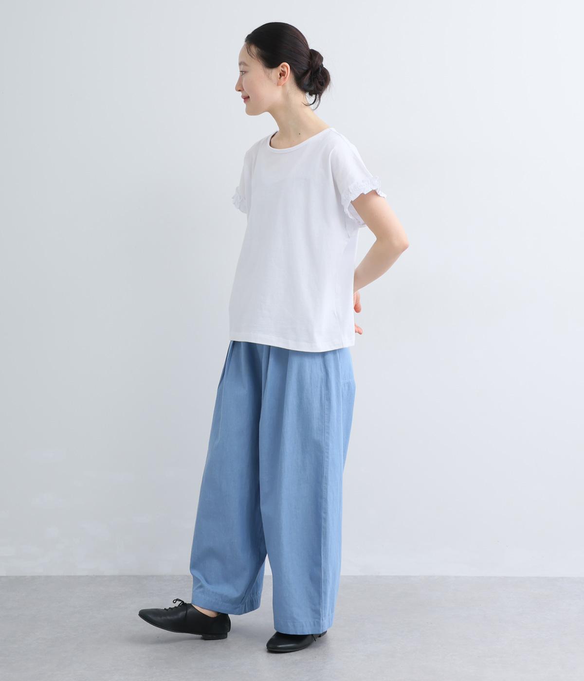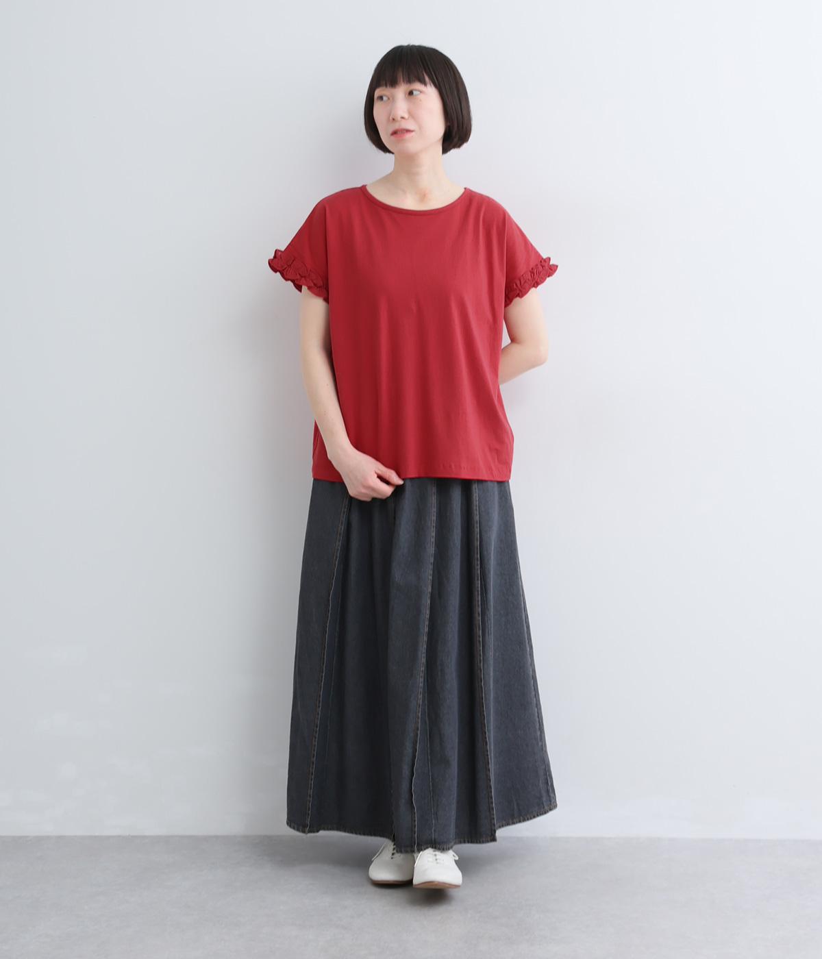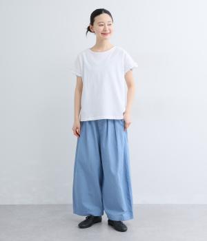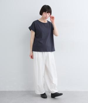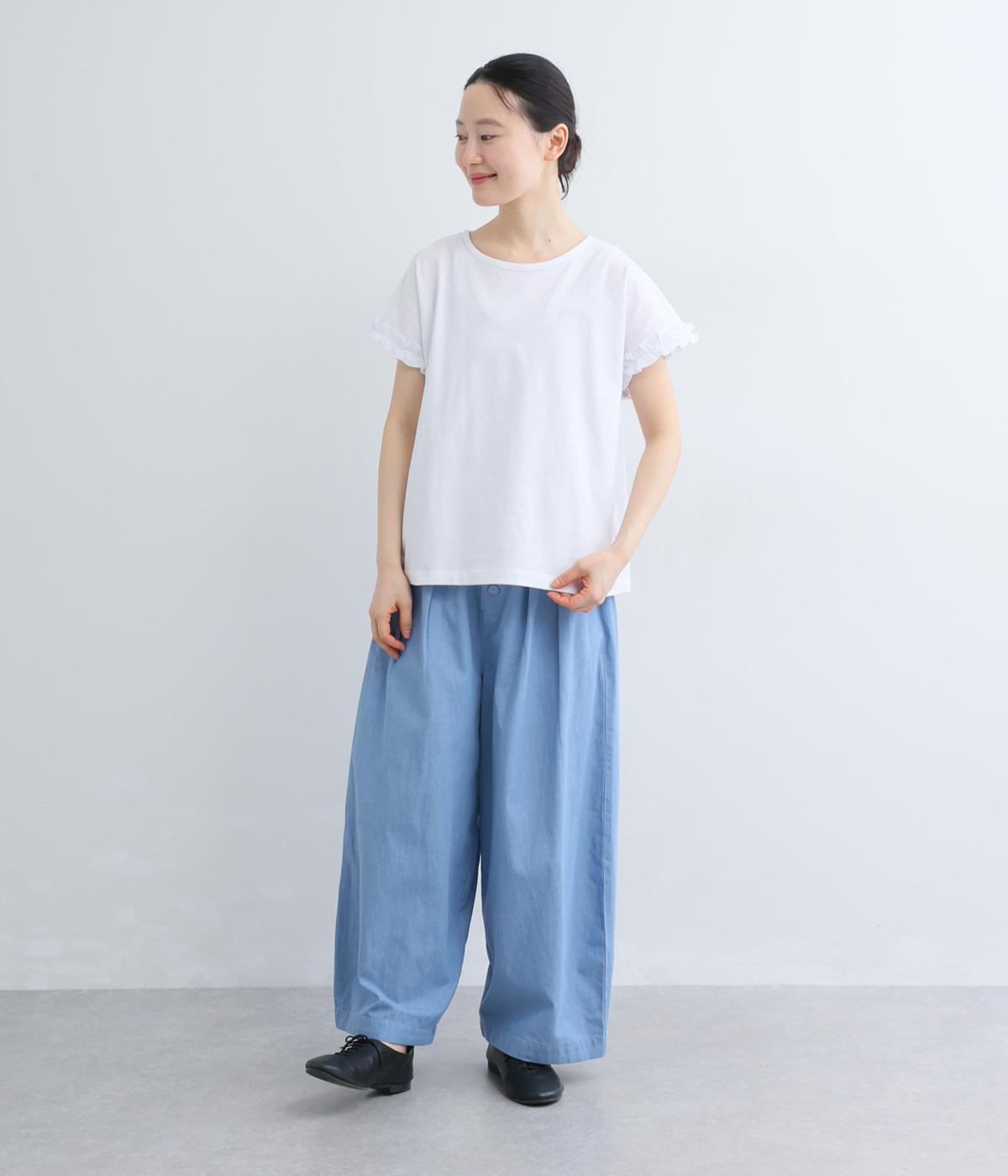 シンプルなボックス型プルオーバーに袖フリルをあしらってワンポイント設けました。フレンチスリーブのようなシルエットがフェミンンさを醸し、Tシャツよりカジュアル感をおさえた着こなしがたのしめます。