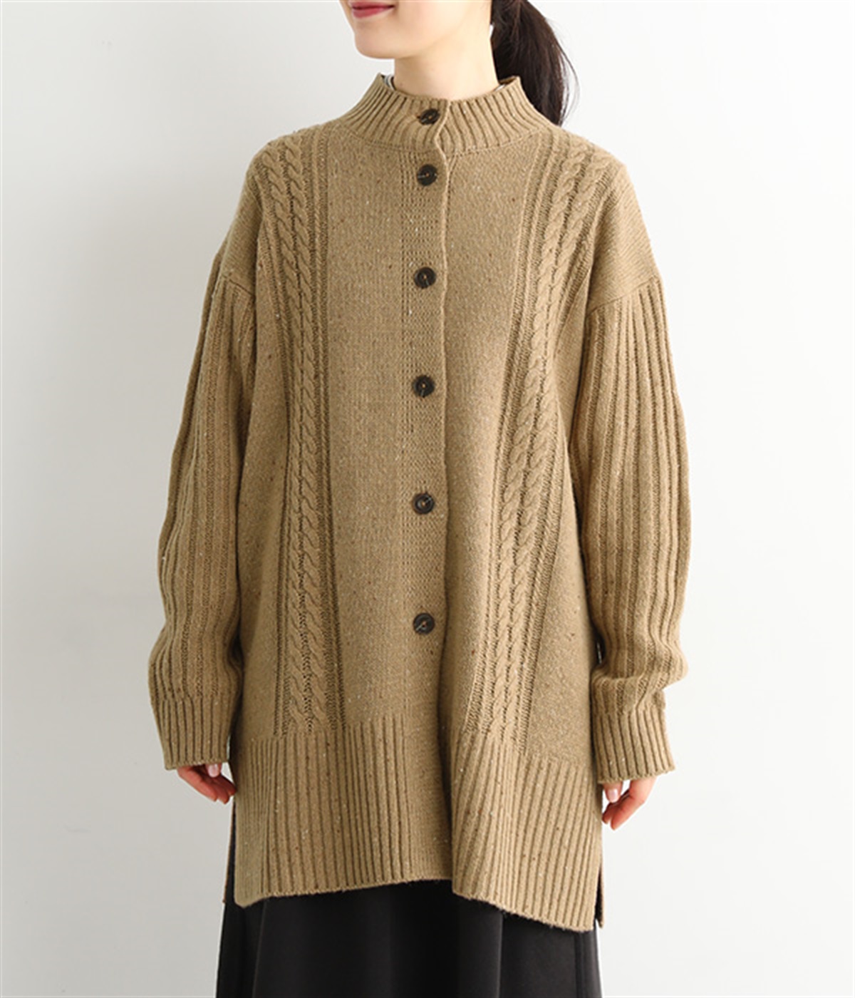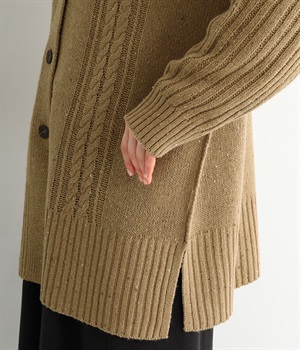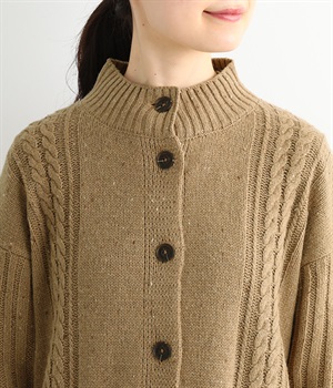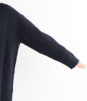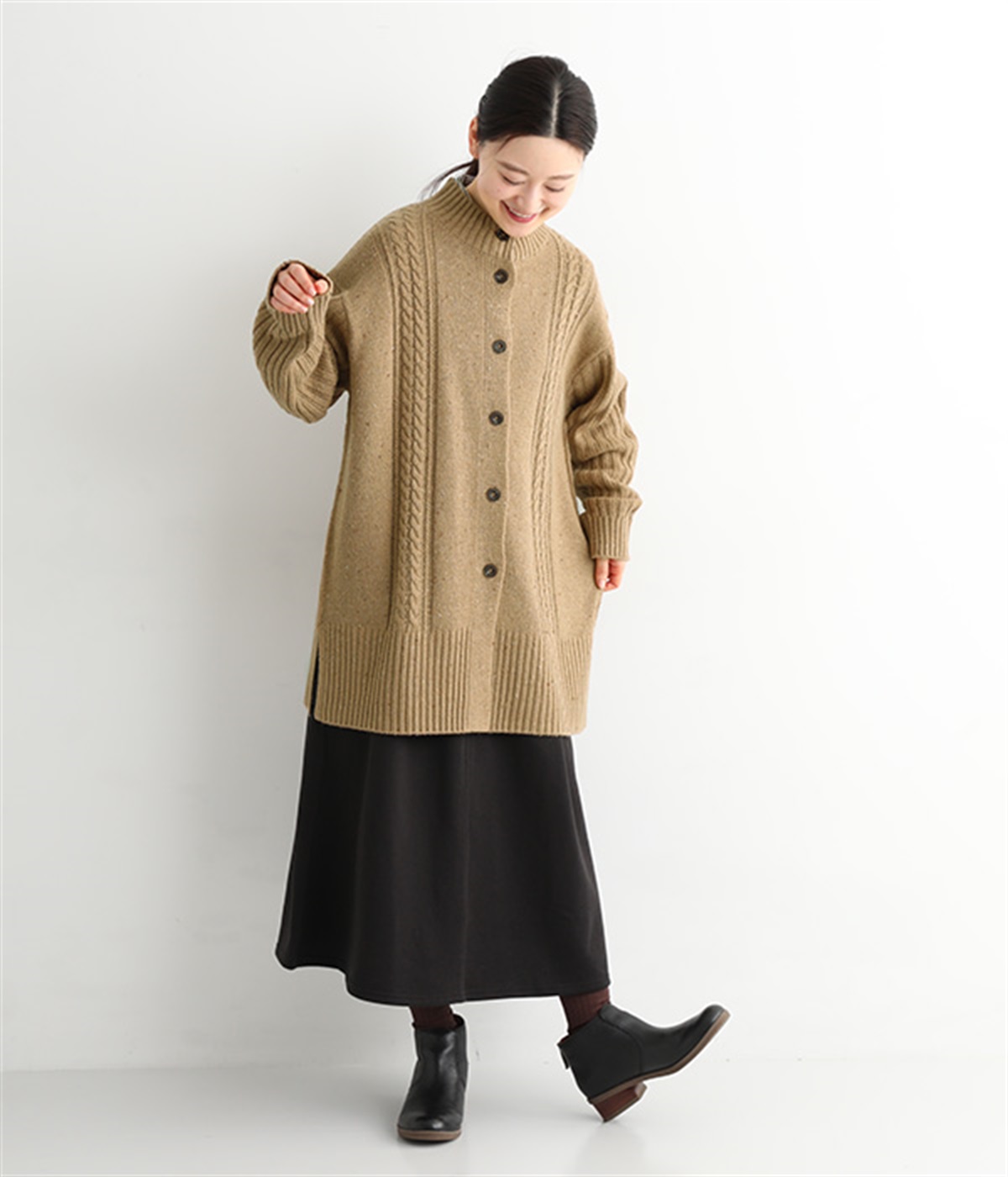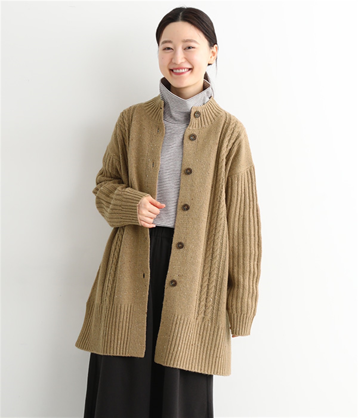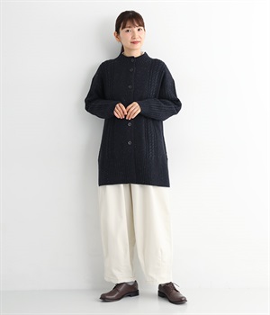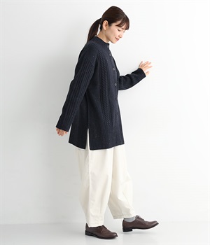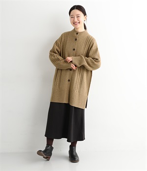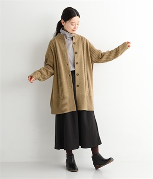 縦ラインを意識した柄編みがスタイリングをすっきり見せ