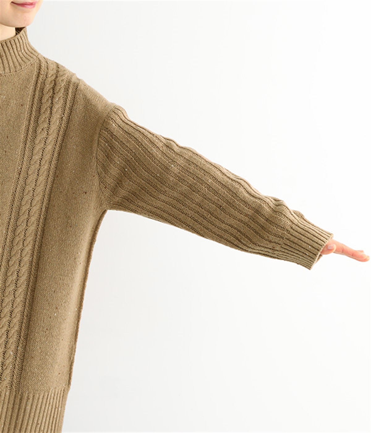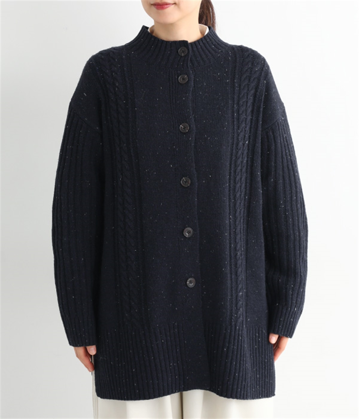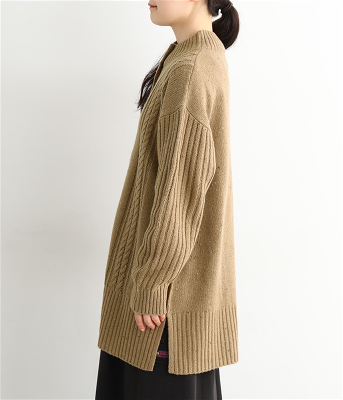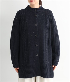 縦ラインを意識した柄編みがスタイリングをすっきり見せ